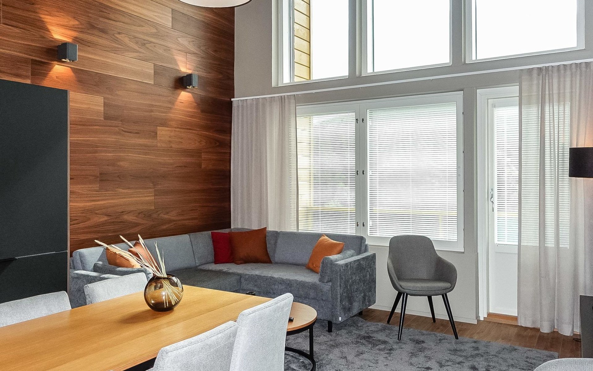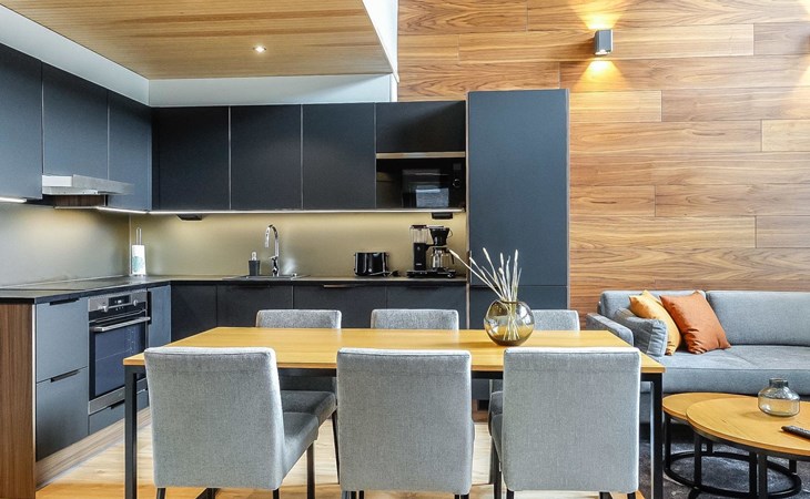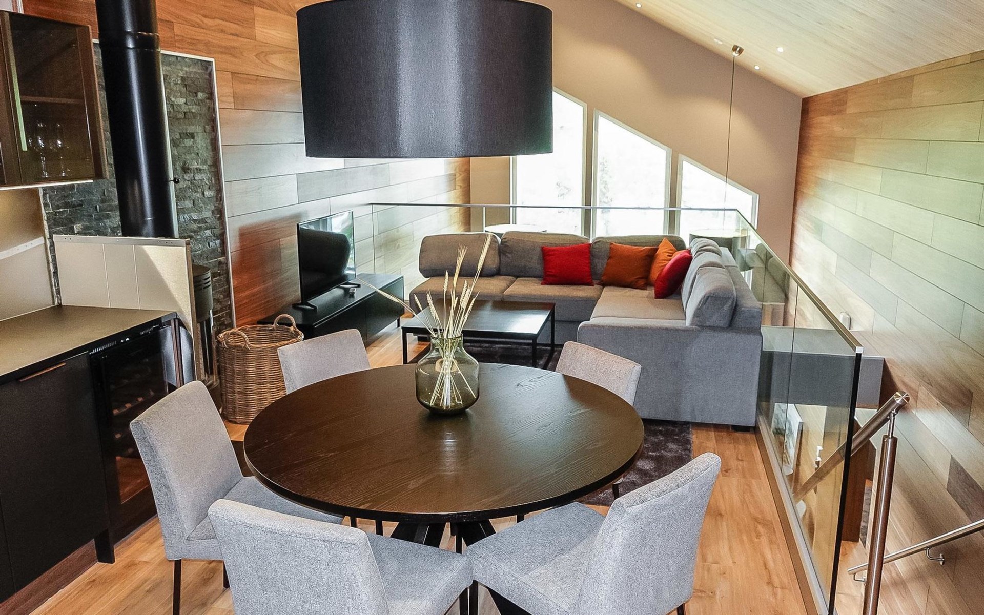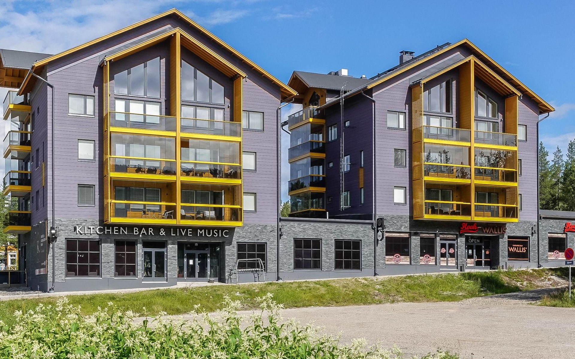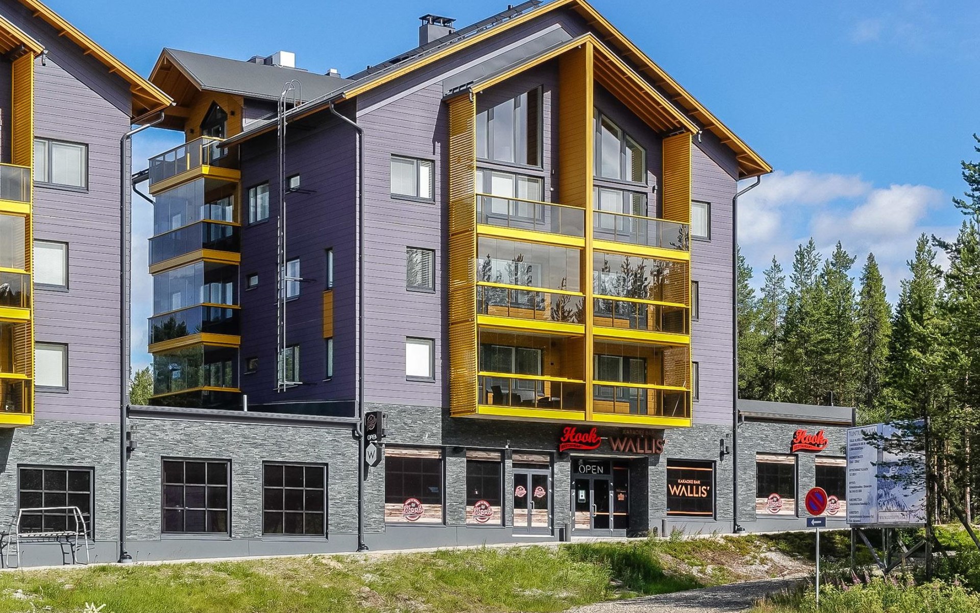 Livingroom / kitchen with aorner sofa, which can be converted into beds for 1-2 people if needed (mainly for children), three bedrooms, one with double bed and others with two single beds. One of the bedrooms is on the upper floor, access to balcony from this room. Sauna and living areas are also located on the upper floor. Upstairs living area is equipped with sofa bed, for 1-2 persons, light fireplace, kitchen with sink, fridge and cupboard. There are two WCs in the apartment, shower also in downstairs within the WC. Another is upstairs in the sauna area.
