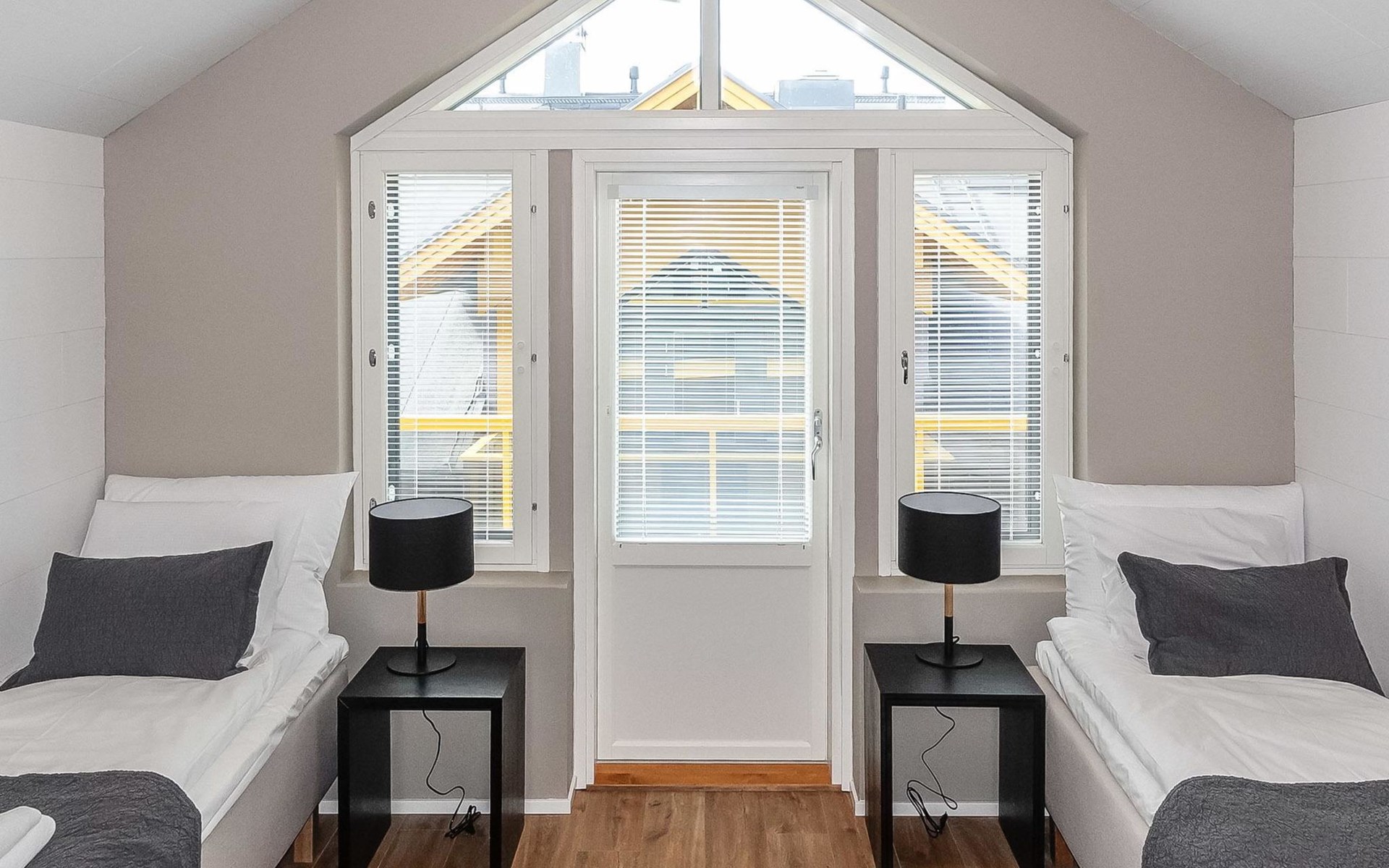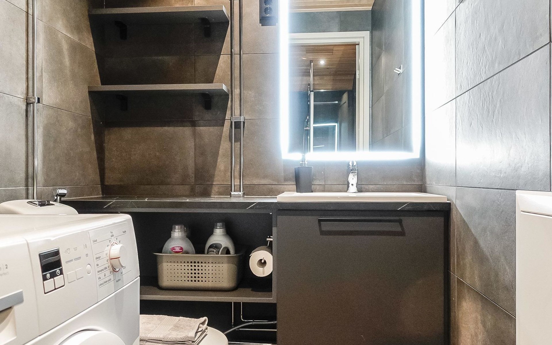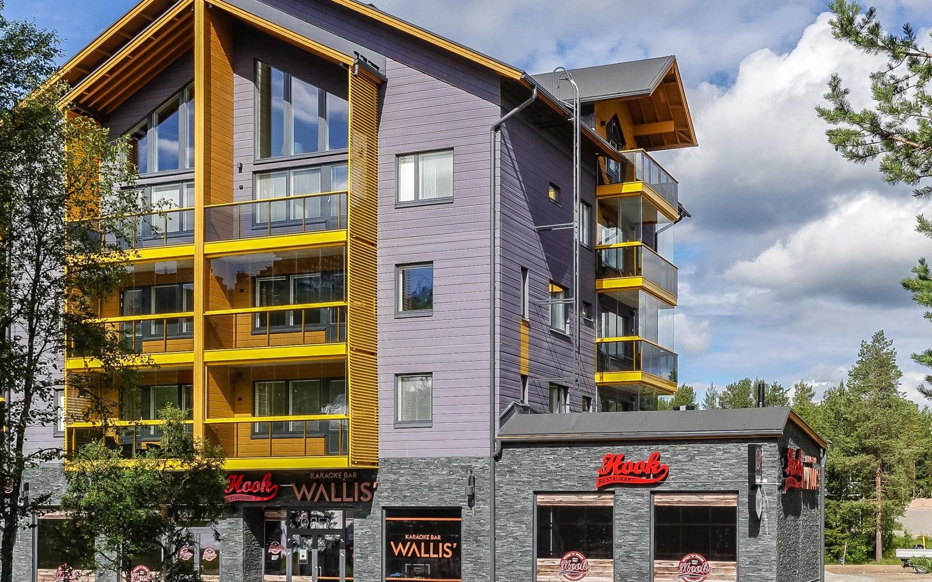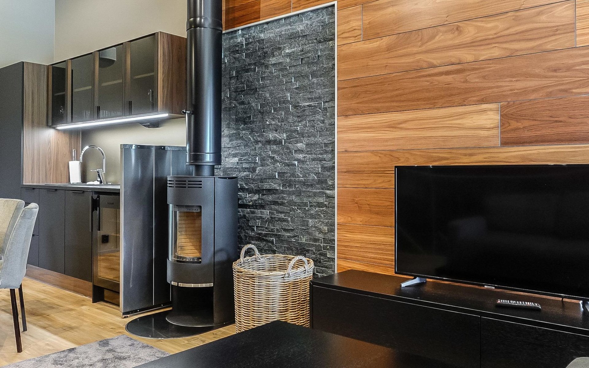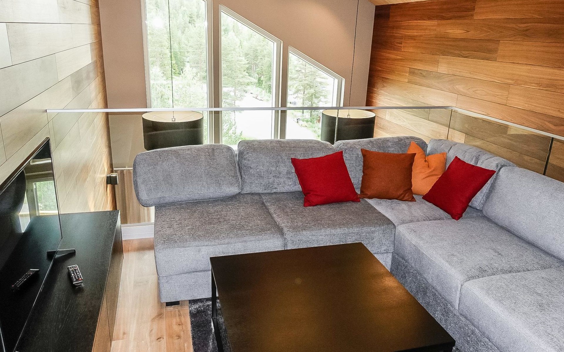 Livingroom / kitchen with aorner sofa, which can be converted into beds for 1-2 people if needed (mainly for children), three bedrooms, one with double bed and others with two single beds. One of the bedrooms is on the upper floor, access to balcony from this room. Sauna and living areas are also located on the upper floor. Upstairs living area is equipped with sofa bed, for 1-2 persons, light fireplace, kitchen with sink, fridge and cupboard. There are two WCs in the apartment, shower also in downstairs within the WC. Another is upstairs in the sauna area.