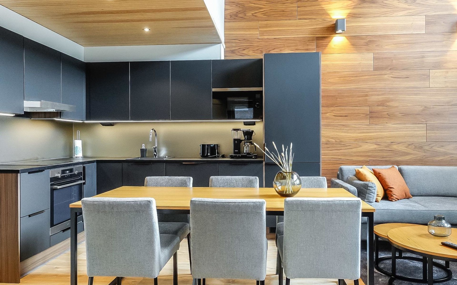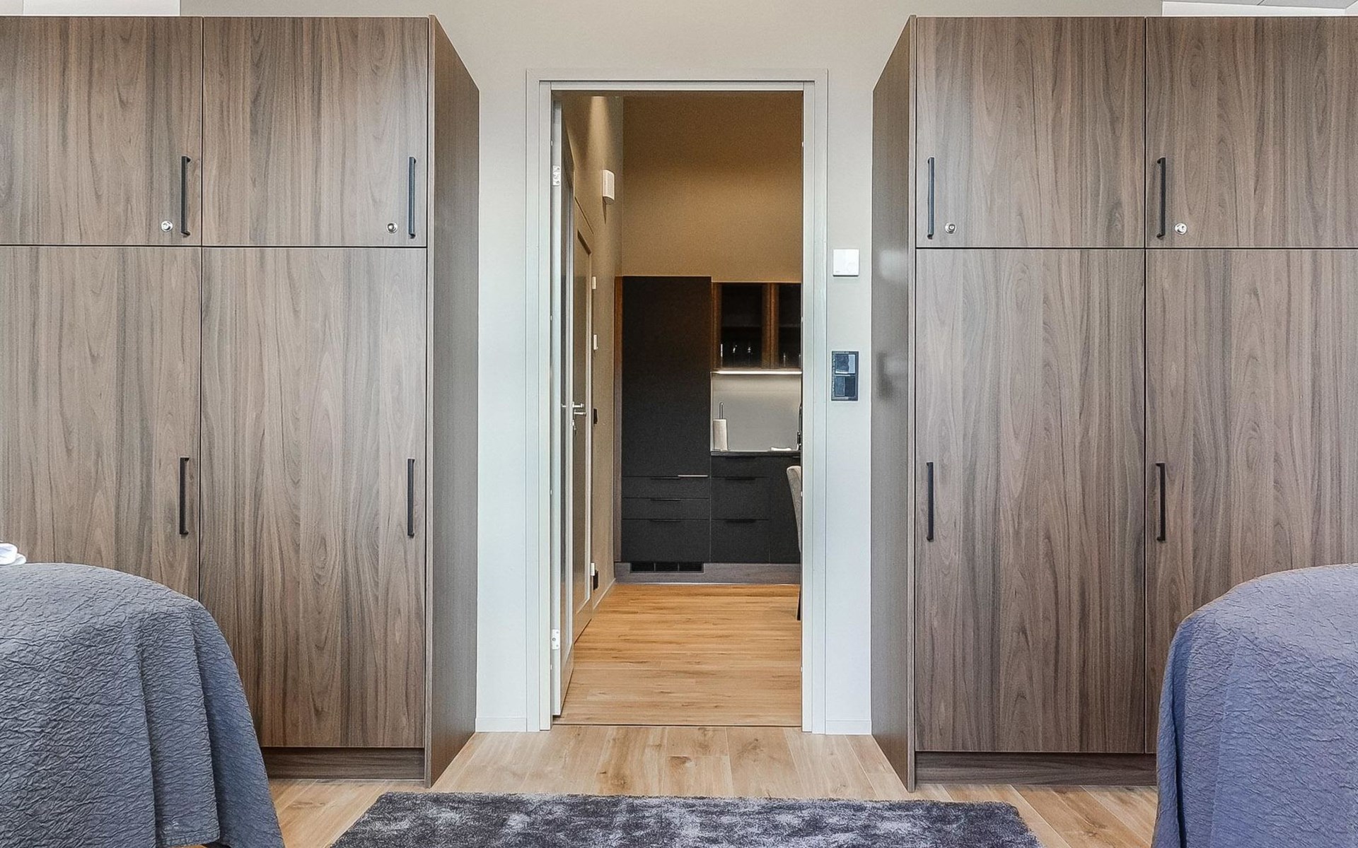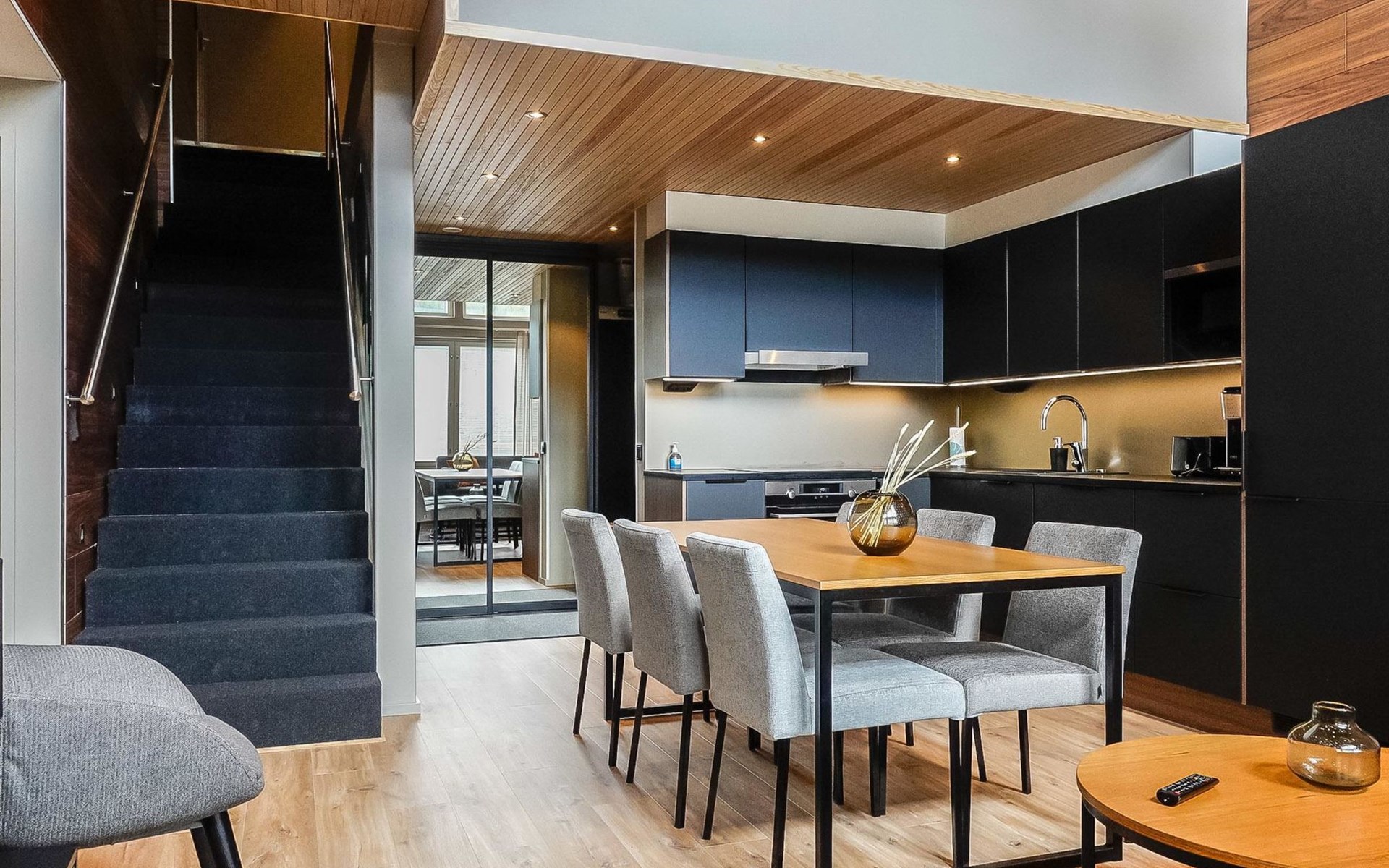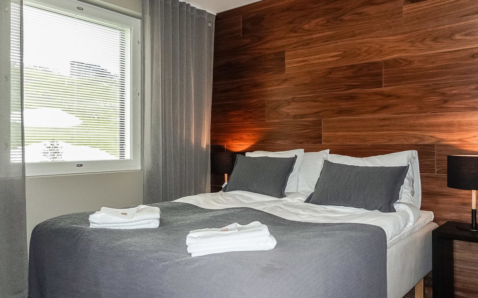 Livingroom / kitchen with aorner sofa, which can be converted into beds for 1-2 people if needed (mainly for children), three bedrooms, one with double bed and others with two single beds. One of the bedrooms is on the upper floor, access to balcony from this room. Sauna and living areas are also located on the upper floor. Upstairs living area is equipped with sofa bed, for 1-2 persons, light fireplace, kitchen with sink, fridge and cupboard. There are two WCs in the apartment, shower also in downstairs within the WC. Another is upstairs in the sauna area.