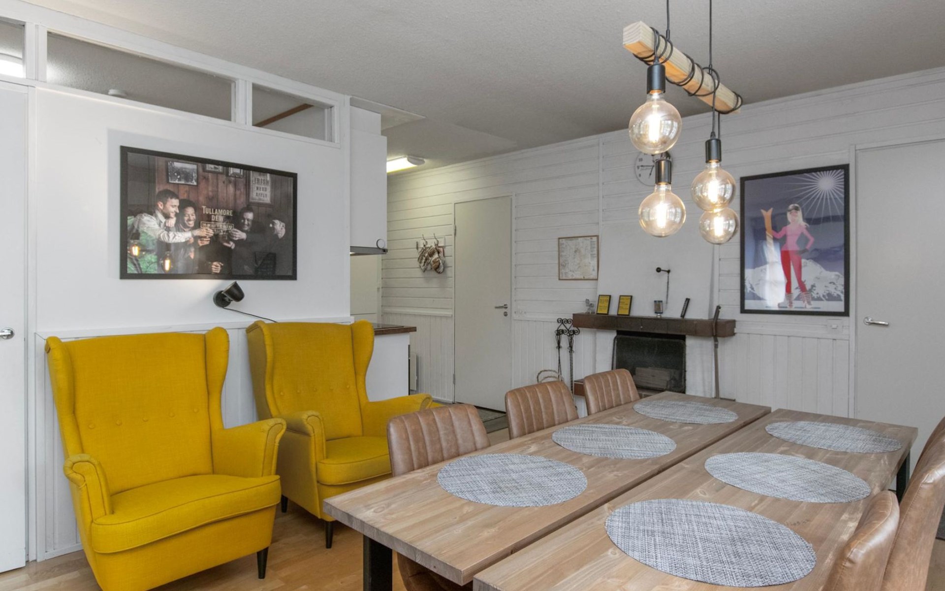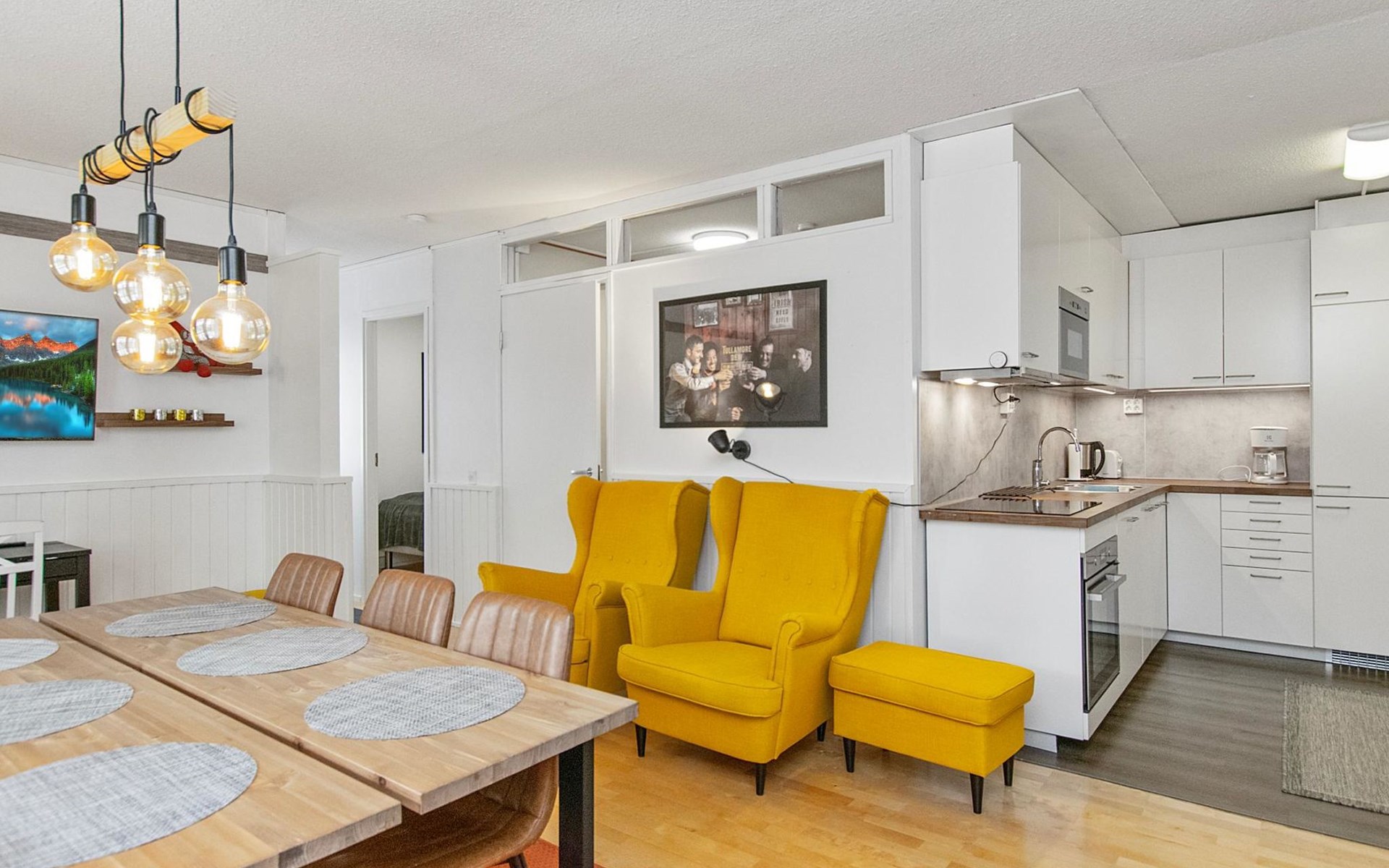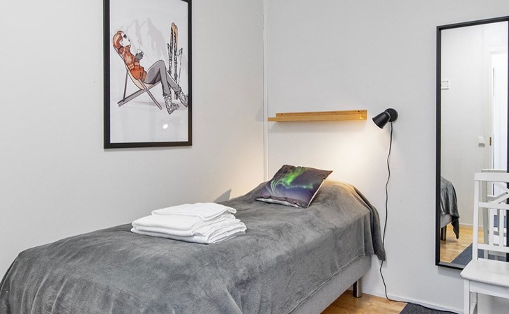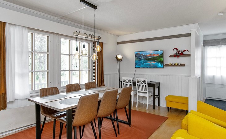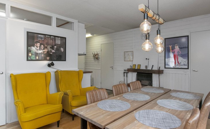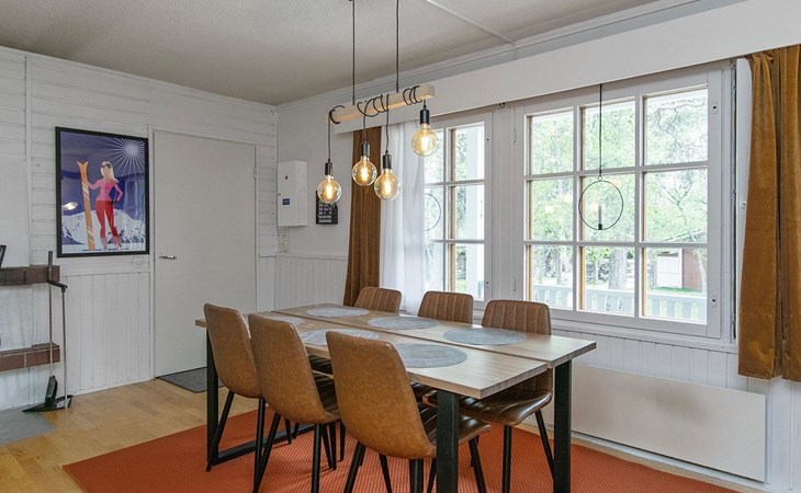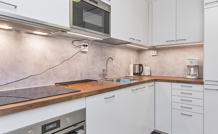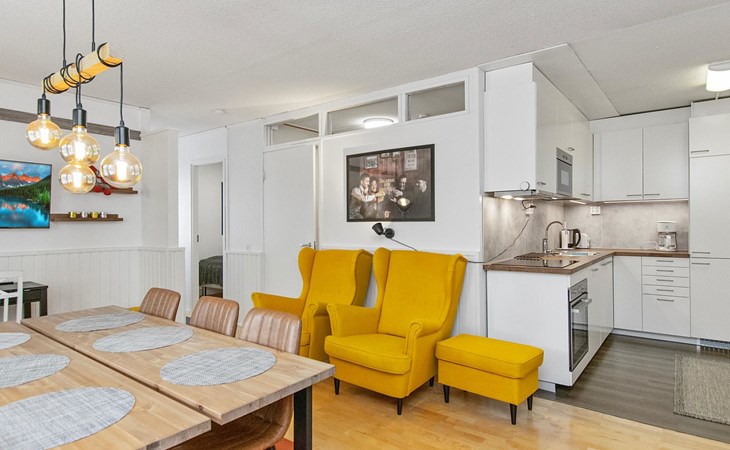 The kitchenette has its own corner with all the necessary utensils and equipment for cooking. The fireplace in the living room creates a cosy atmosphere for socialising and gathering. The apartment has its own terrace.