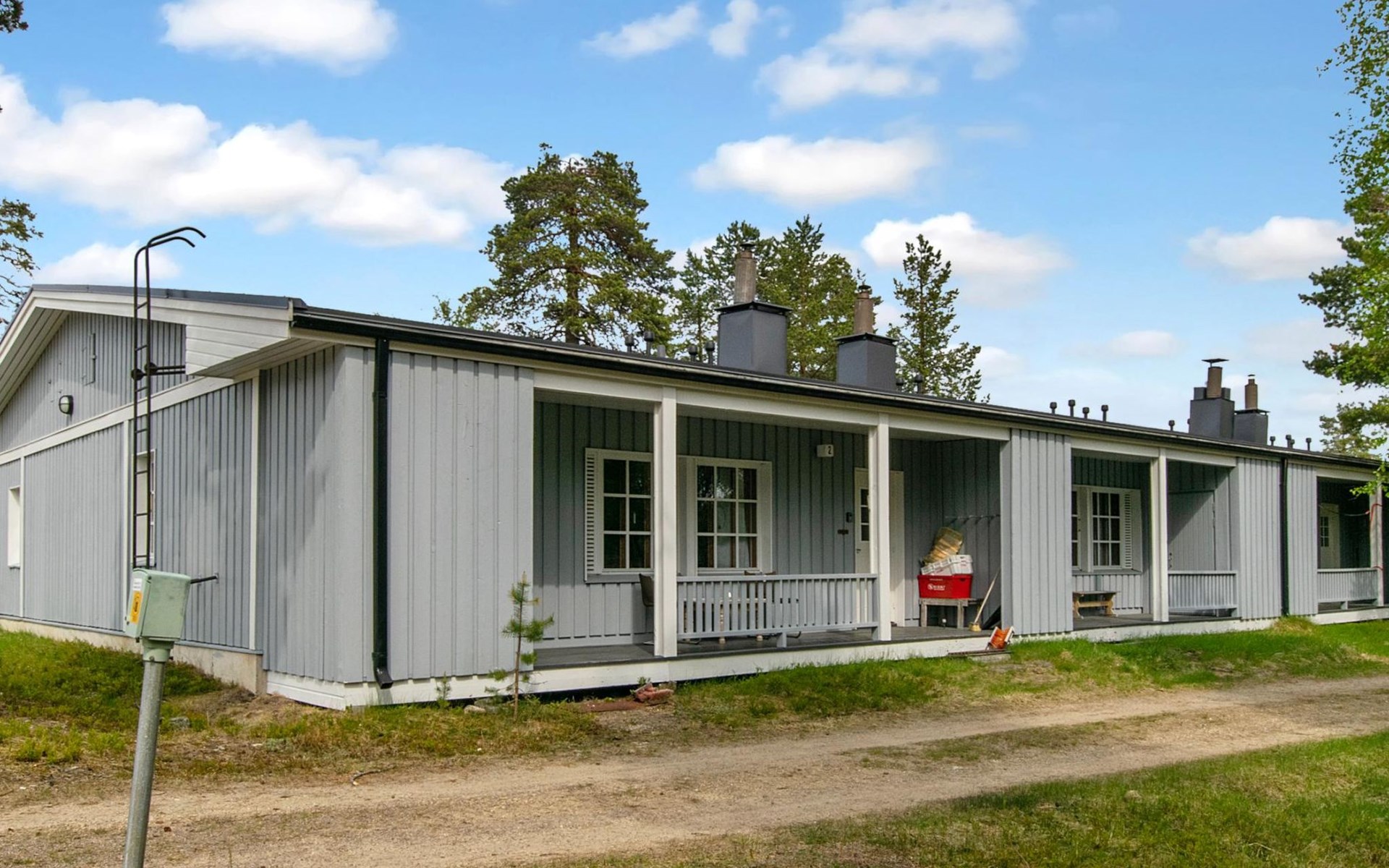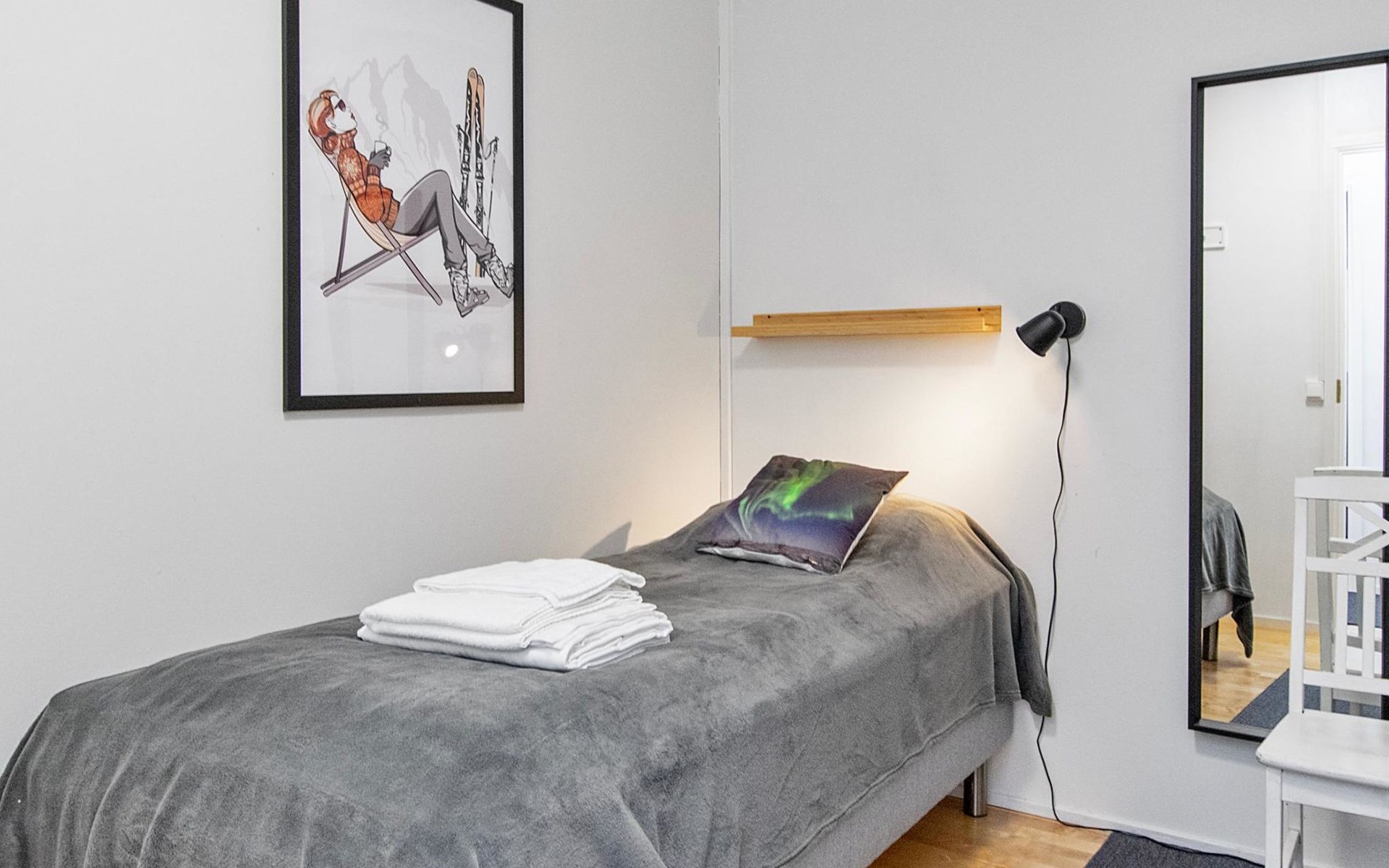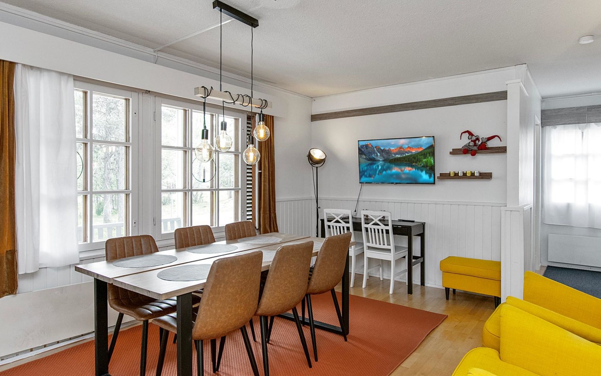 The kitchenette has its own corner with all the necessary utensils and equipment for cooking. The fireplace in the living room creates a cosy atmosphere for socialising and gathering. The apartment has its own terrace.