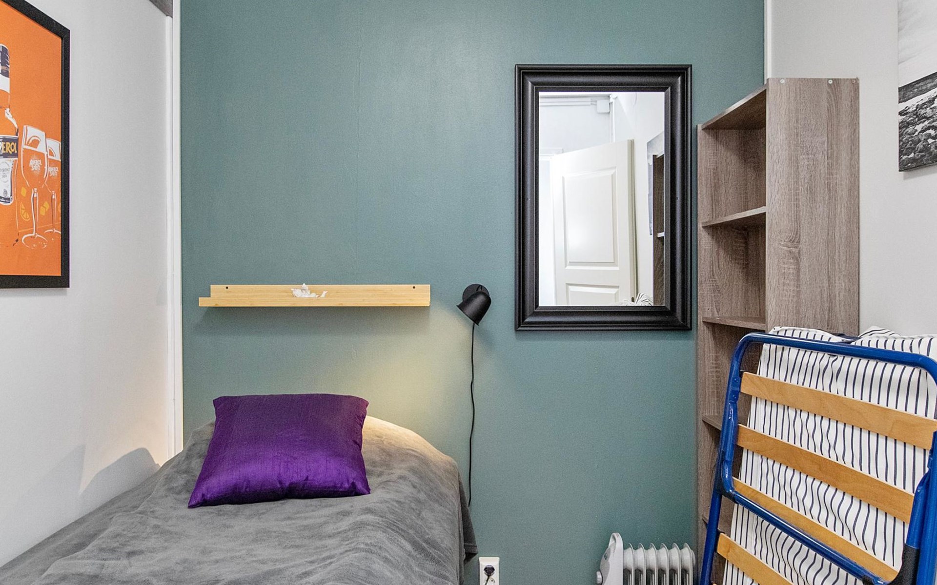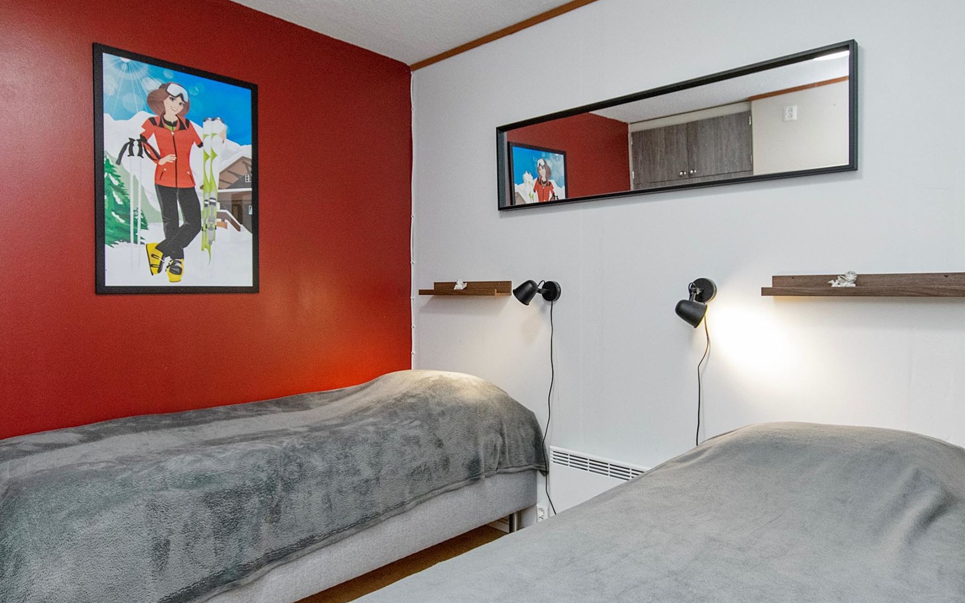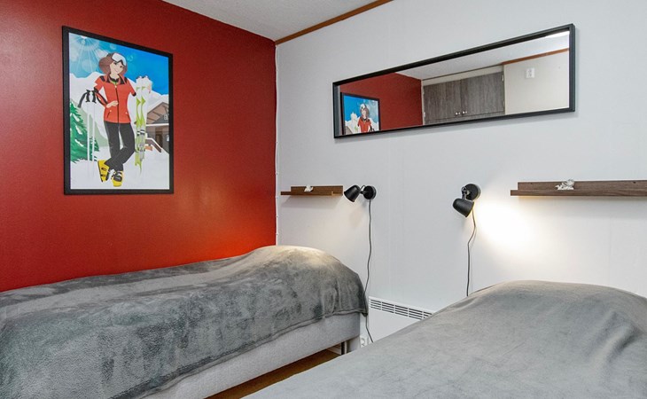 The windowless bedroom has two single beds. The two alcoves each have a single bed, and a spare bed provides an extra sleeping place.