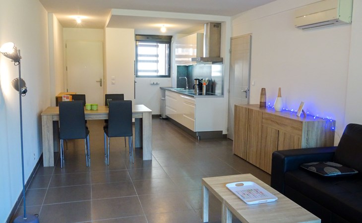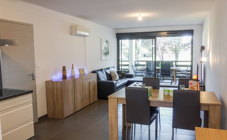 Moderne residentie "Le Golf Clair", van 2 verdiepingen. In de wijk Golf, 1.6 km van zee, 1.6 km van het strand, aan de golfbaan. Voor medegebruik: openluchtzwembad hoekig omheind (10 x 8 m, 150 cm diepte, seizoensgebonden beschikbaarheid: 01.Jul. - 31.Aug.). In het complex: lift. Winkel 2.2 km, supermarkt 2.5 km, restaurant 200 m, bushalte 1.8 km, station "Elne" 8.4 km, zandstrand "Plage Nord, plage de l'Art" 1.6 km. Jachthaven 3.7 km, golfterrein (27 holes) 200 m, zeilschool 5.5 km, midgetgolf 1.5 km, manege 4.5 km, sportcentrum 6 km. Attracties in de buurt: Saint Cyprien Golf Resort 200 m, Aqualand 7 km.