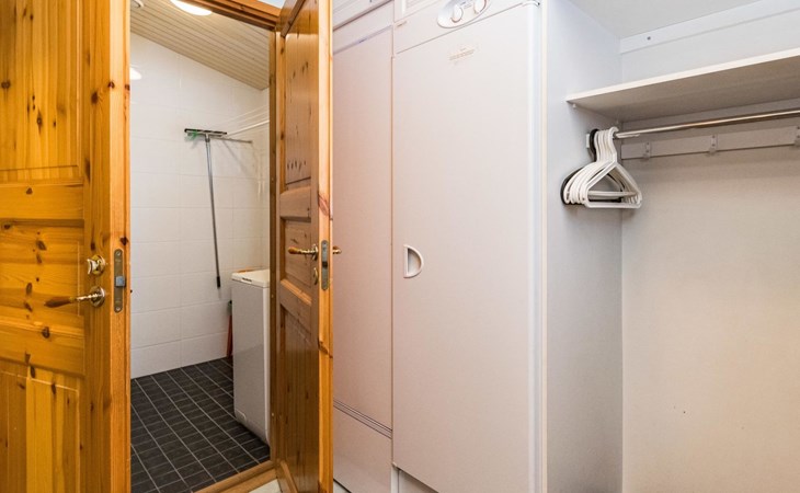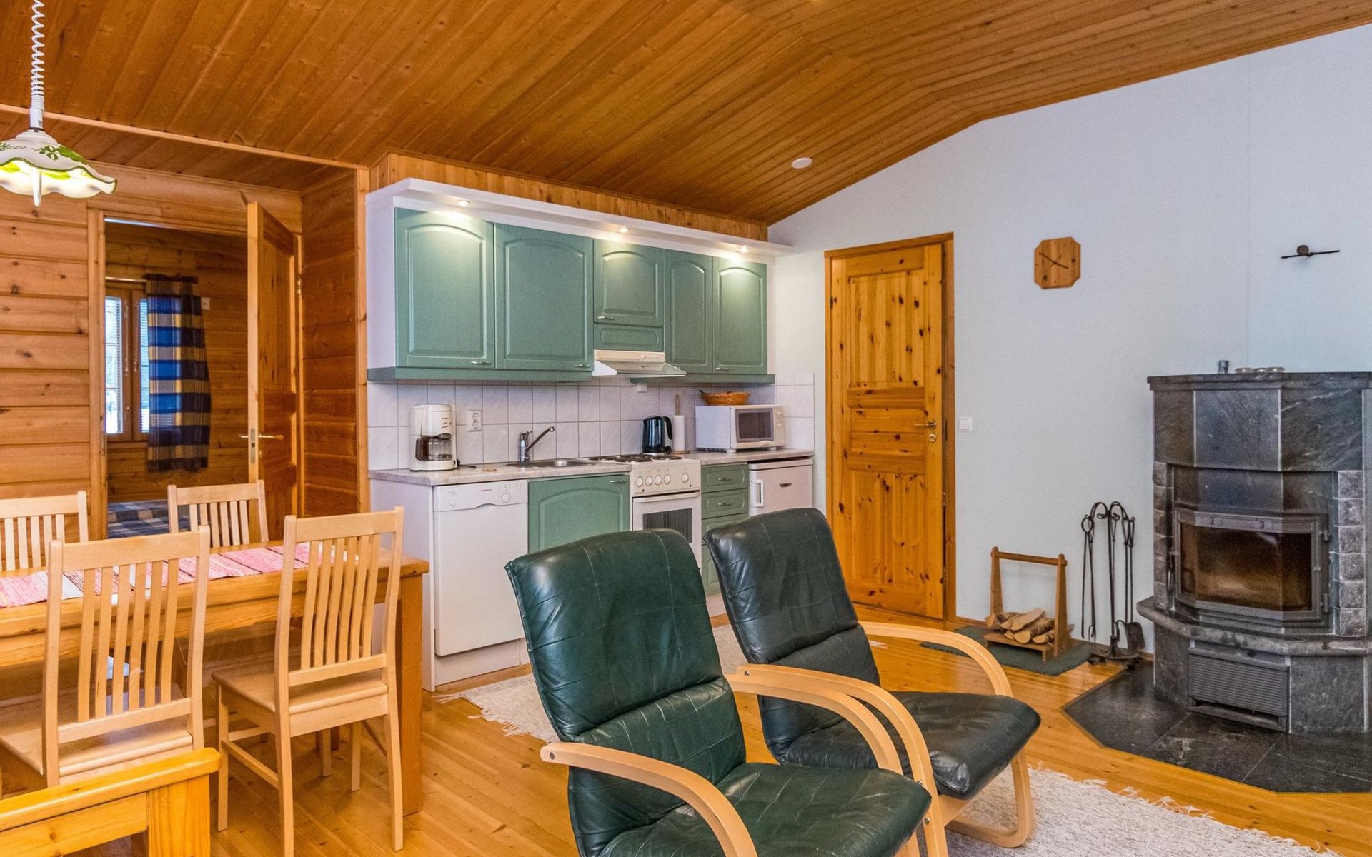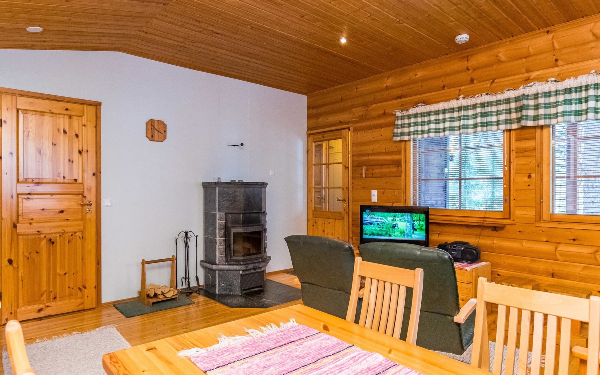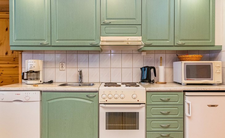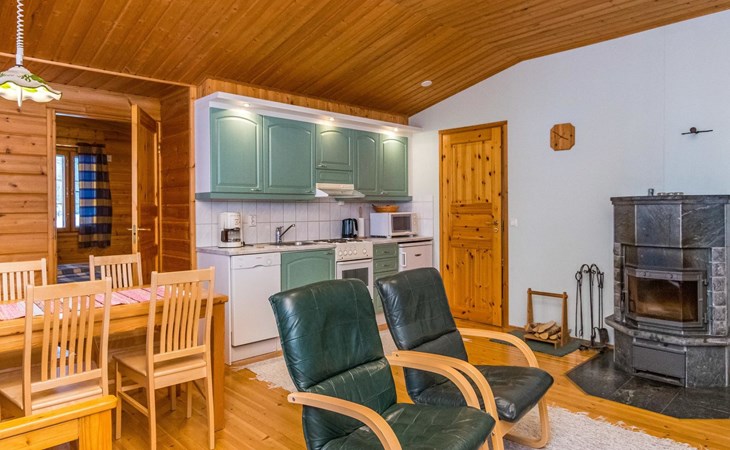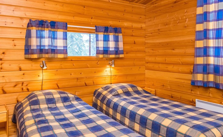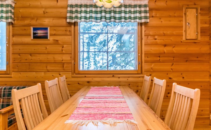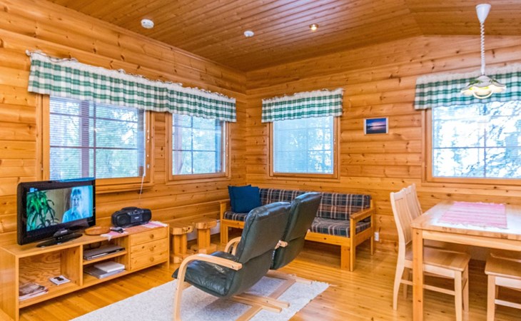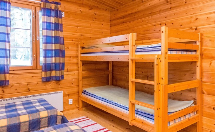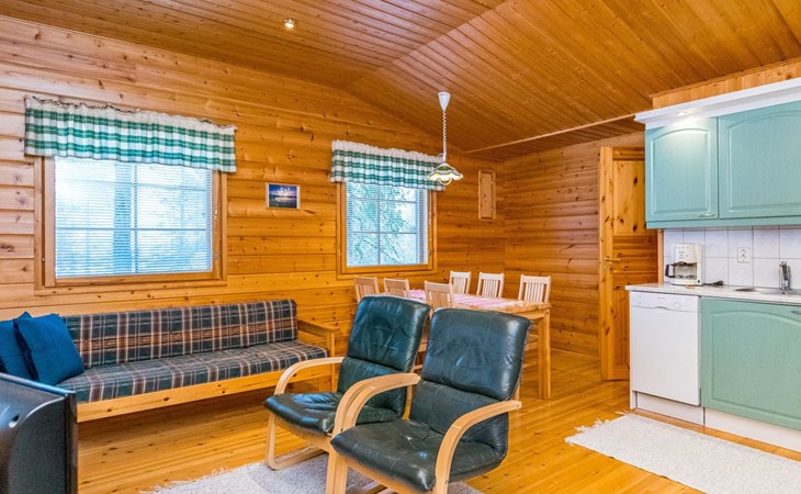 Log cottage, built in 1997 (extension and renovation made in 2005, sauna and washroom renovated 2020), bedroom 1: double bed, bedroom 2: 2 beds, 1 bunk bed (loft): 2 beds. Combined kitchen and living room, electric sauna.