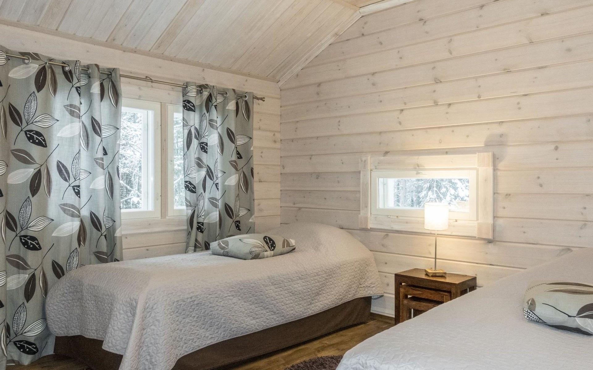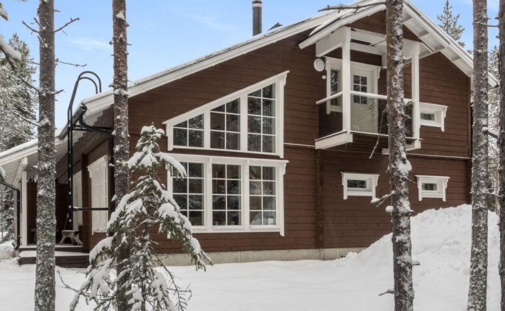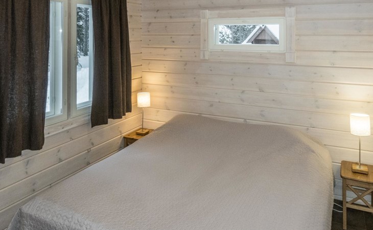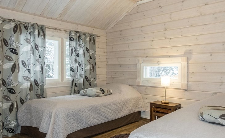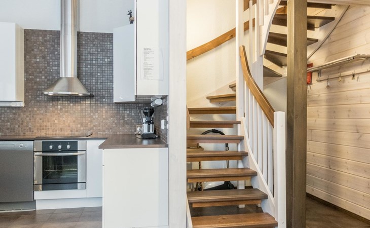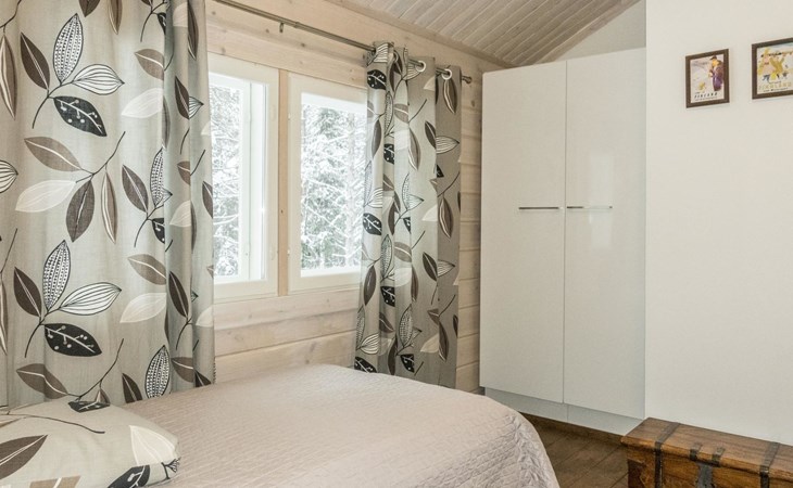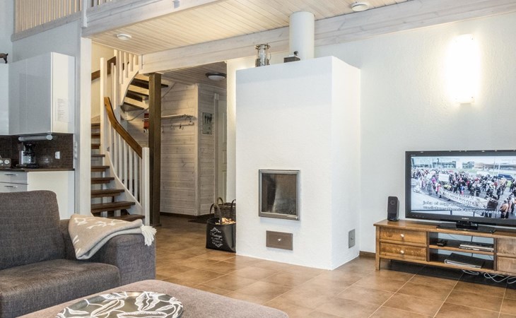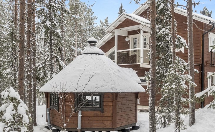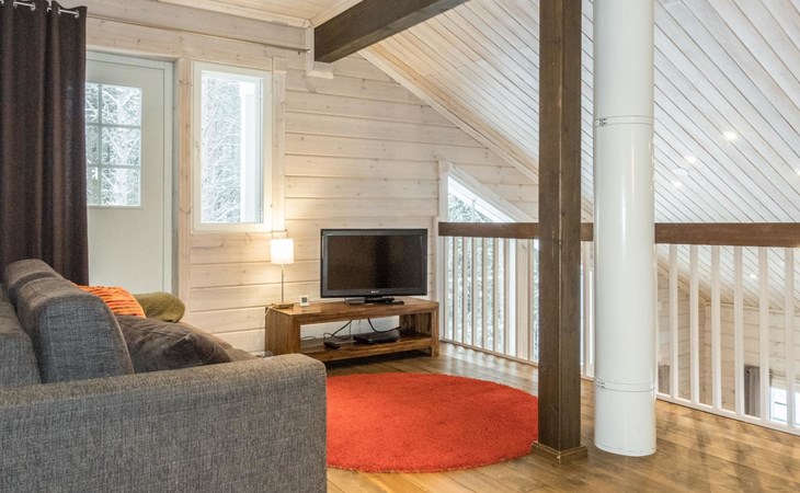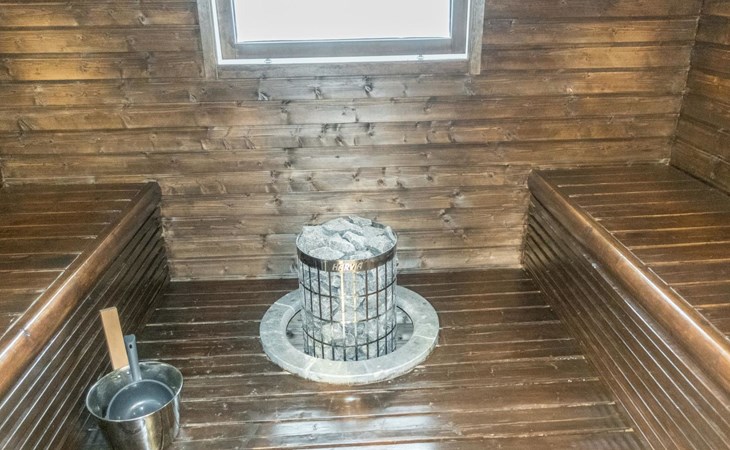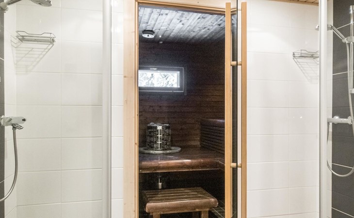 Downstairs: living room/kitchen, bedroom 2 beds, sauna (electric stove), washroom (2 showers), utility room, WC and open porch.