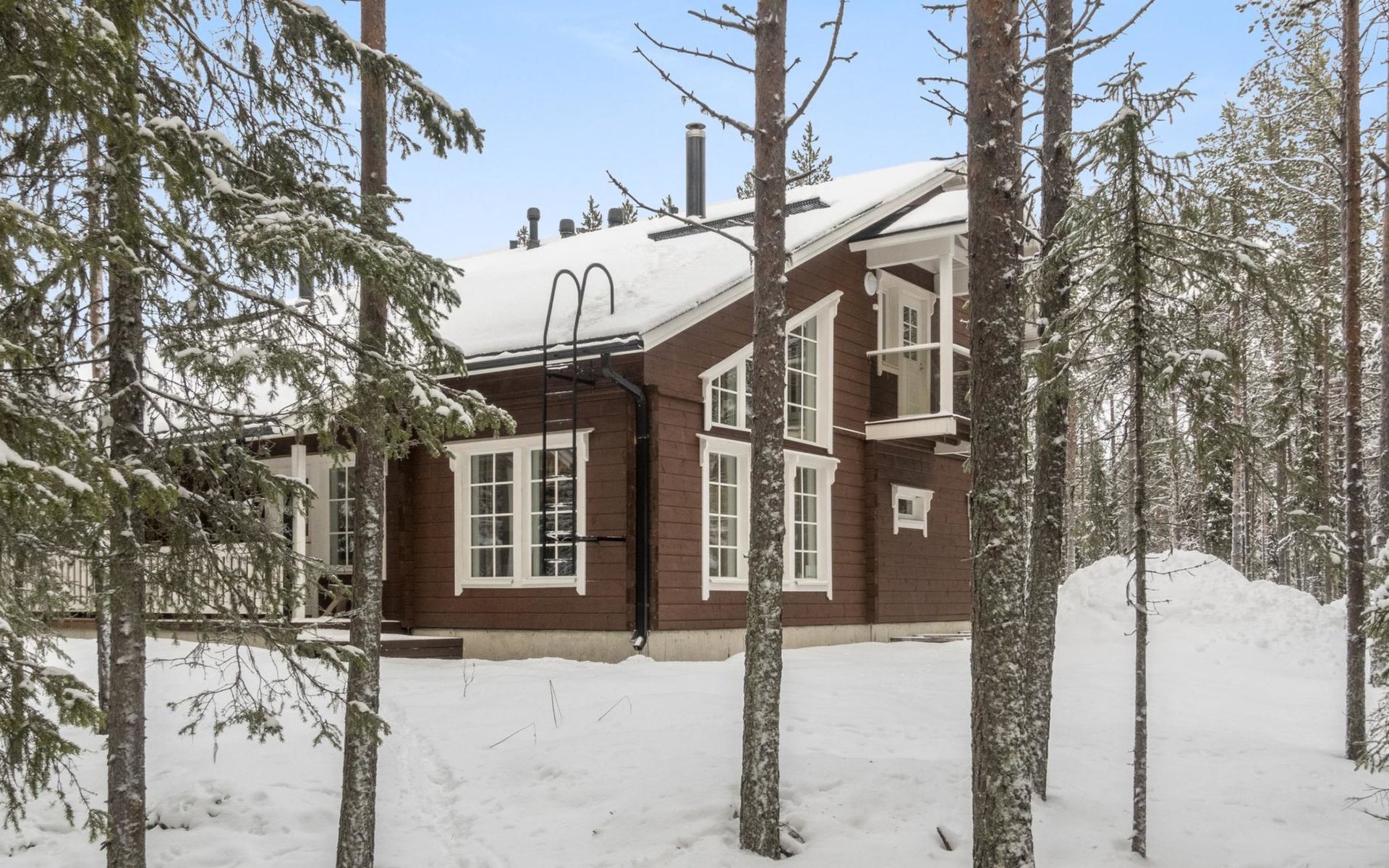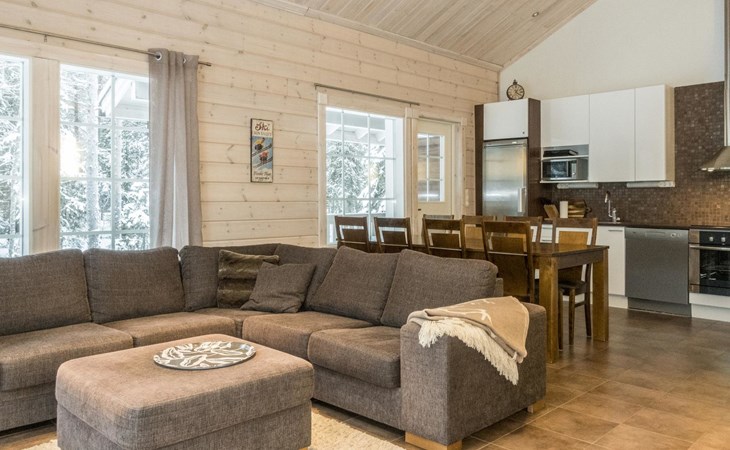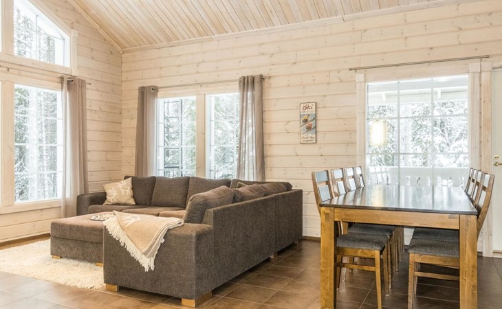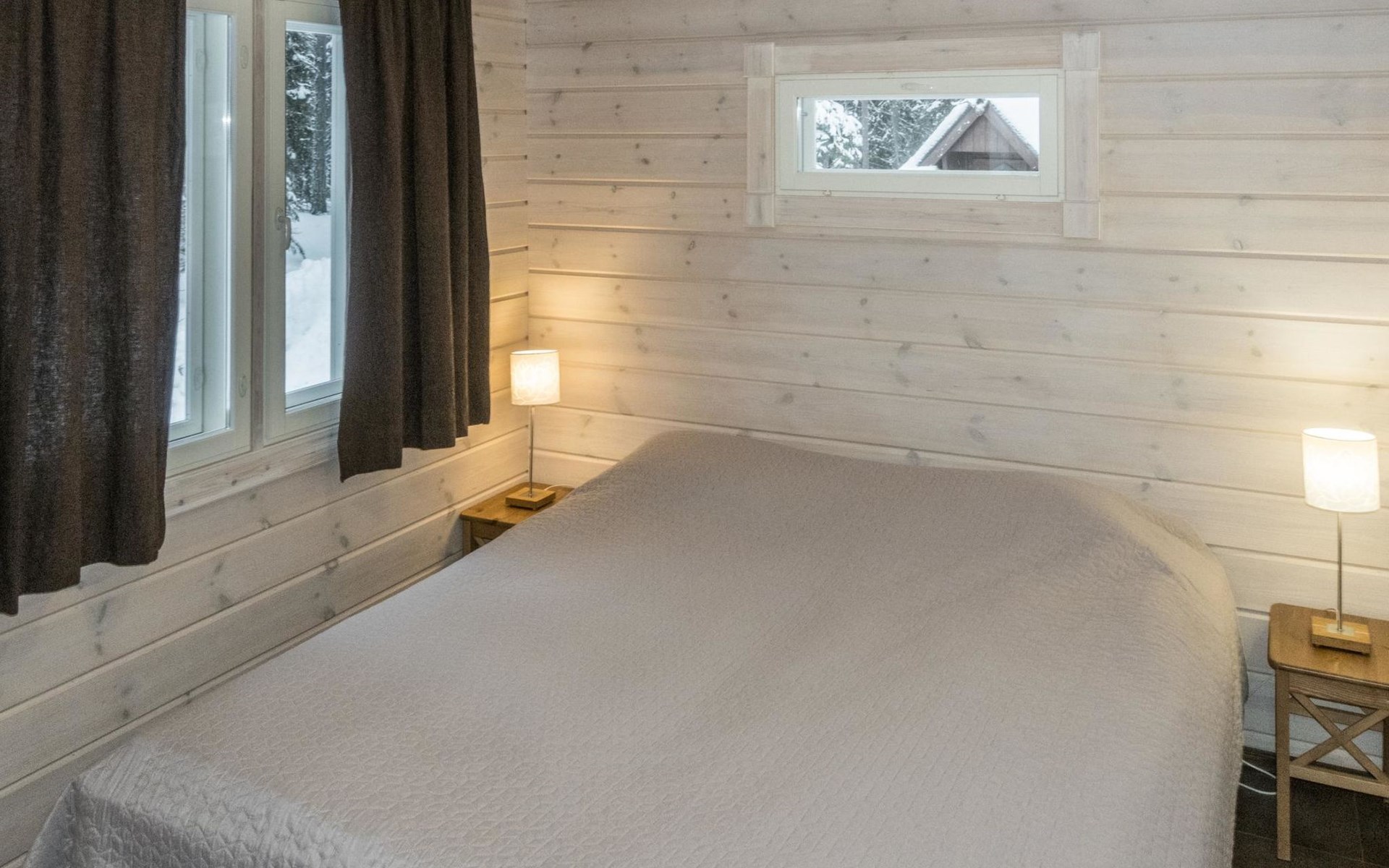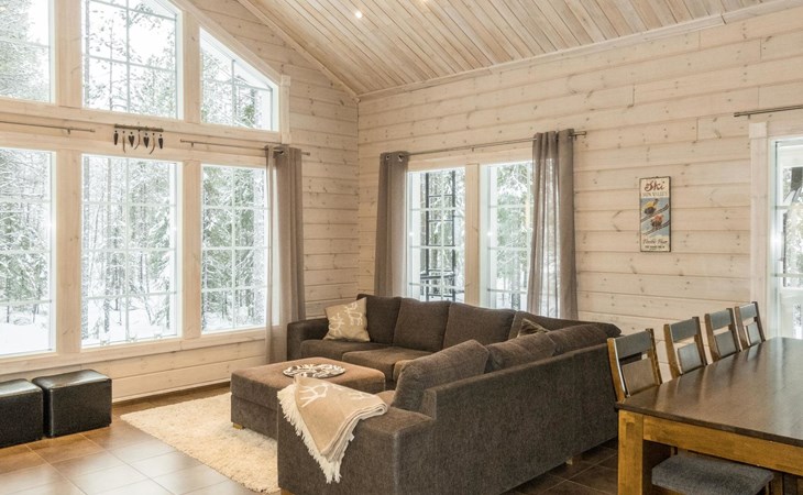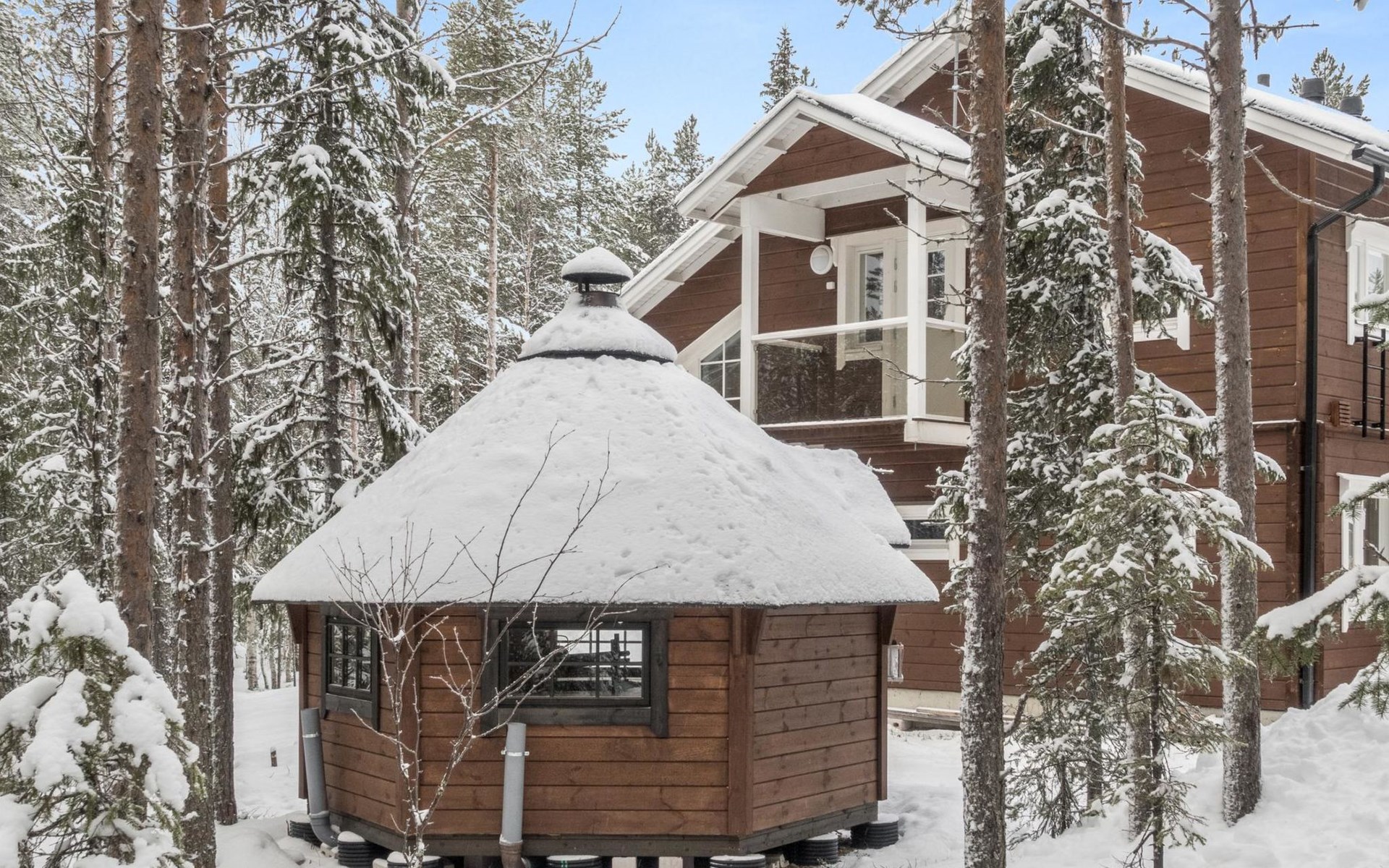 Downstairs: living room/kitchen, bedroom 2 beds, sauna (electric stove), washroom (2 showers), utility room, WC and open porch.
