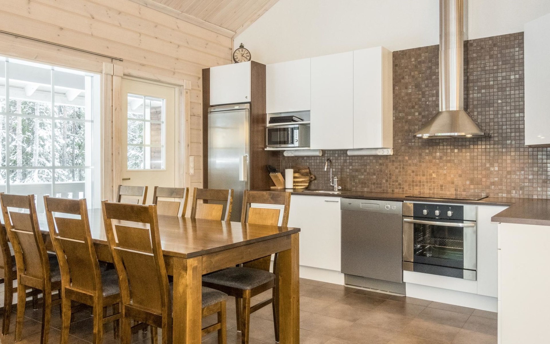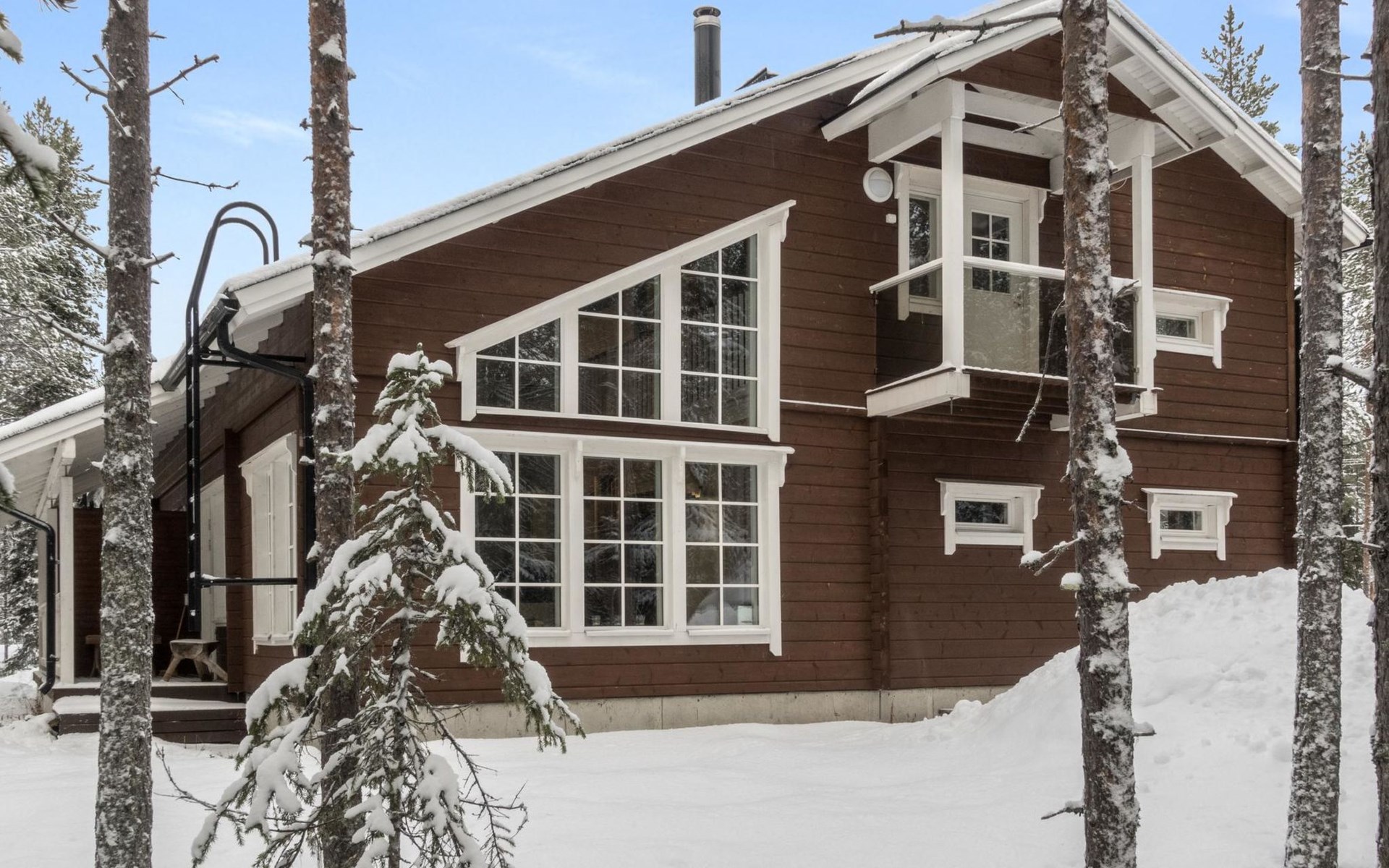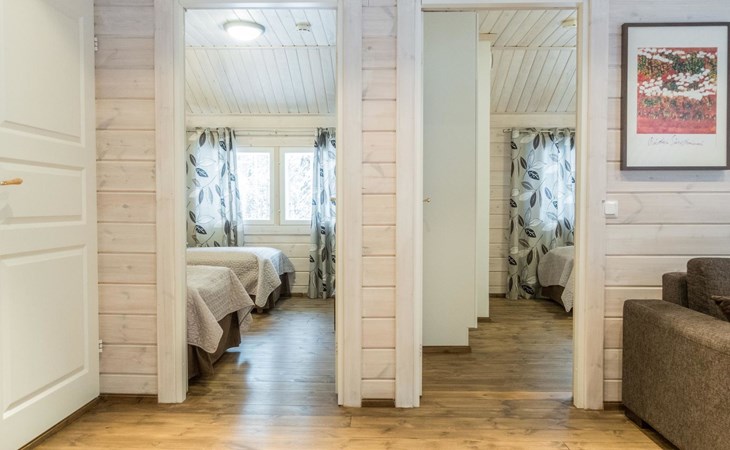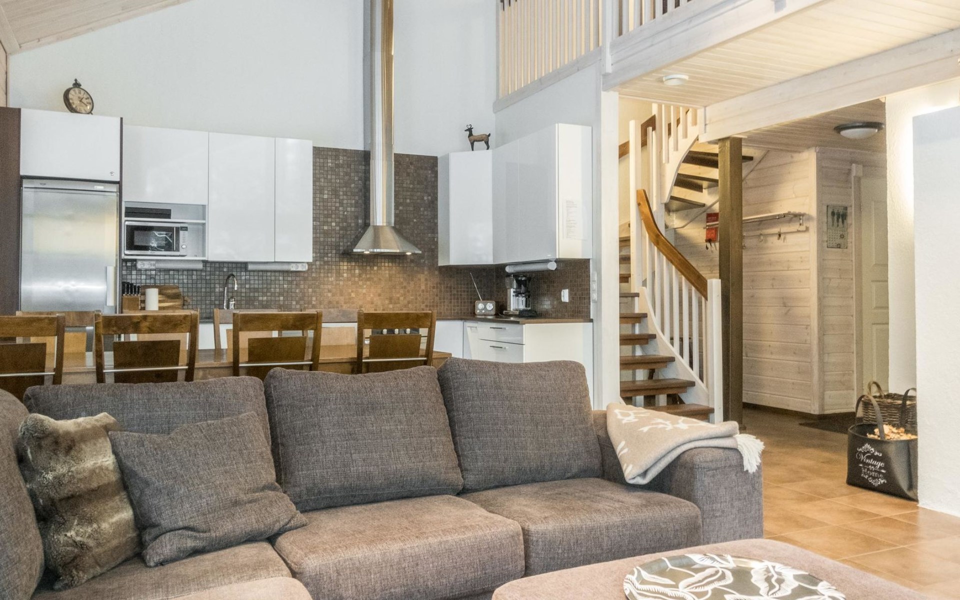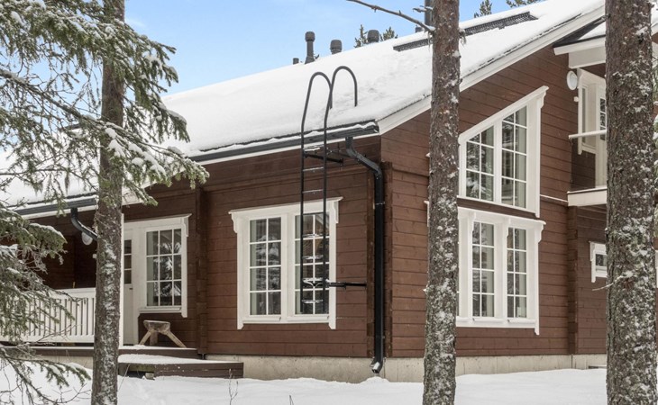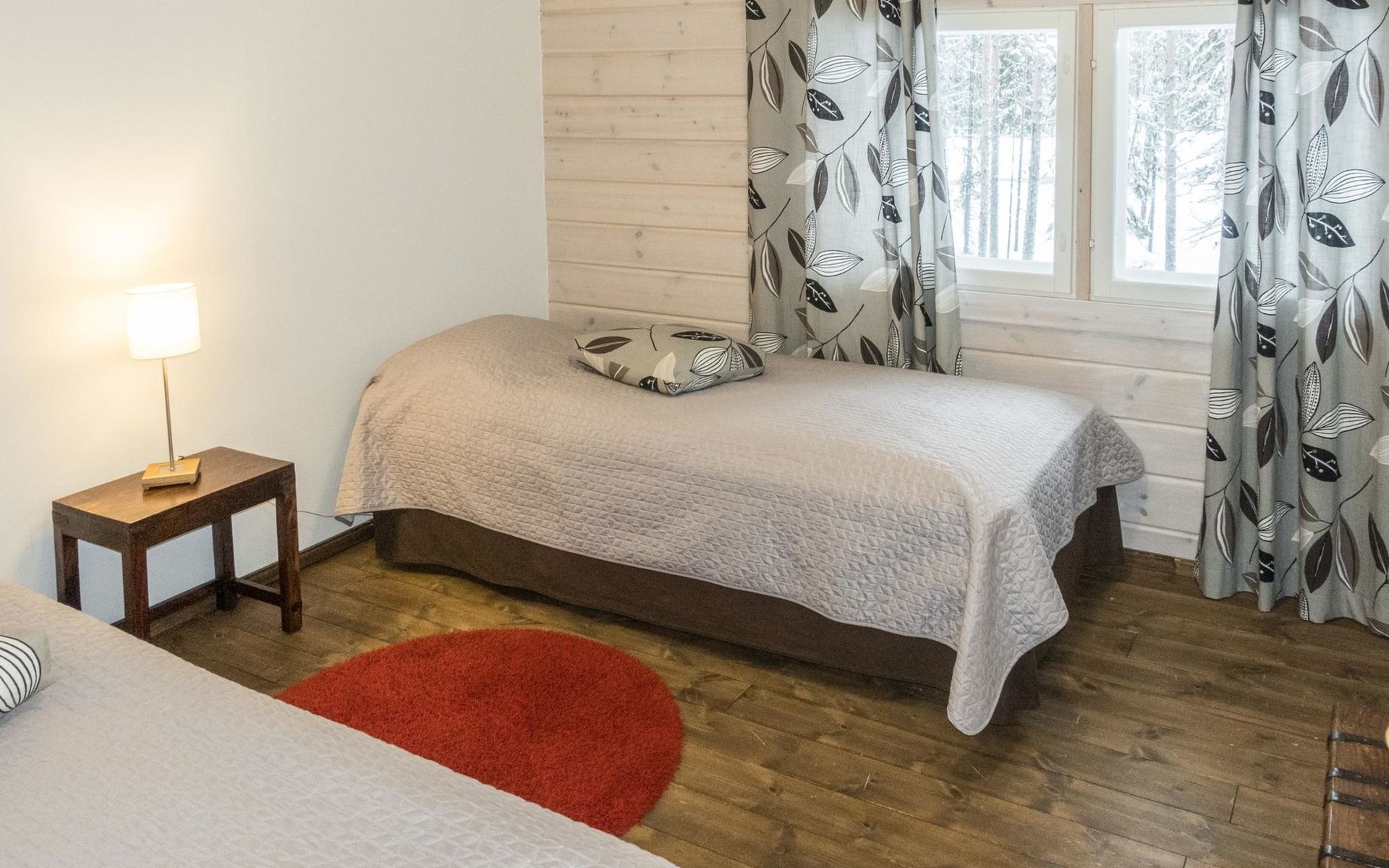 Downstairs: living room/kitchen, bedroom 2 beds, sauna (electric stove), washroom (2 showers), utility room, WC and open porch.