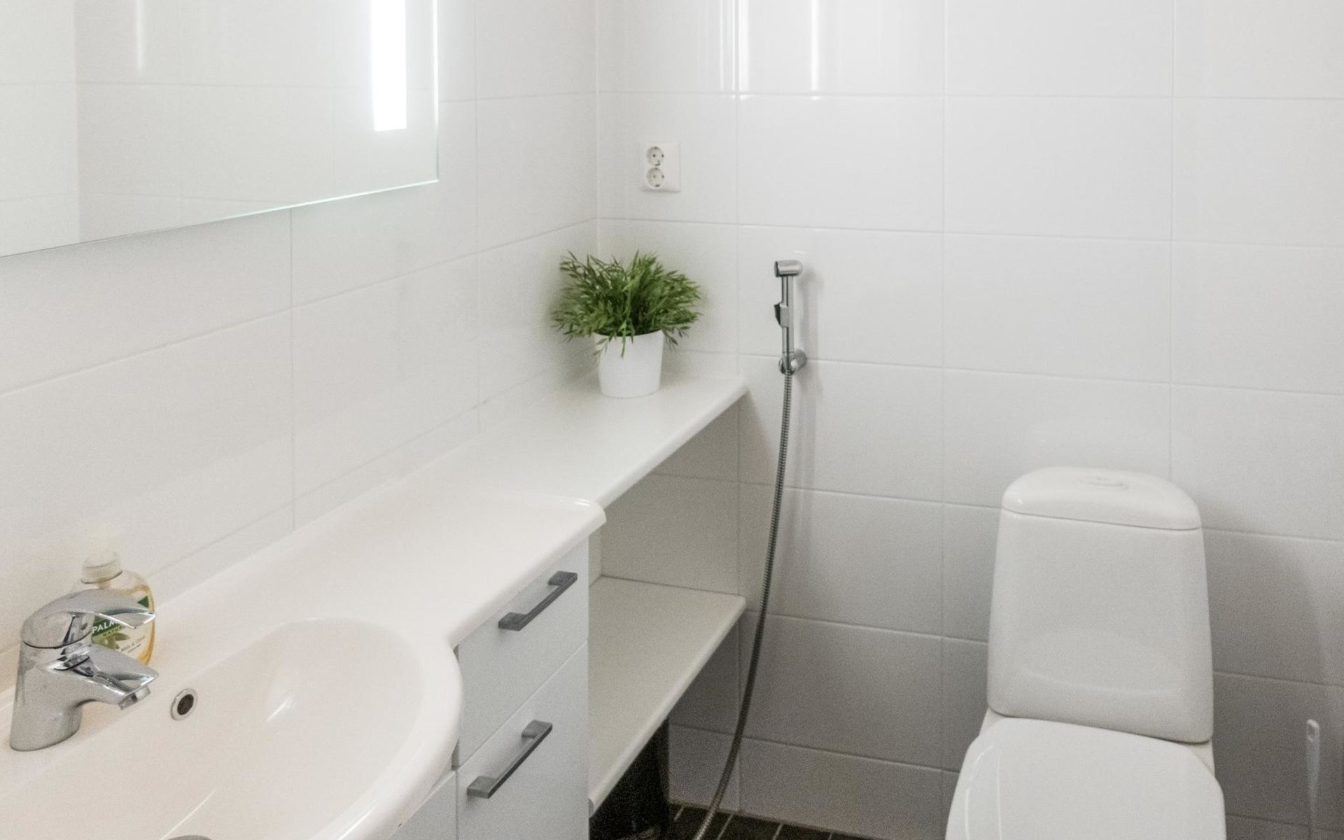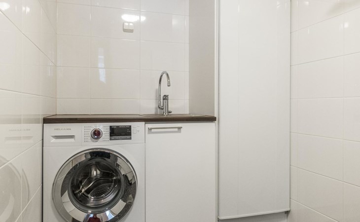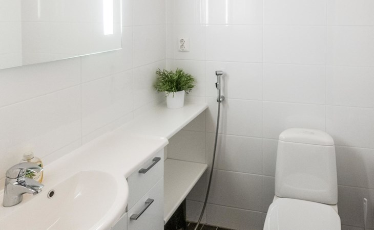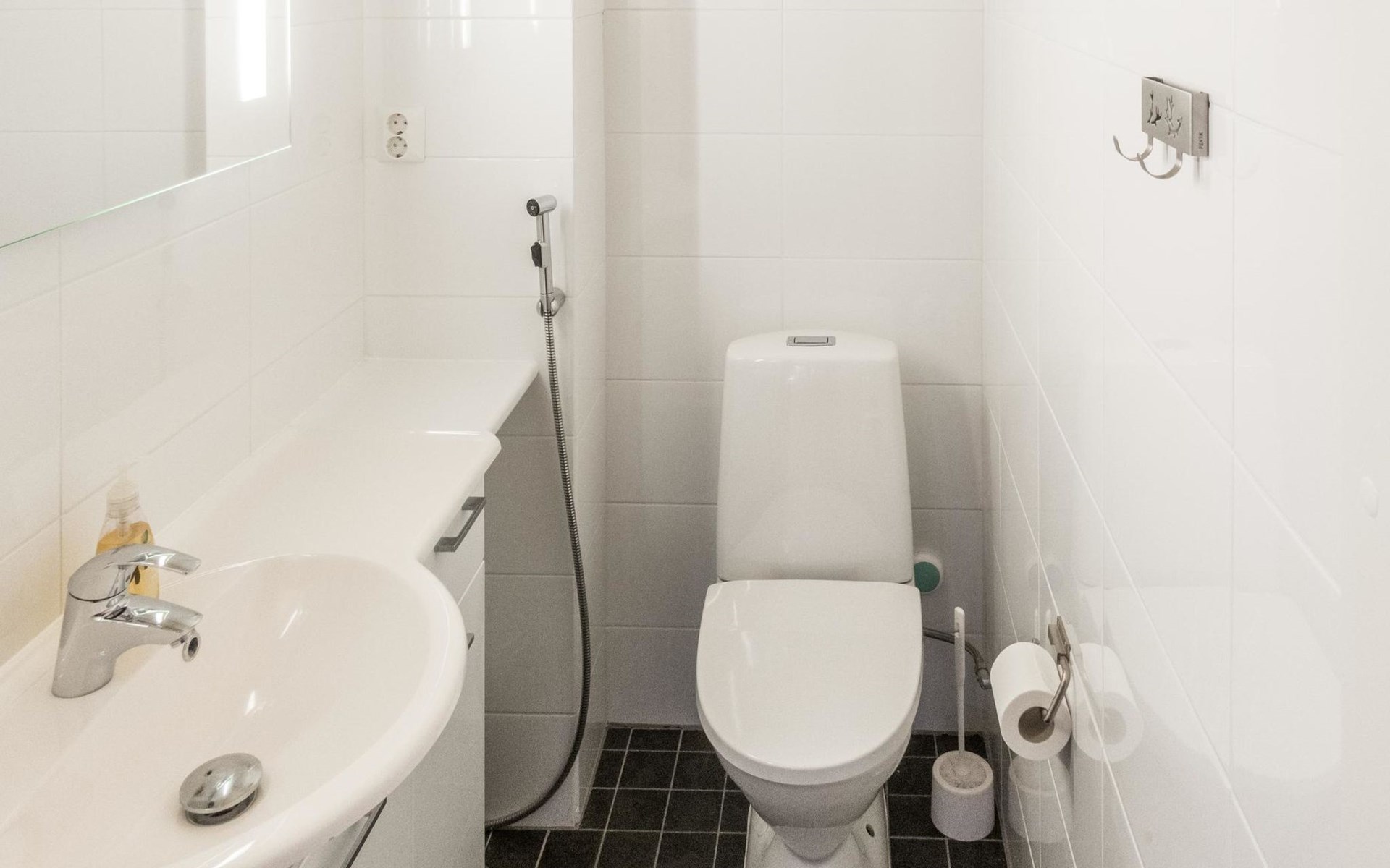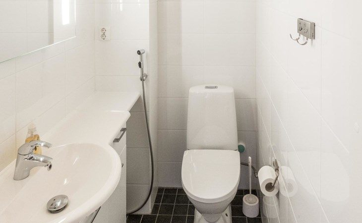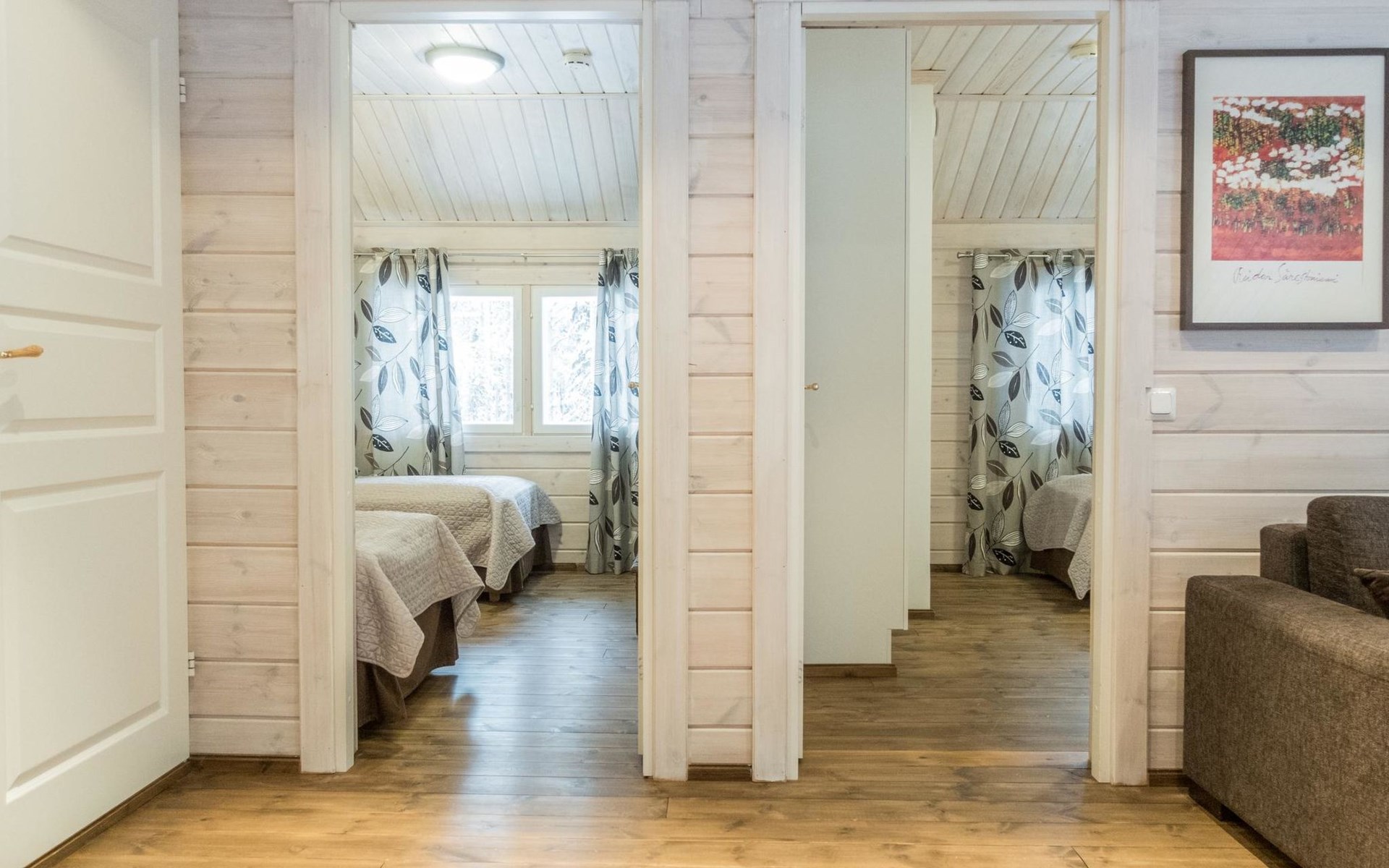 Downstairs: living room/kitchen, bedroom 2 beds, sauna (electric stove), washroom (2 showers), utility room, WC and open porch.