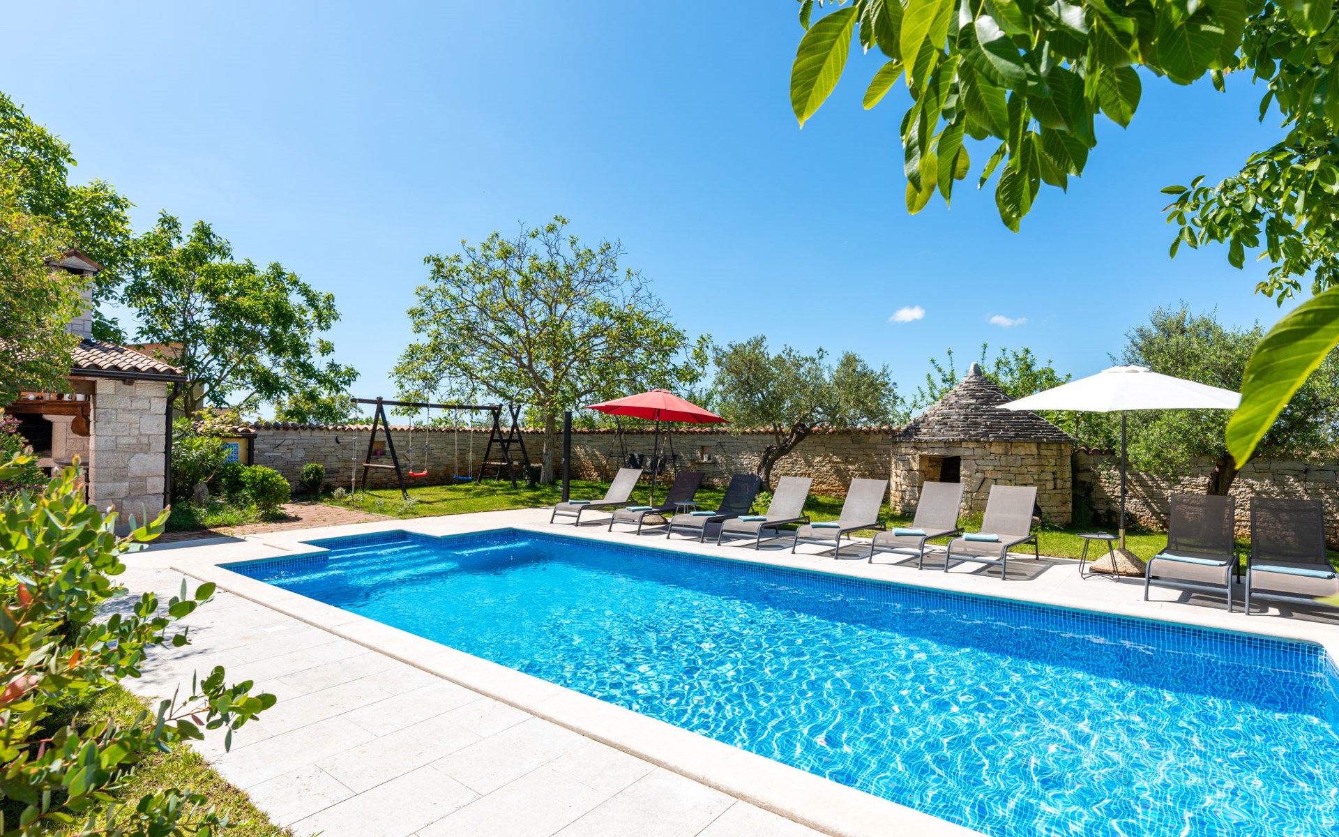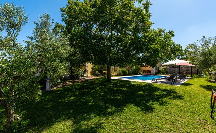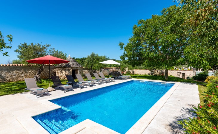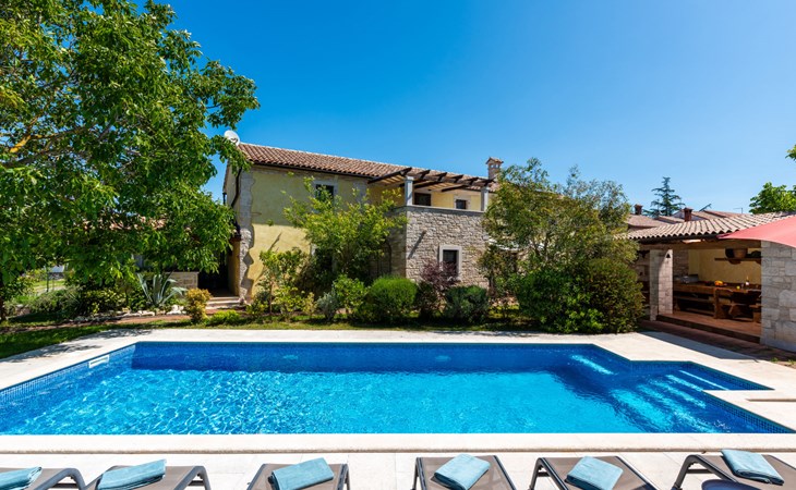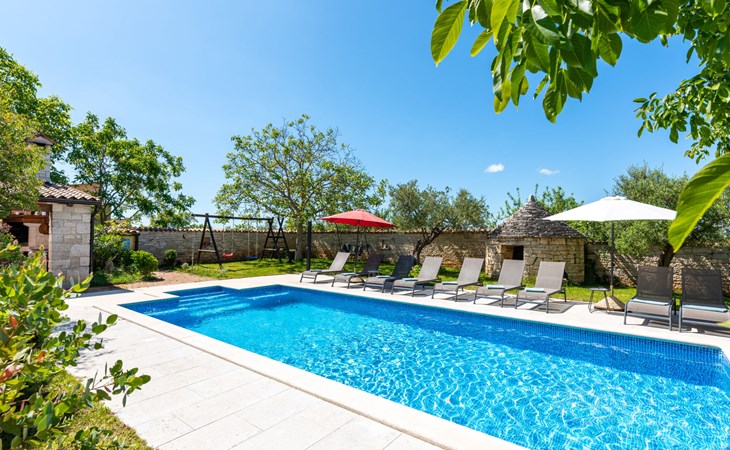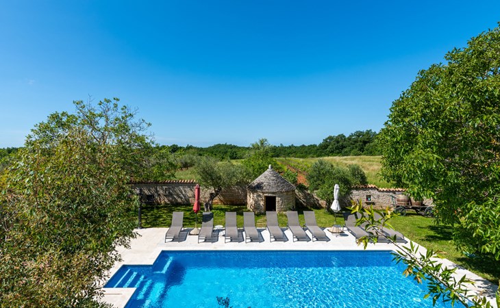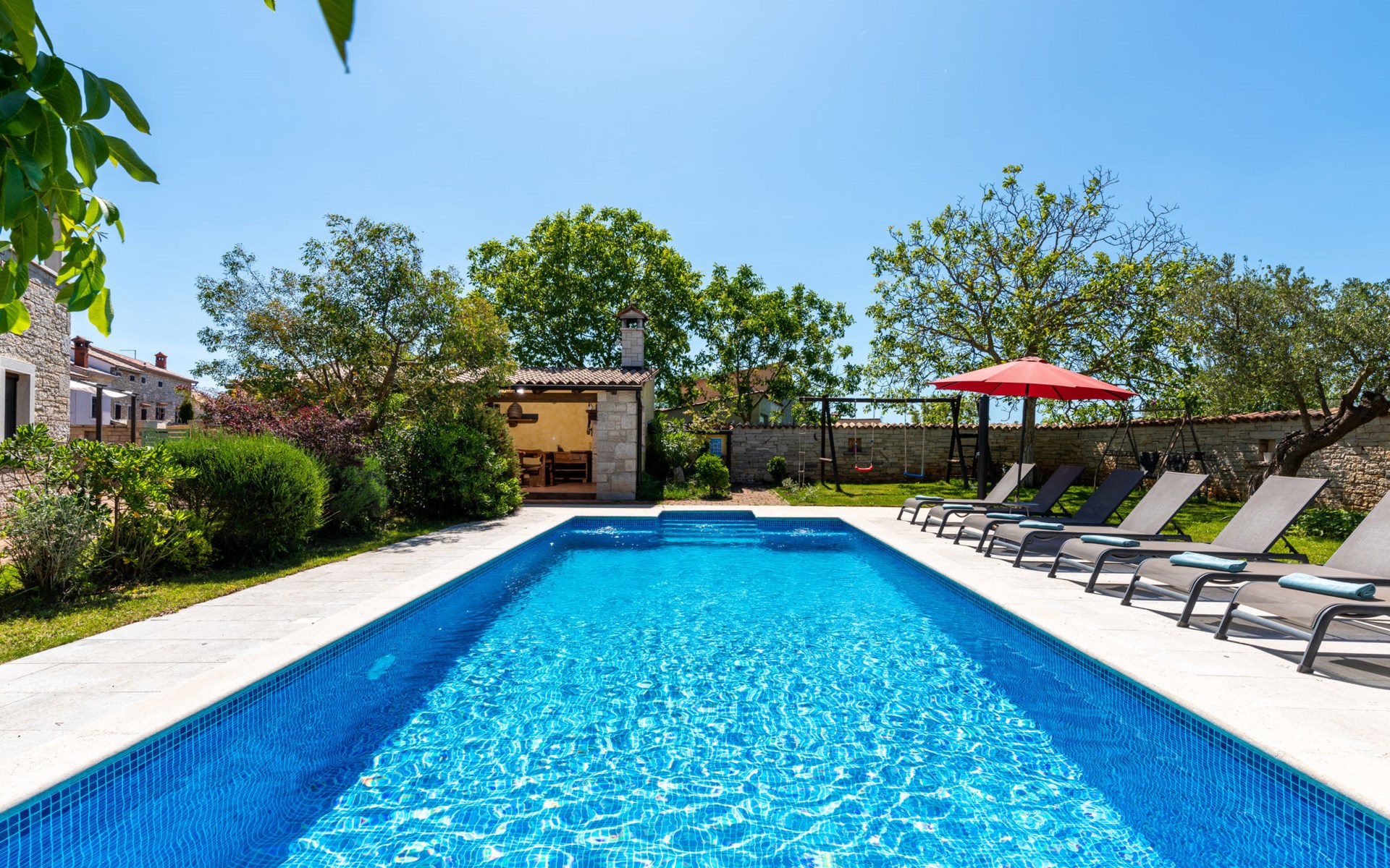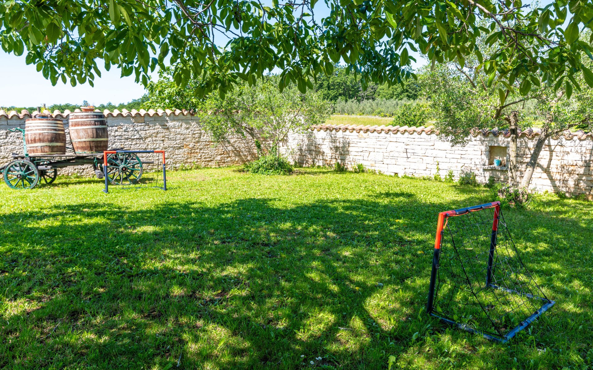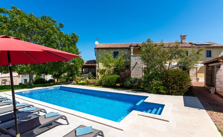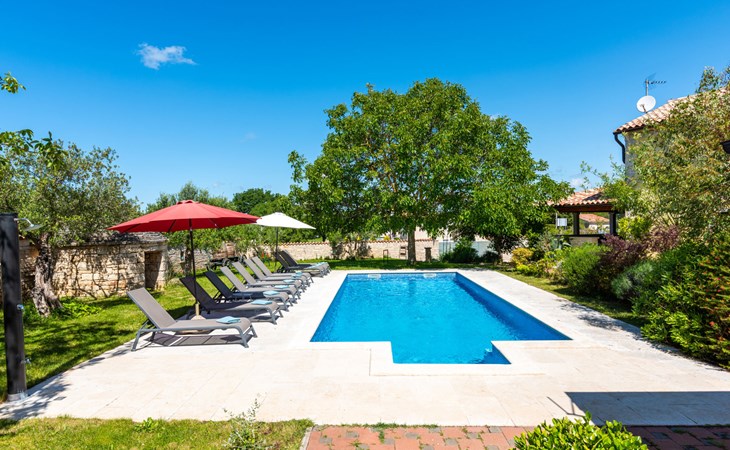 Orbanići 7 km van Vodnjan: Groot, rustieke huis "Ive", van 2 verdiepingen. 12 km van het centrum van Svetvinčenat, 19 km van het centrum van Pula, 12 km van zee. Voor alleengebruik: terrein 1.000 m2 (omheind), verzorgde tuin, weide, openluchtzwembad hoekig (9 x 4 m, 140 cm diepte, seizoensgebonden beschikbaarheid: 01.Mei. - 01.Nov.) met trap. Buitendouche, terras (20 m2), tuinmeubelen, grill (schommel). In het huis: internetaansluiting, biljart, wasmachine. Parkeerplaats (voor 3 auto's) bij het huis op het terrein. Winkel 2 km, restaurant 2 km, bushalte 3.5 km, kiezelstrand 12 km. Groepen jongeren uitsluitend op aanvraag.