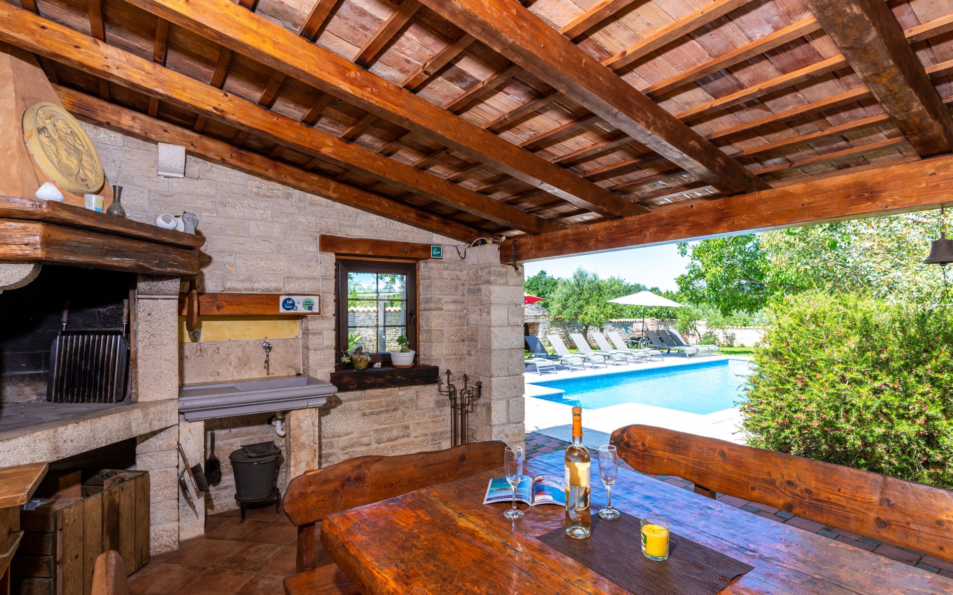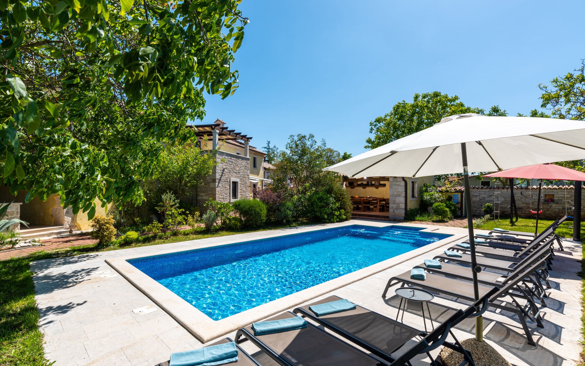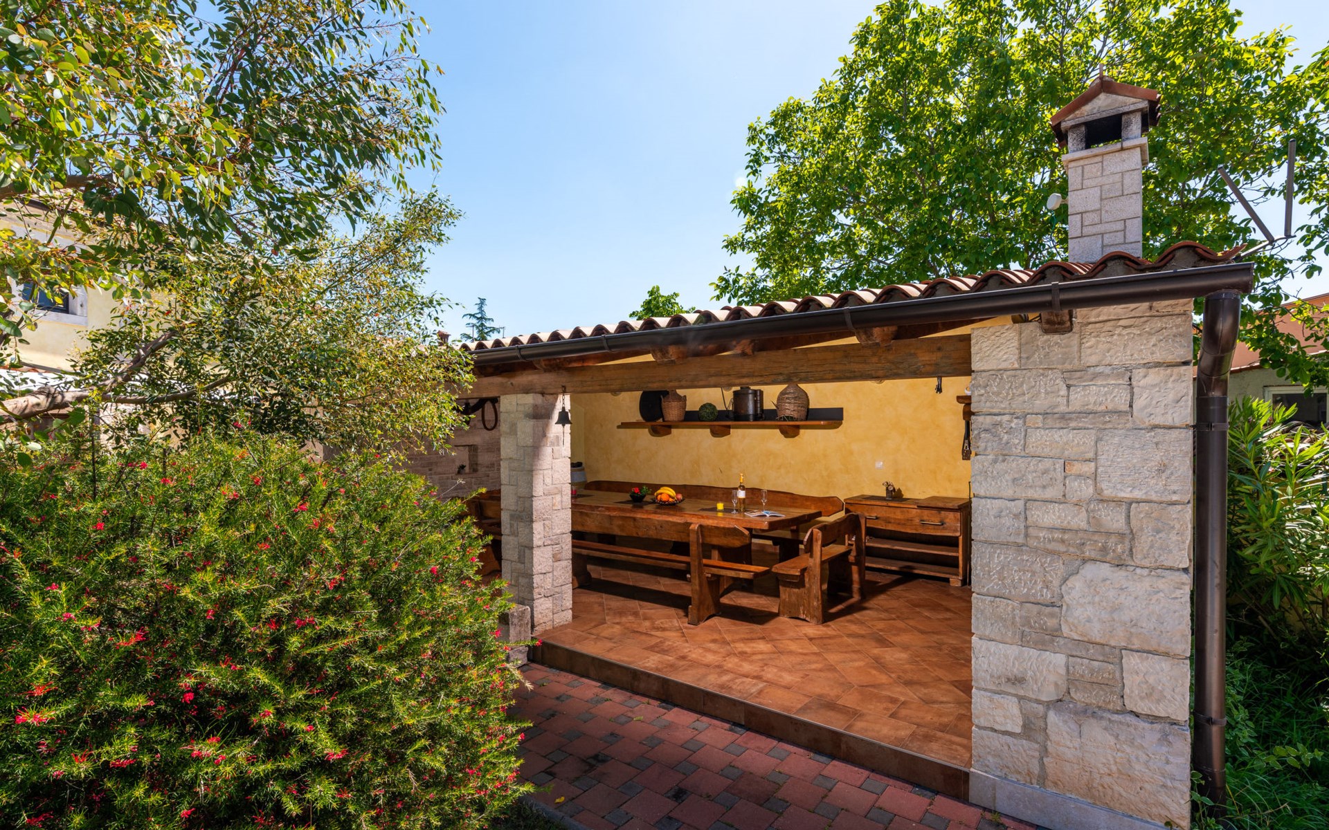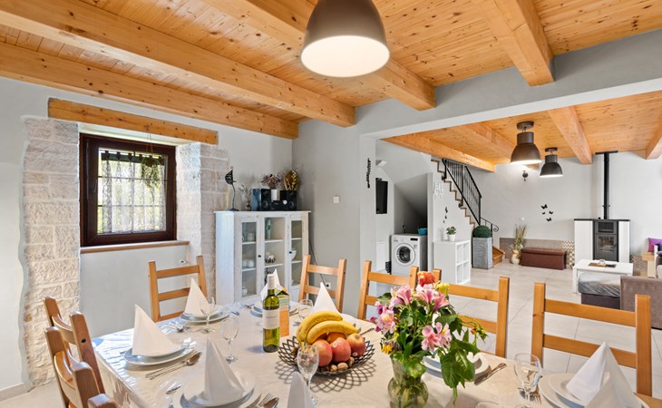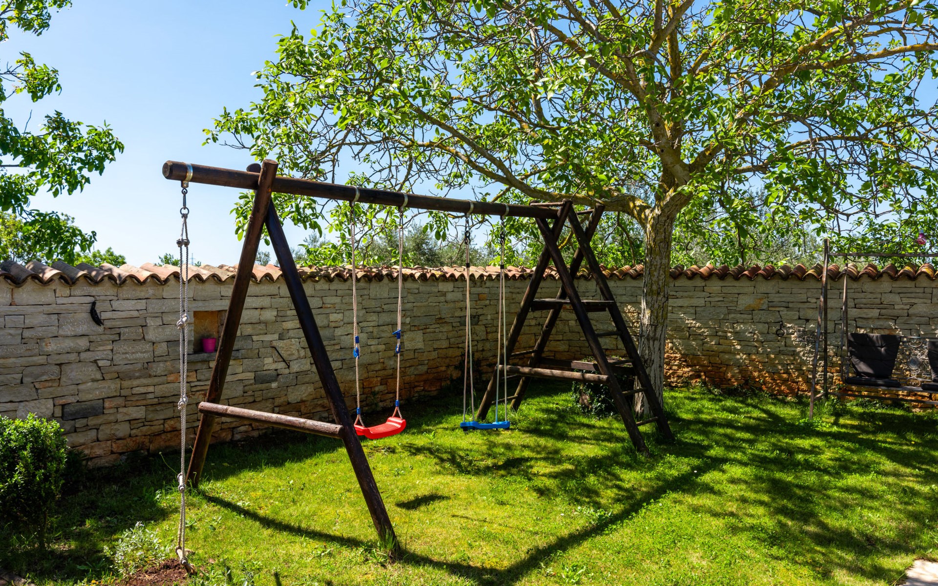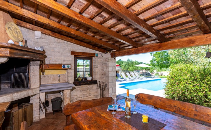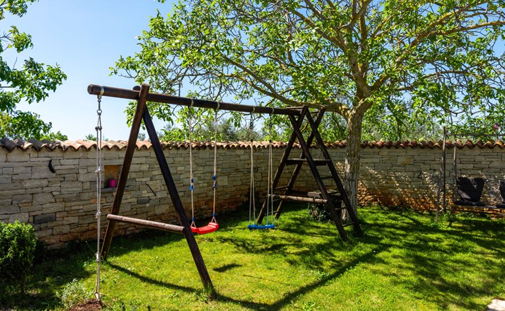 Orbanići 7 km van Vodnjan: Groot, rustieke huis "Ive", van 2 verdiepingen. 12 km van het centrum van Svetvinčenat, 19 km van het centrum van Pula, 12 km van zee. Voor alleengebruik: terrein 1.000 m2 (omheind), verzorgde tuin, weide, openluchtzwembad hoekig (9 x 4 m, 140 cm diepte, seizoensgebonden beschikbaarheid: 01.Mei. - 01.Nov.) met trap. Buitendouche, terras (20 m2), tuinmeubelen, grill (schommel). In het huis: internetaansluiting, biljart, wasmachine. Parkeerplaats (voor 3 auto's) bij het huis op het terrein. Winkel 2 km, restaurant 2 km, bushalte 3.5 km, kiezelstrand 12 km. Groepen jongeren uitsluitend op aanvraag.