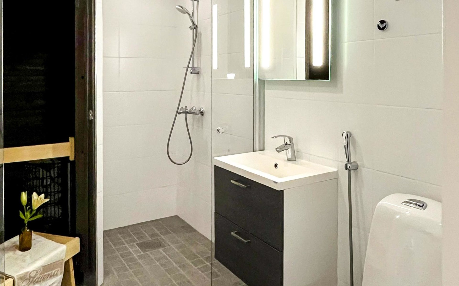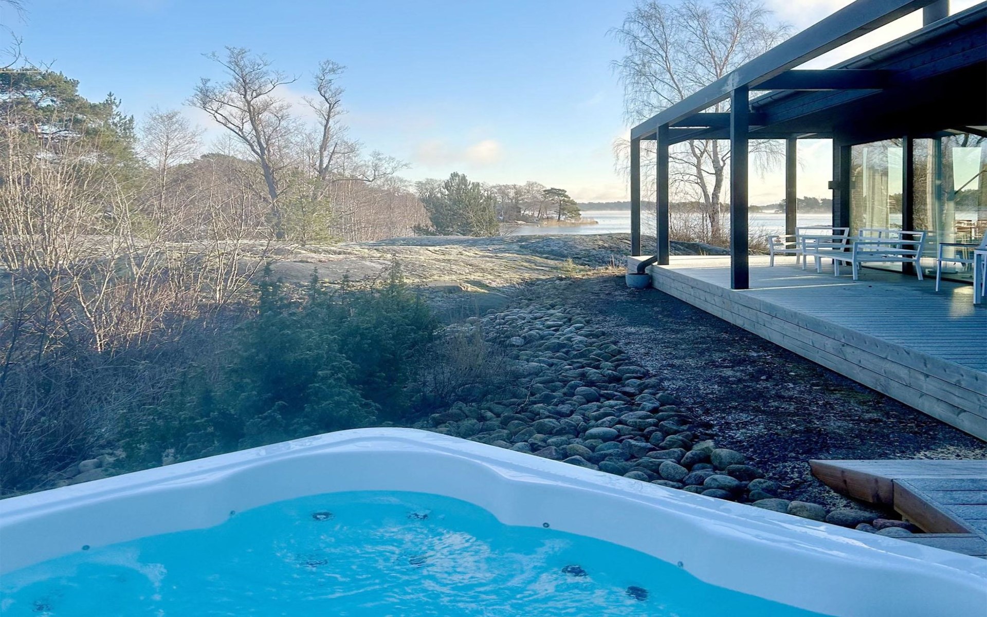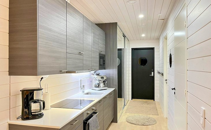 There is a bathroom with toilet and a private electric sauna. The apartment has Wi-Fi and a cooling pump, and is heated with comfortable underfloor heating. If you arrive by boat, the apartment has its own berth on the dock in front of the sauna.