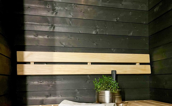 Completed May 2019, this beautifully finished 45m2 apartment has sauna and private front and back terraces. The living room has a dining table and a sofa bed (120 cm) for two people. The bedroom has a large double bed (180 cm). The bed can be made into two single beds. Well-equipped open-plan kitchen with appliances and a high quality charcoal grill for cooking in the courtyard.