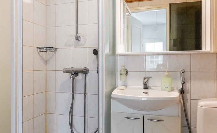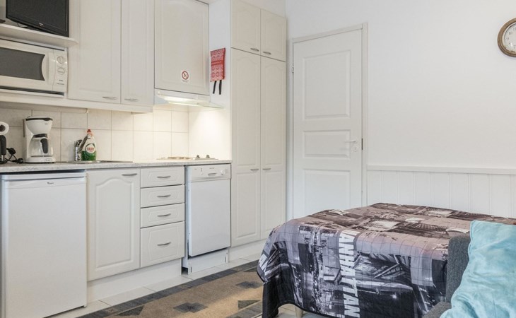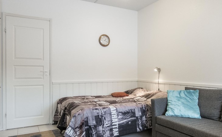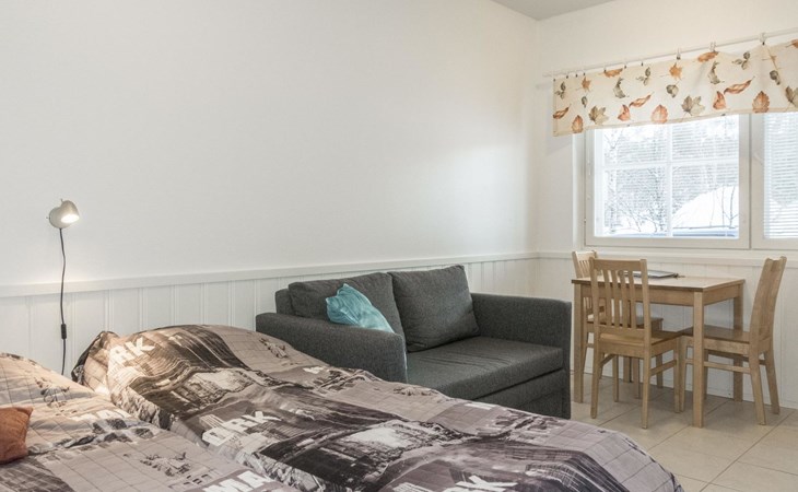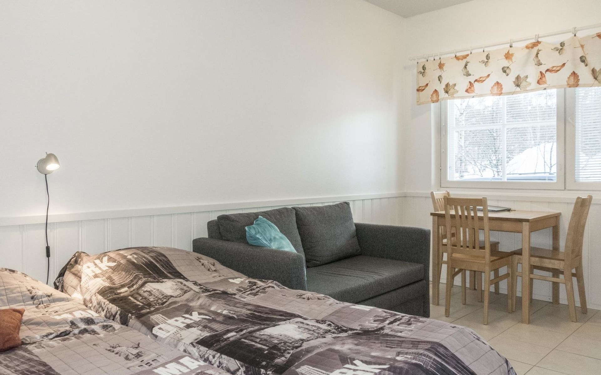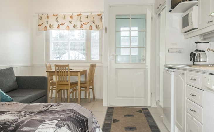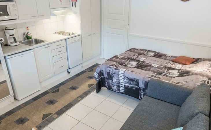 Wood and stone-built holiday apartment, built 2005. Living room/kitchen with two beds and a sofabed. Sauna (electric stove) and bathroom/toilet.