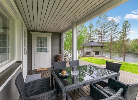 Log cottage, built in 2006. Living room-kitchen with wooden sofa bed, bedroom with double bed, second bedroom with 2 single beds, loft with 2 mattresses (loft is low and stairs steep), sauna with wood stove, shower in the steam room, separate toilet and large covered terrace on the river side.