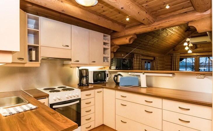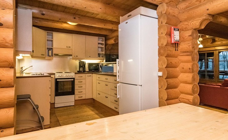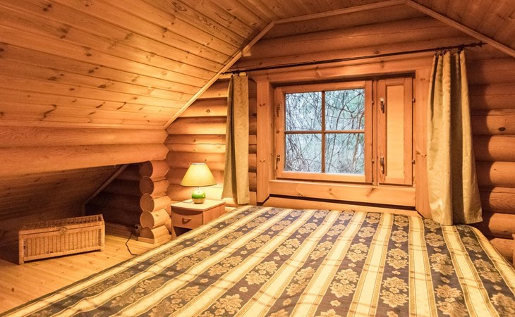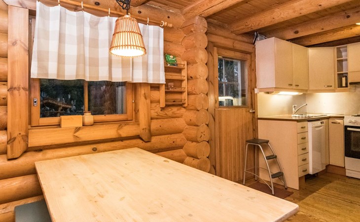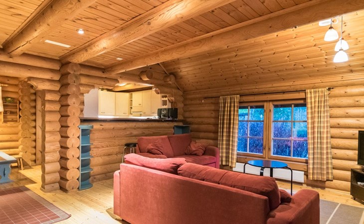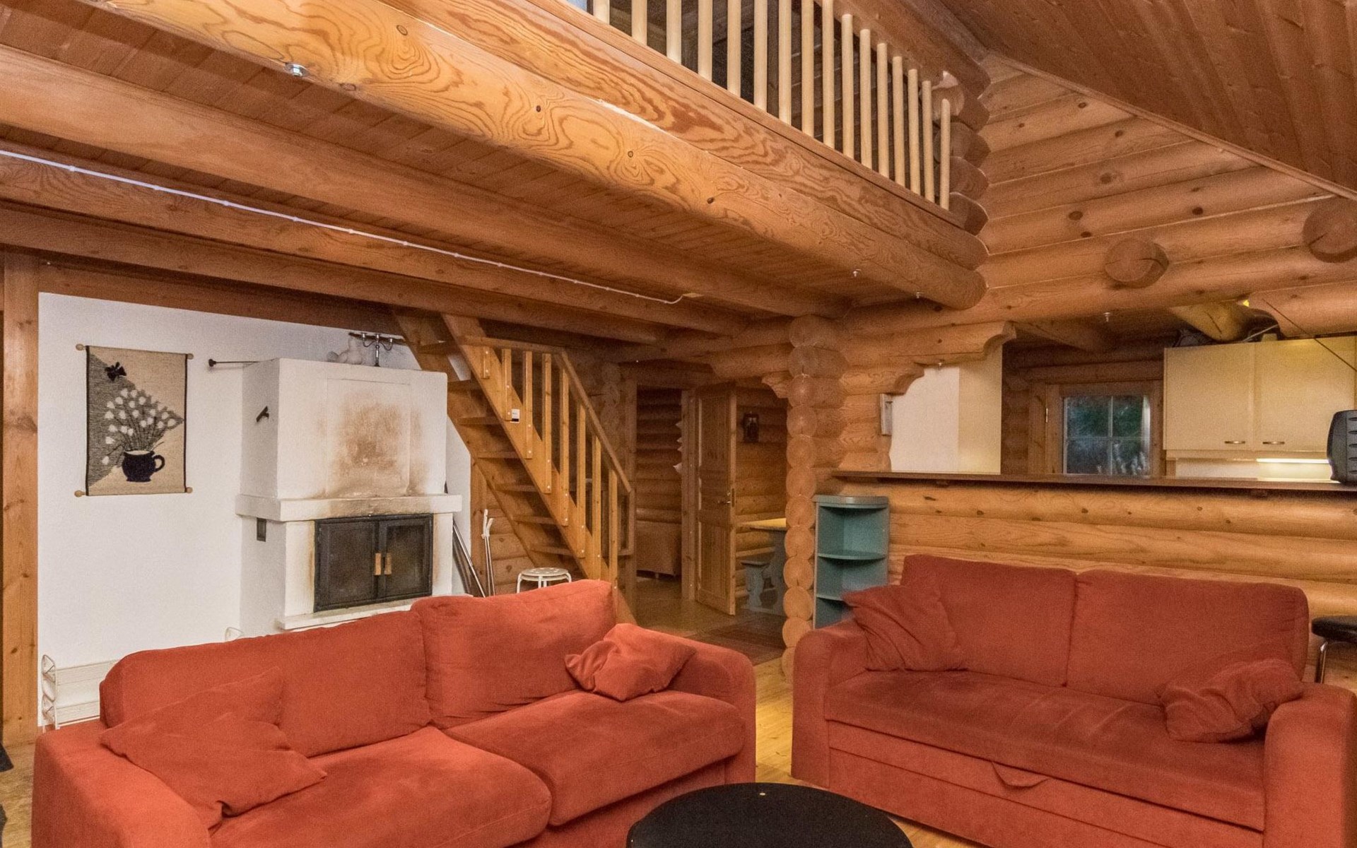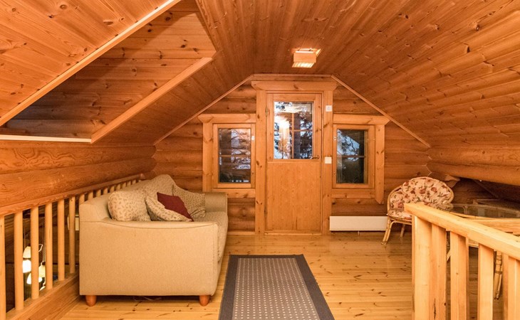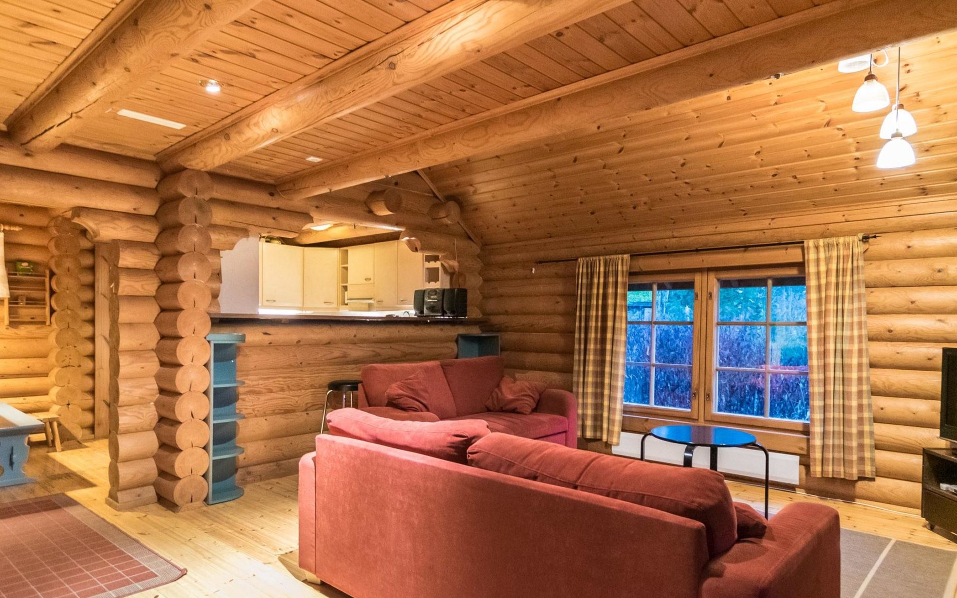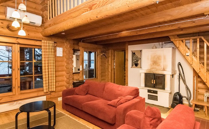 Log cabin 1994, living room / kitchen with sofa bed, 2 bedrooms with 2 beds in each (one downstairs, another upstairs), sleeping loft with spreadable sofa bed, wood-heated sauna, washroom (WC), covered porch, balcony. Smoke sauna available for rent.