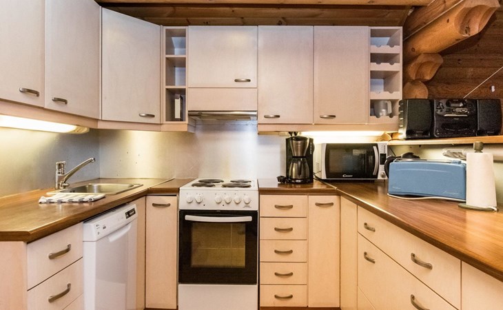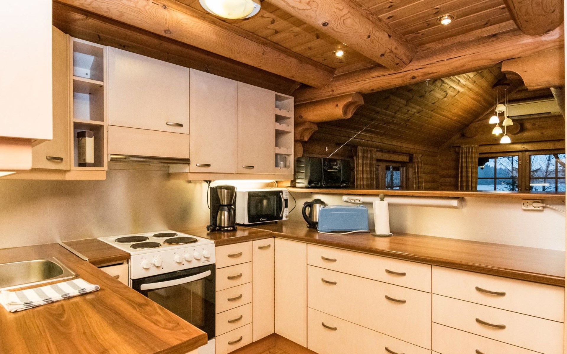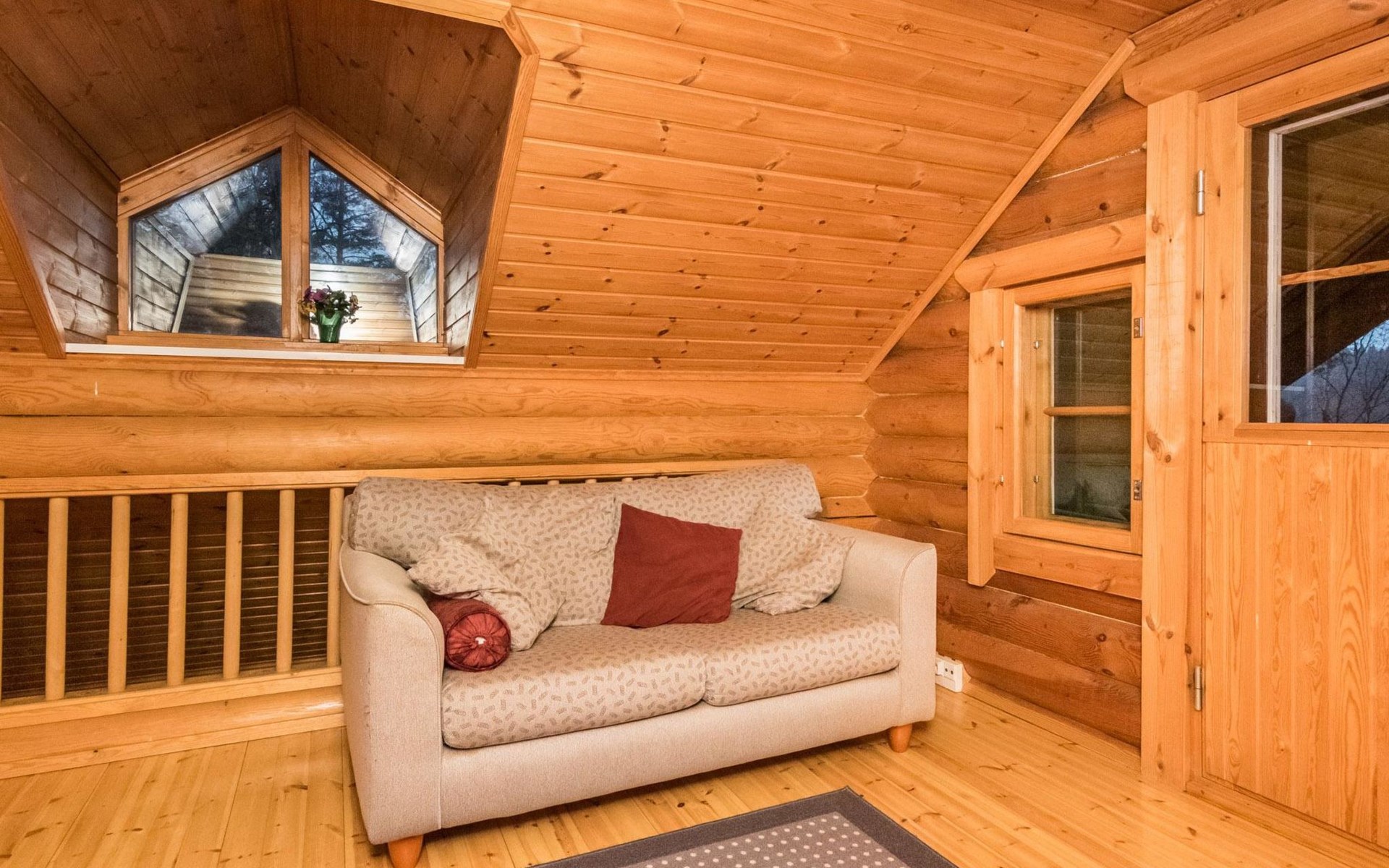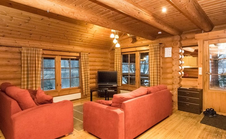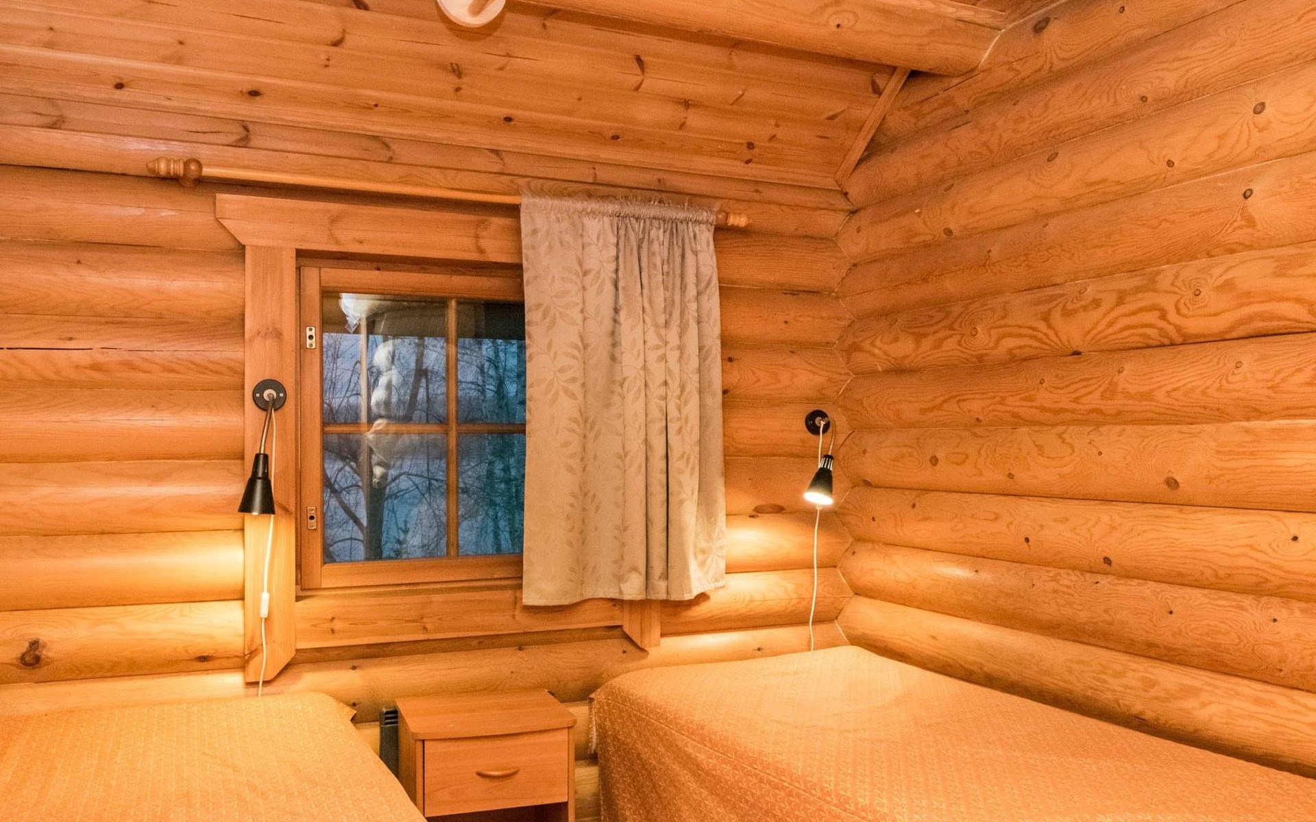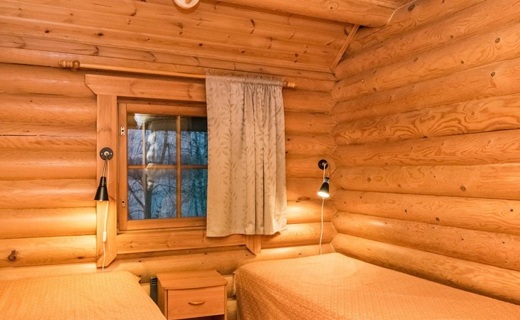 Log cabin 1994, living room / kitchen with sofa bed, 2 bedrooms with 2 beds in each (one downstairs, another upstairs), sleeping loft with spreadable sofa bed, wood-heated sauna, washroom (WC), covered porch, balcony. Smoke sauna available for rent.