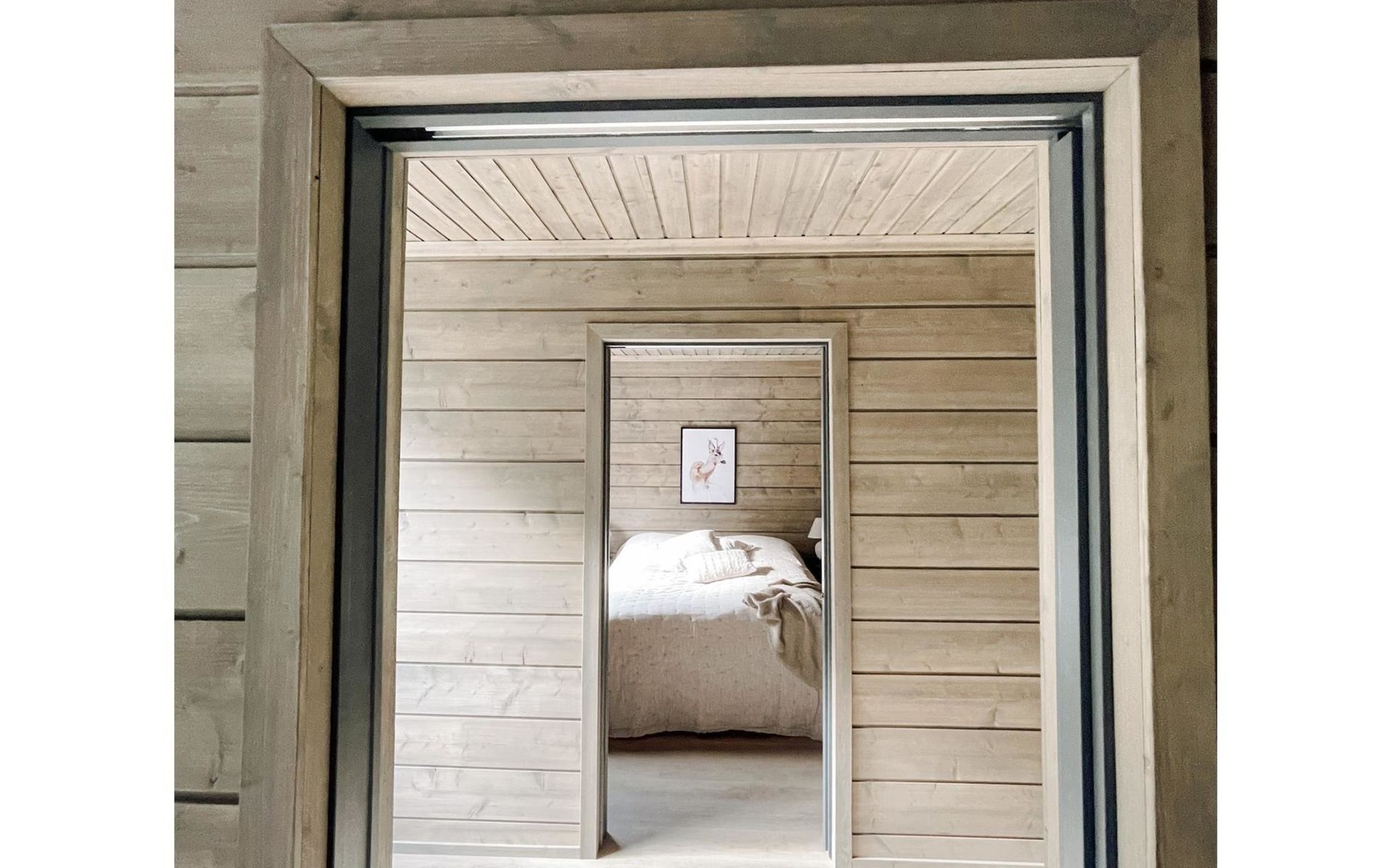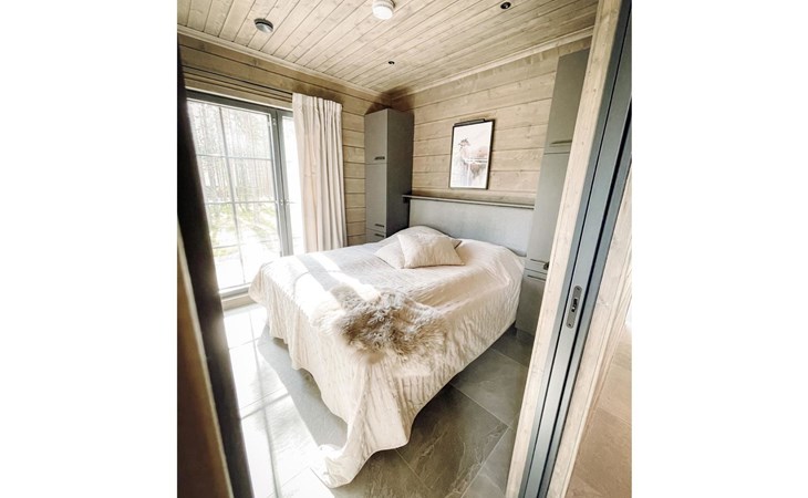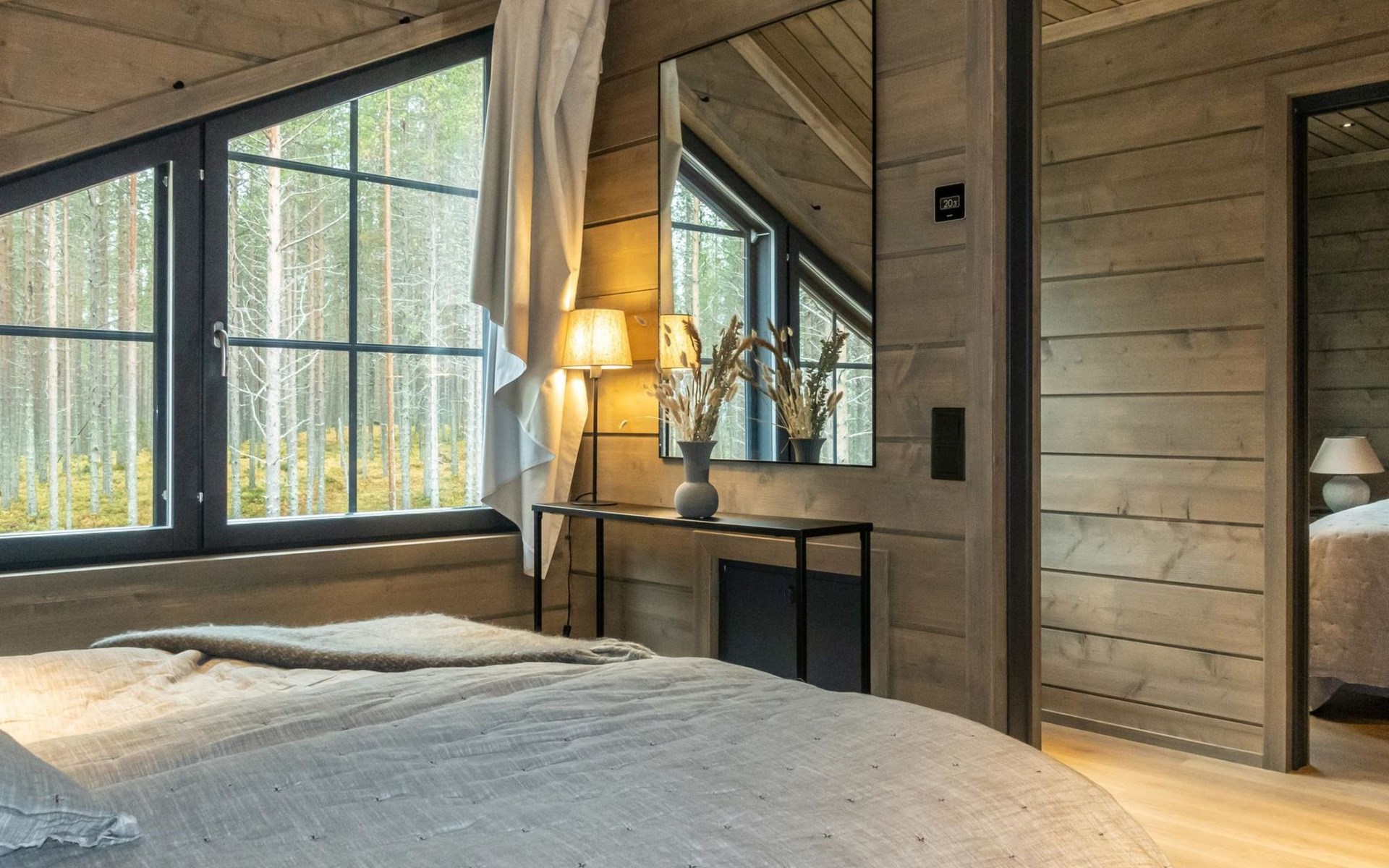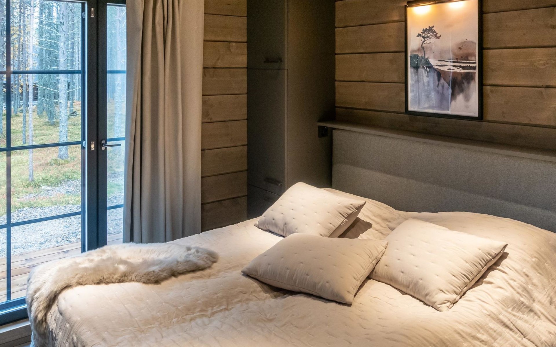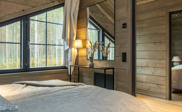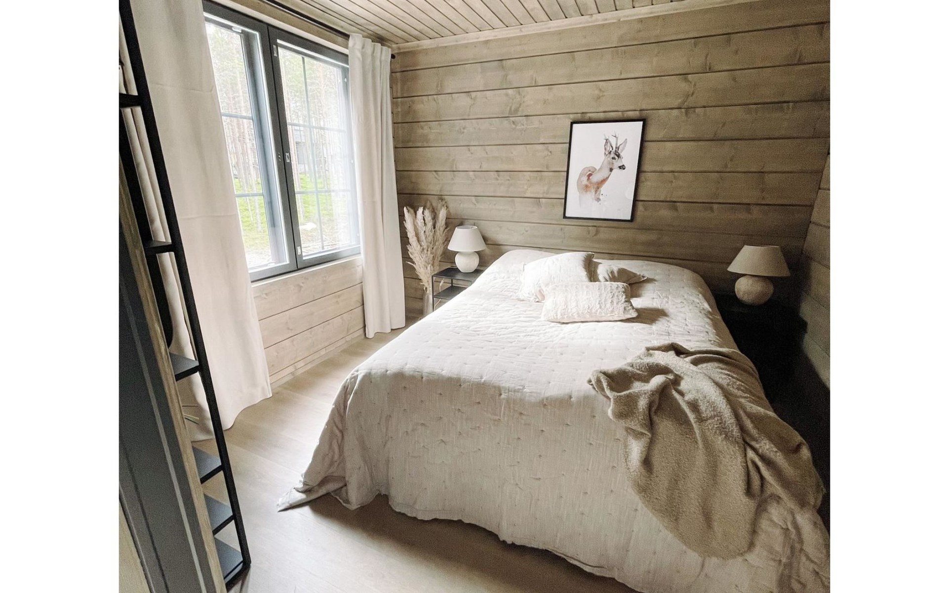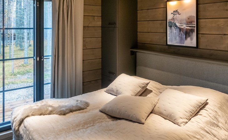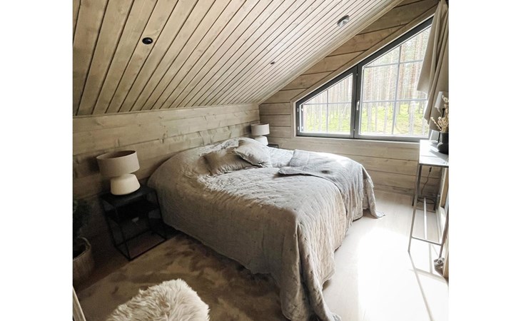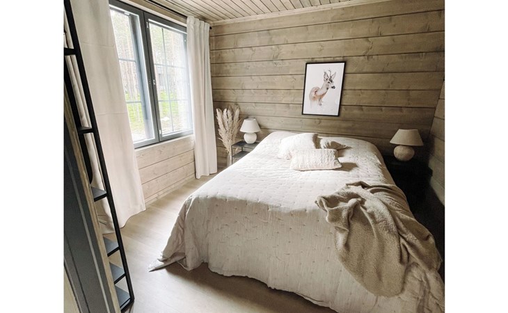 On the ground floor, there is one of Willa's four bedrooms. The bedroom has high-quality 180 cm wide bed and very high-quality pillows and blankets. The room is wonderfully bright thanks to the floor-to-ceiling window, but at night the bedroom can be darkened with a blackout curtain.