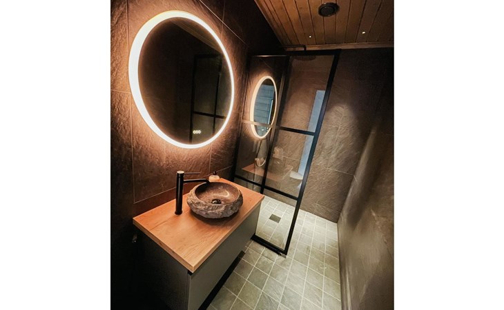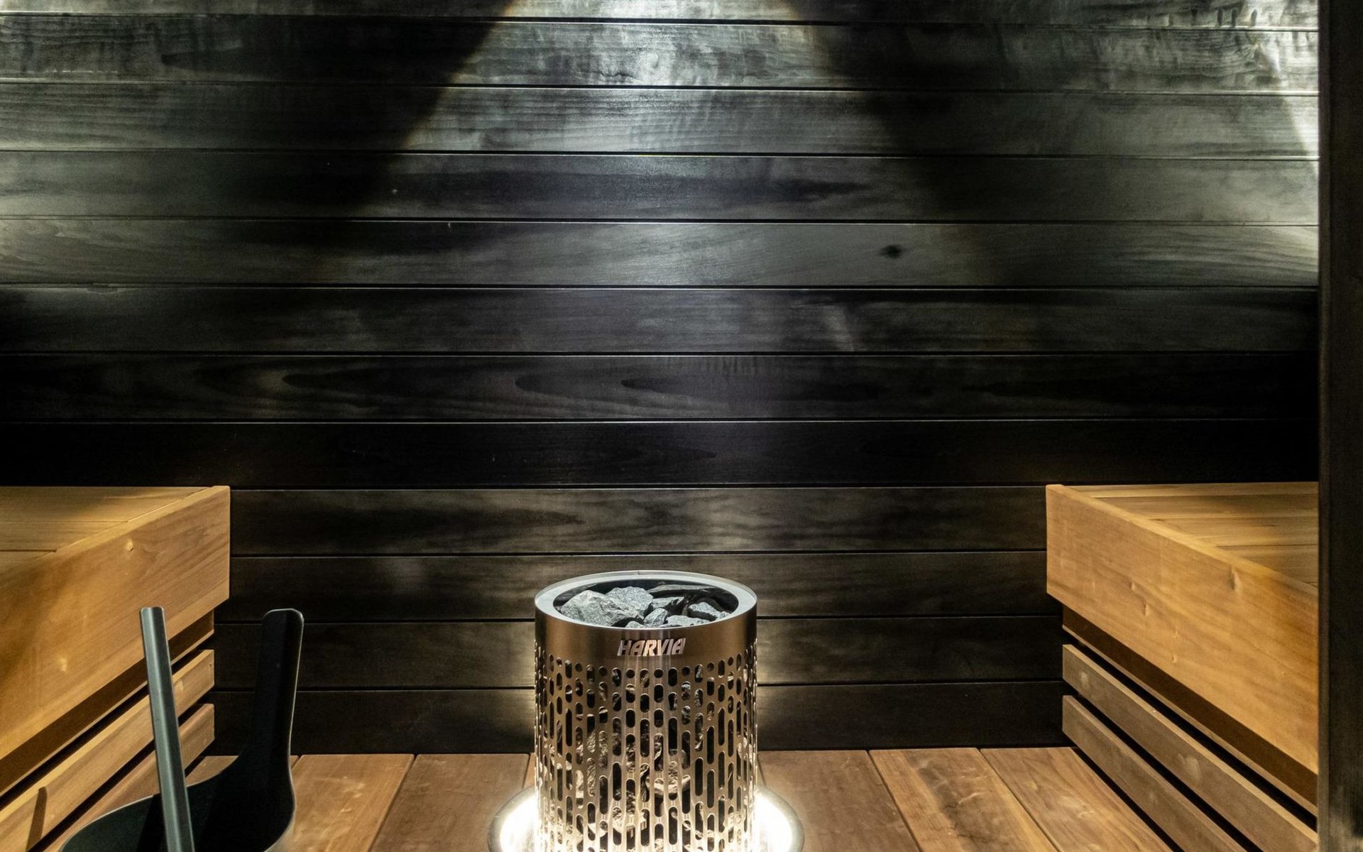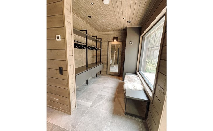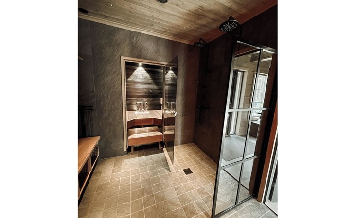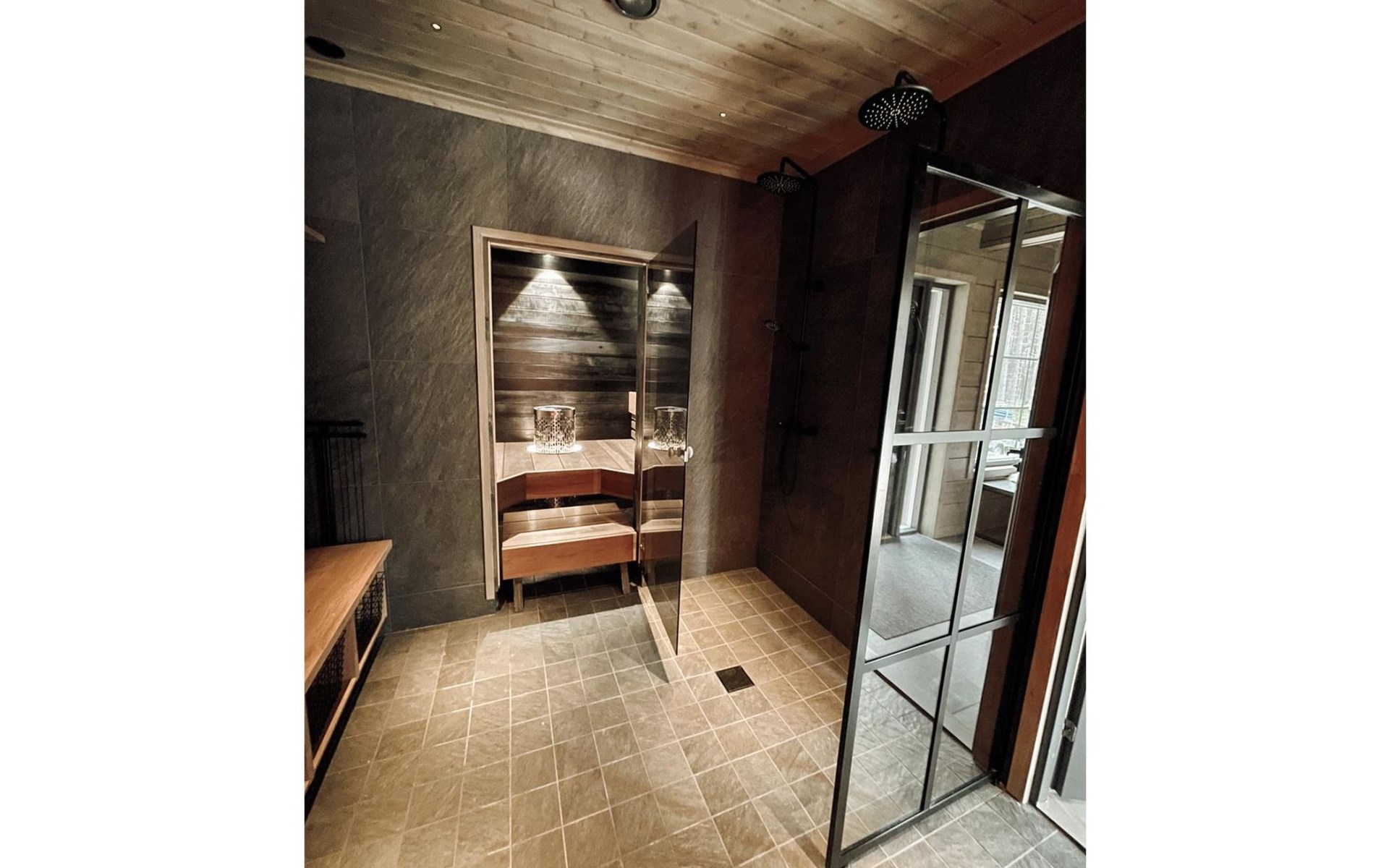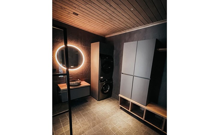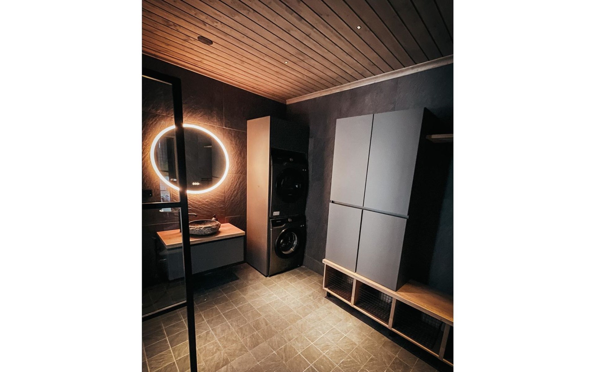 Washroom and sauna are also on the ground floor, entrance from the hall. In addition to WC, the washroom has a sauna and two showers. The washroom also has a washing machine and tumble dryer.