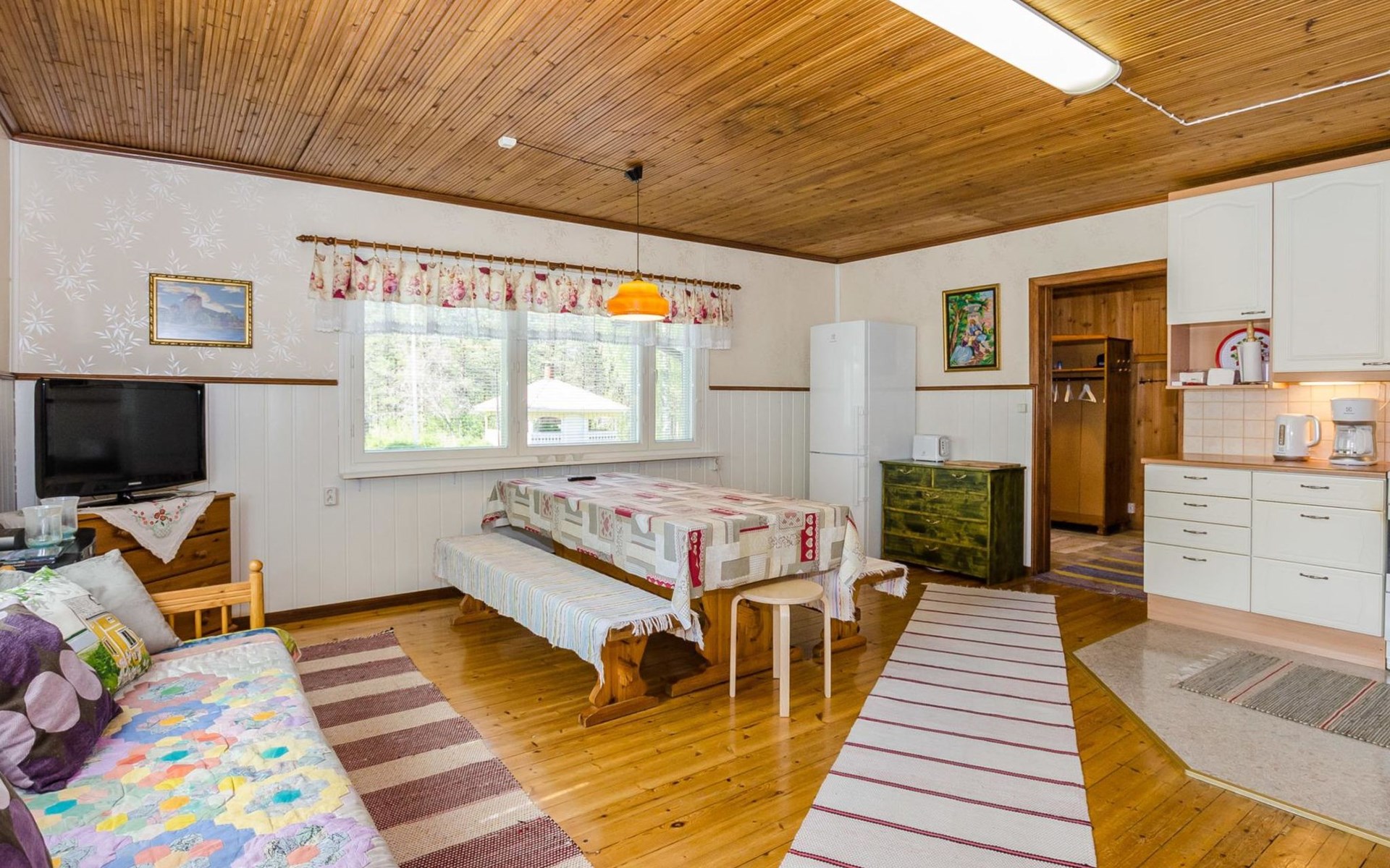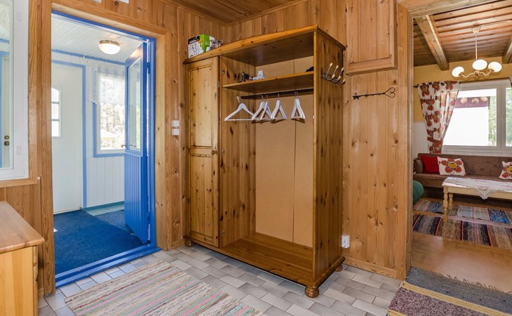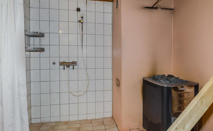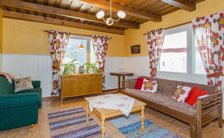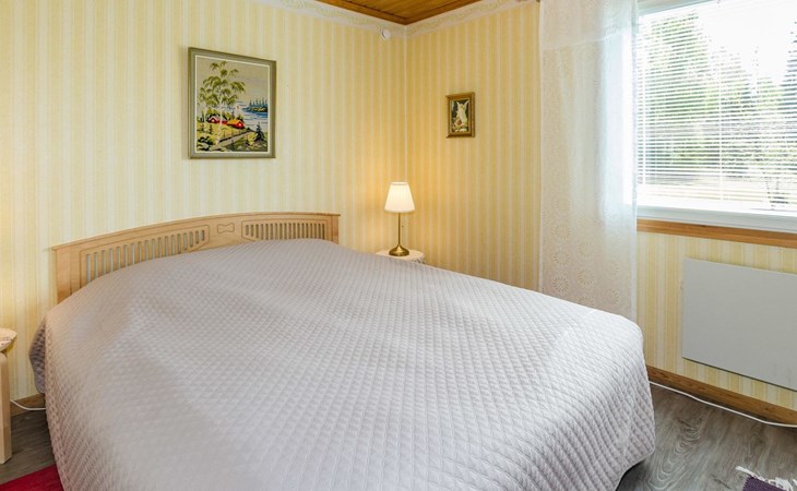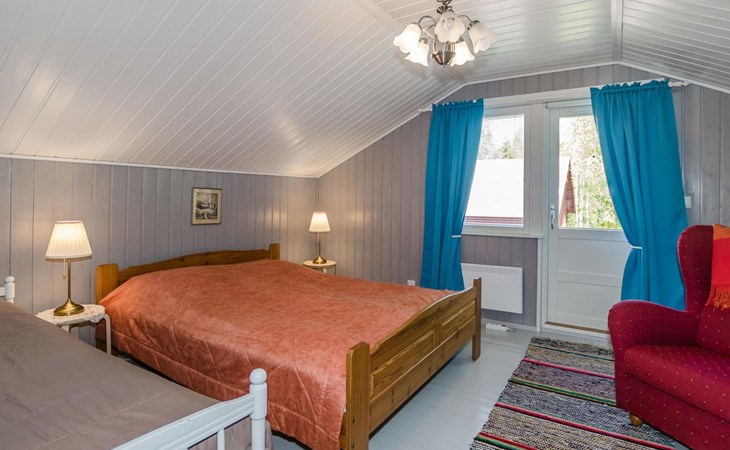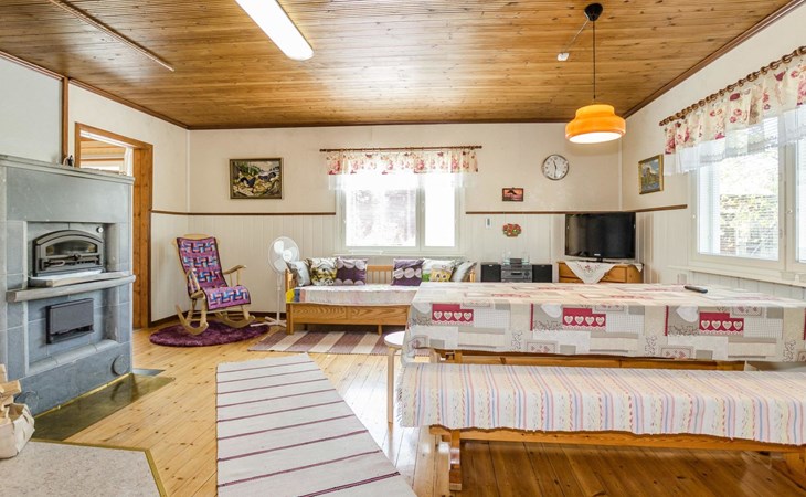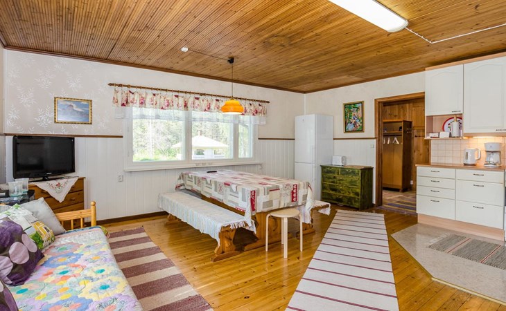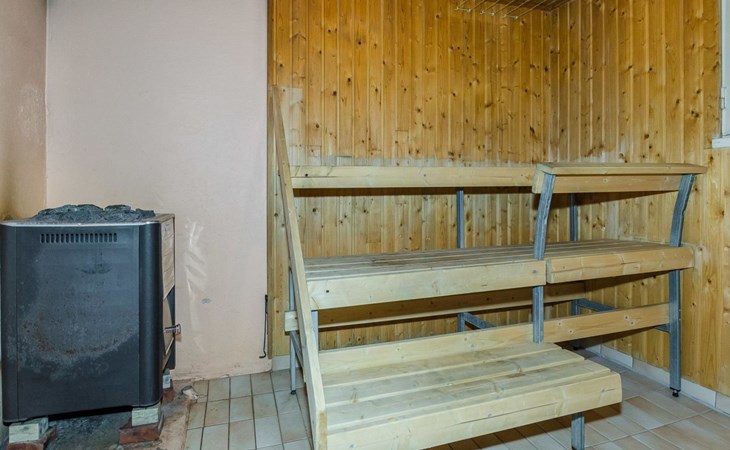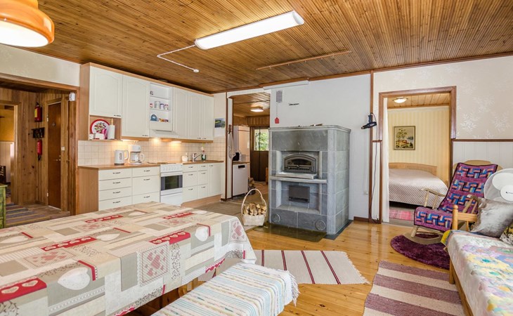 Living room/kitchen, bedroom with double bed, room with spreadable sofa bed, access to the bedroom with 2 double bed from this room. Bedroom with bed, double bed and balcony on the upper floor. There is also a bed on the staircase on the upper floor. WC on both floors. On the upper floor wood-heated sauna, shower in steam room and dressing room. Washing machine in the basement. There are also entrance hall, porch and terrace.