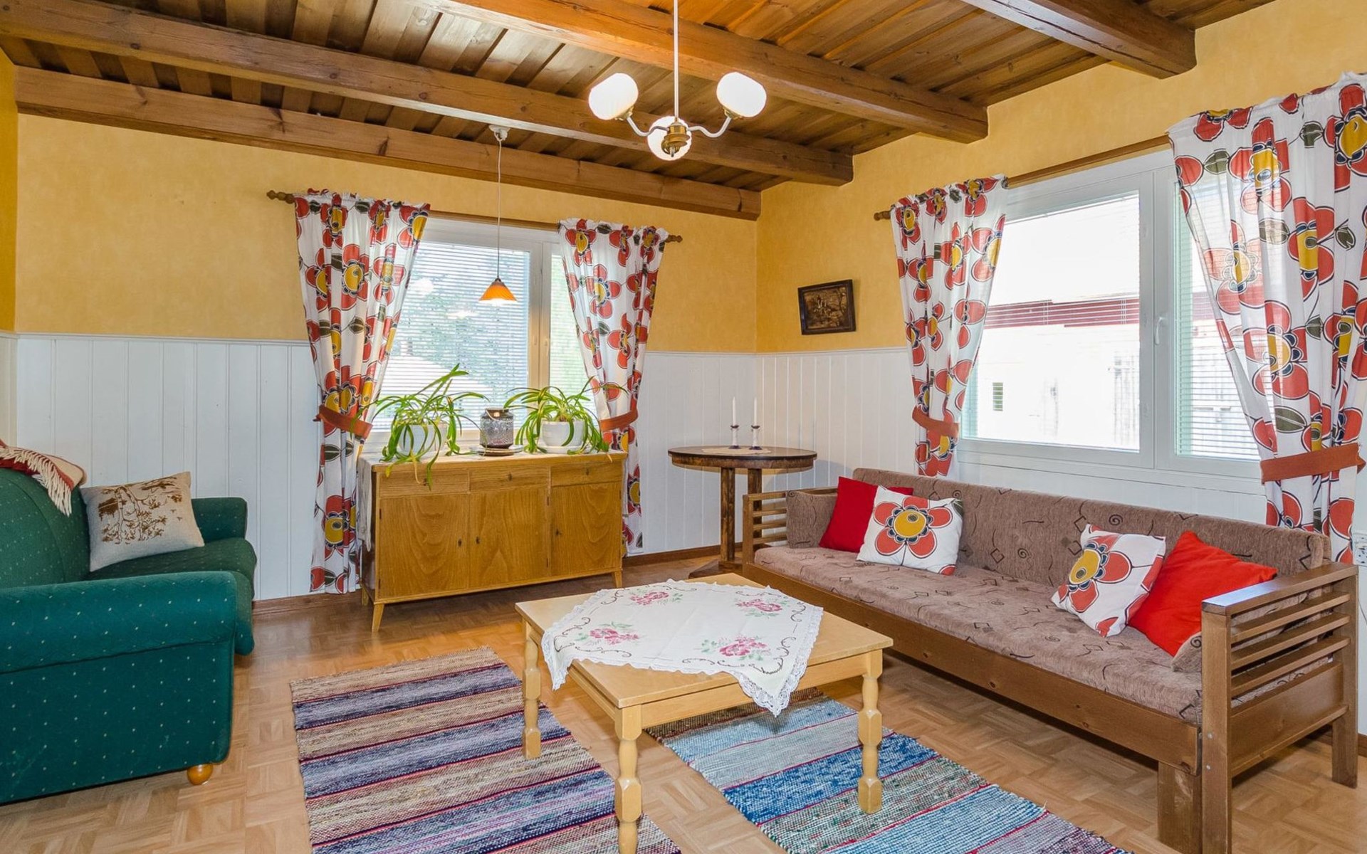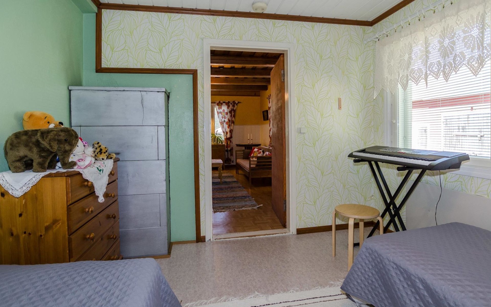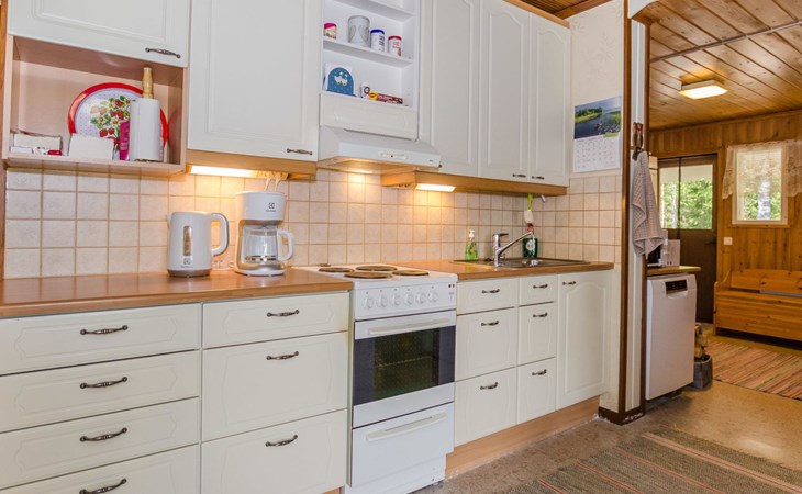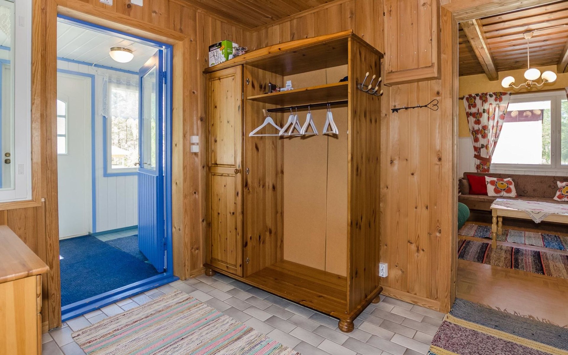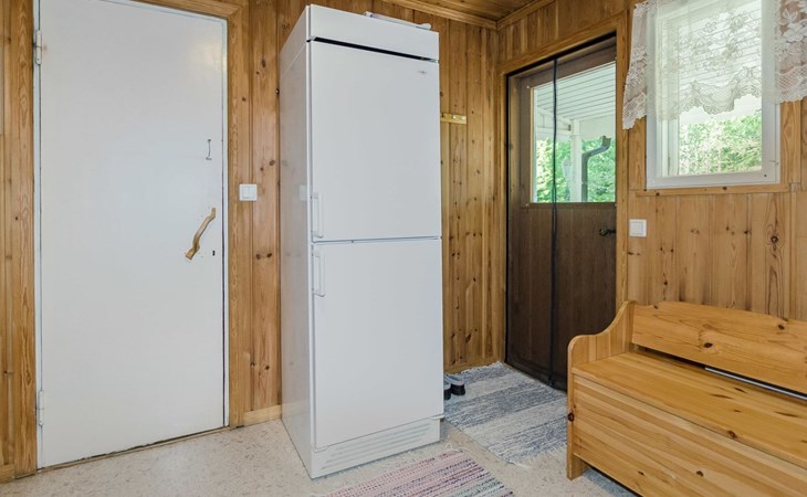 Living room/kitchen, bedroom with double bed, room with spreadable sofa bed, access to the bedroom with 2 double bed from this room. Bedroom with bed, double bed and balcony on the upper floor. There is also a bed on the staircase on the upper floor. WC on both floors. On the upper floor wood-heated sauna, shower in steam room and dressing room. Washing machine in the basement. There are also entrance hall, porch and terrace.