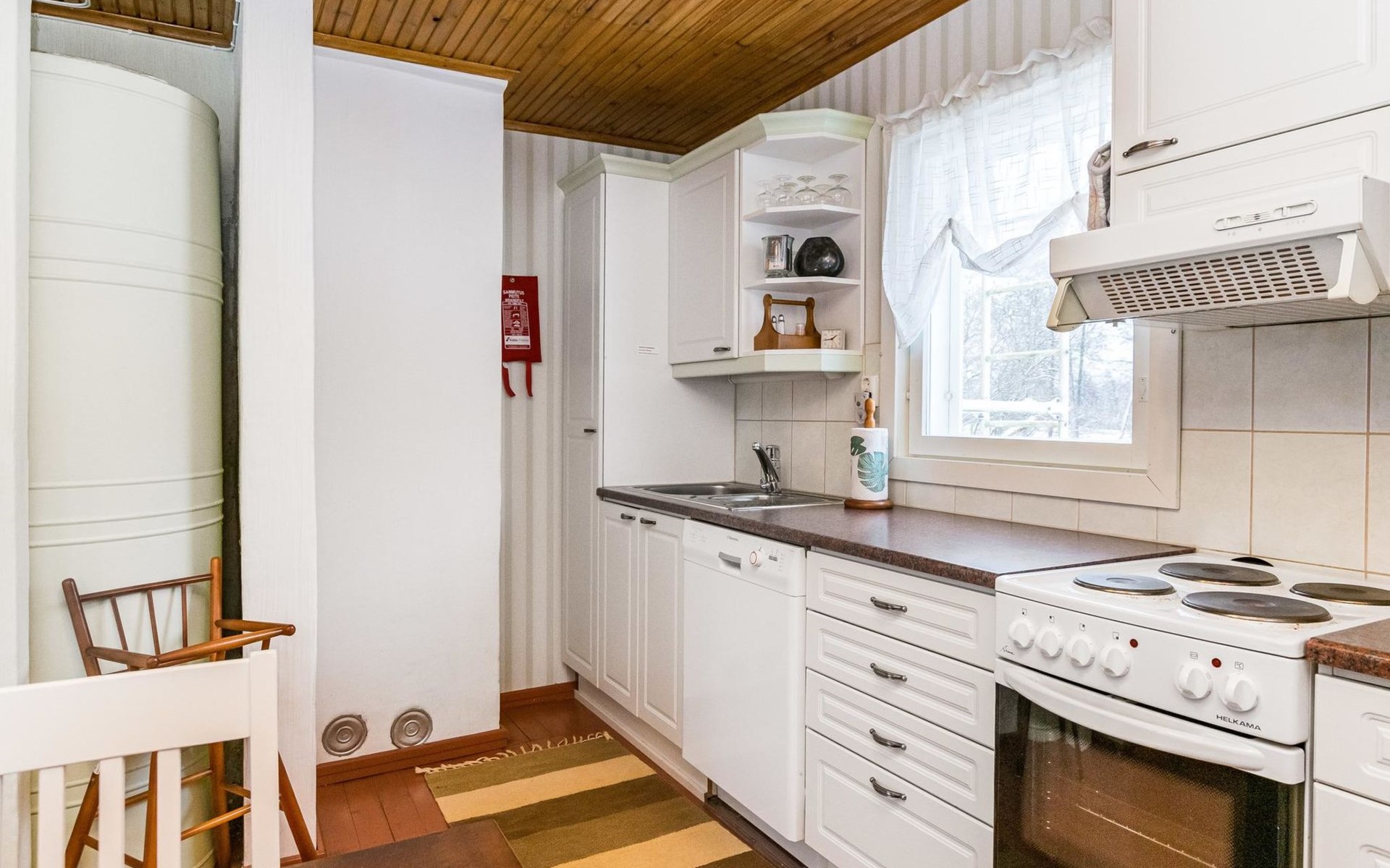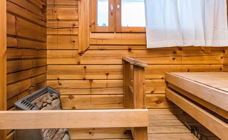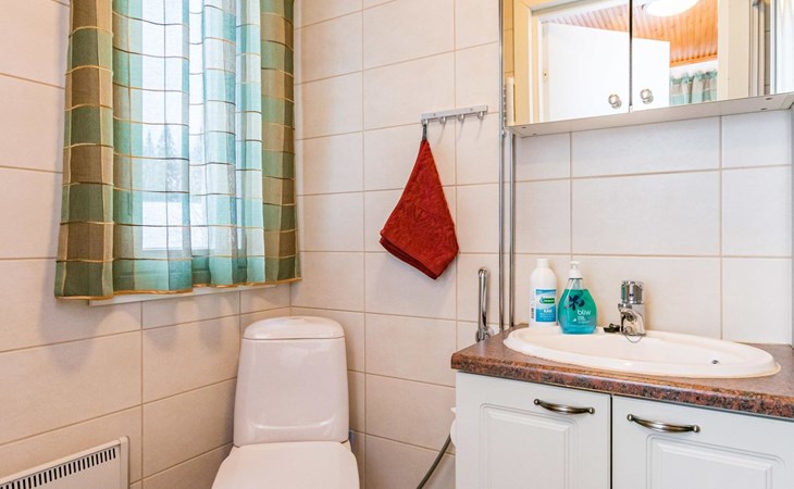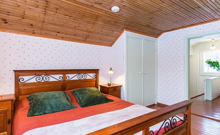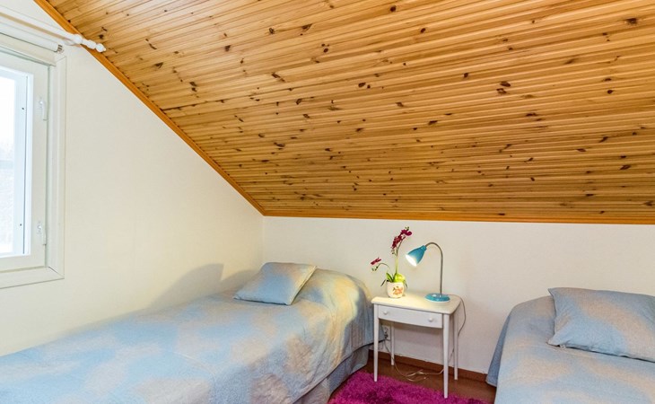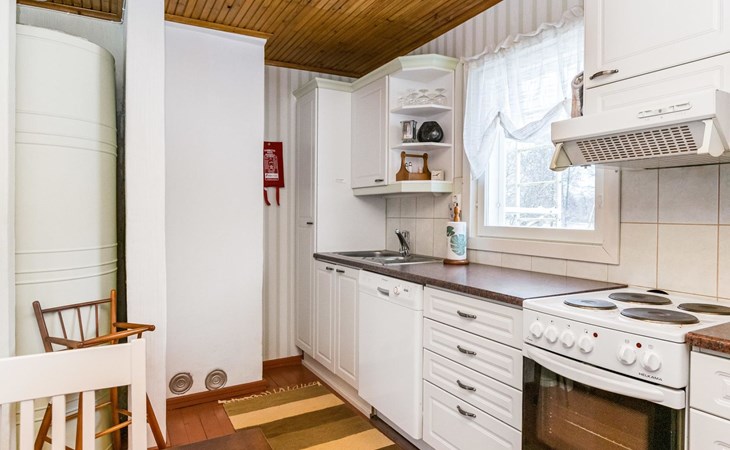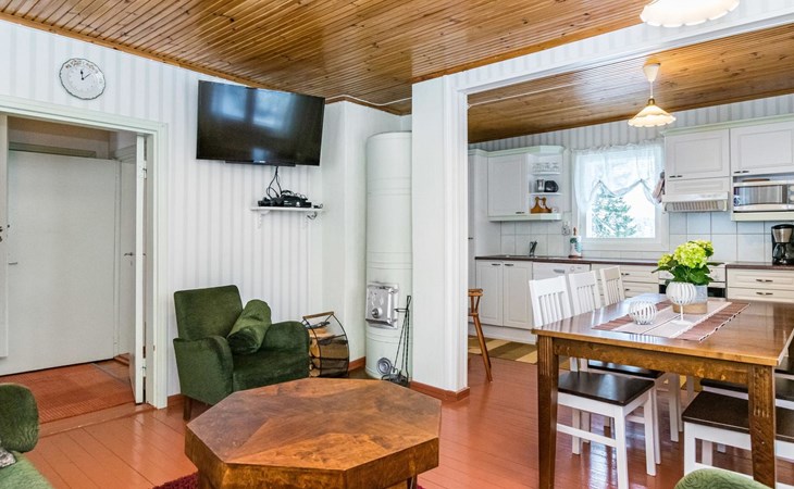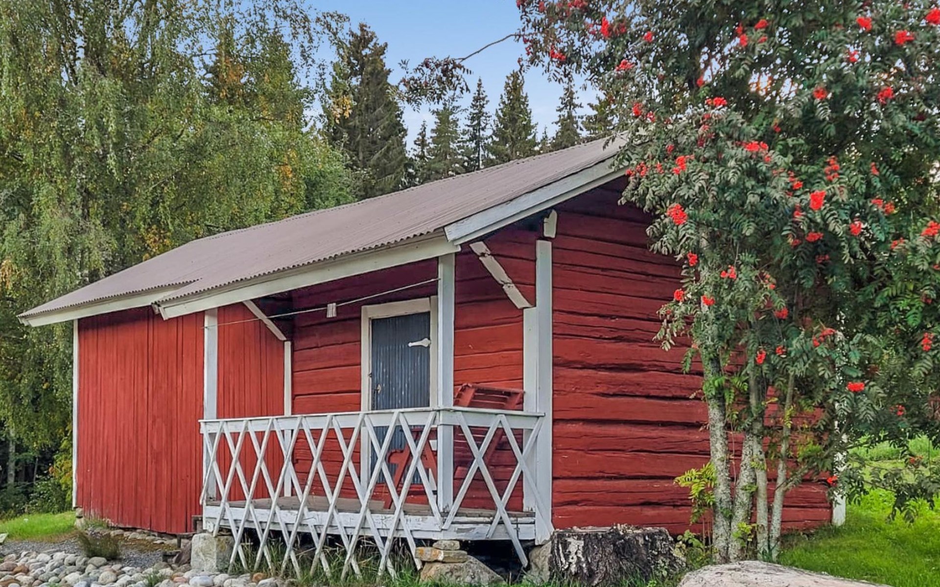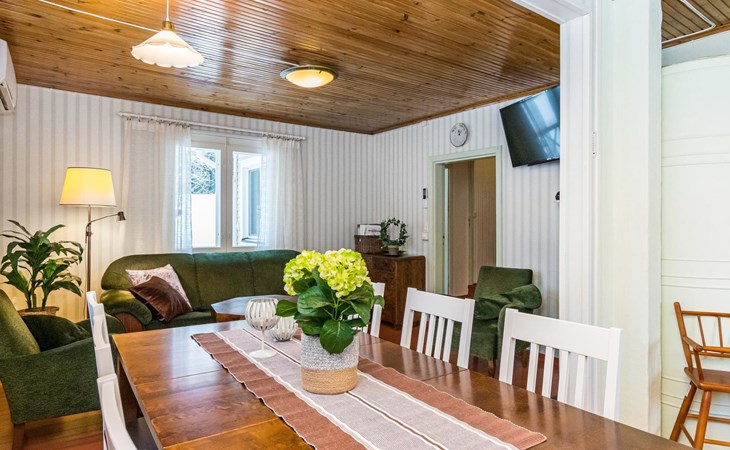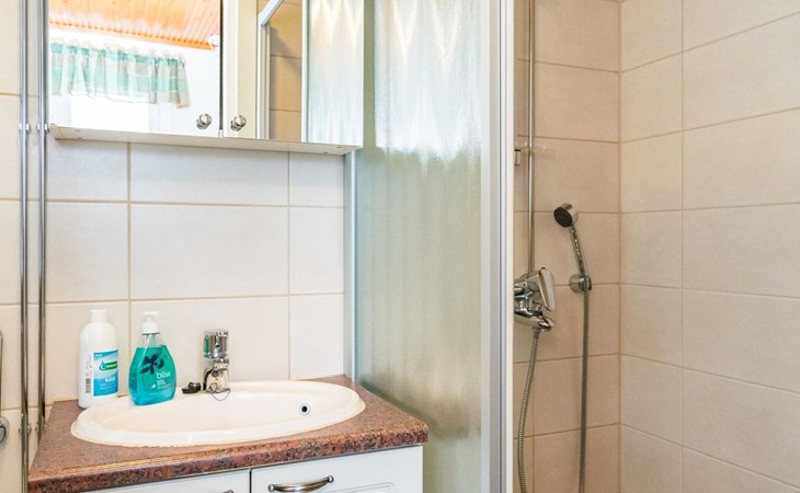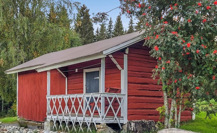 Wooden cabin 1955, renovated in 2008, living room/kitchen (22 m²) bedroom (9 m²) with two beds, washroom with shower and WC, lobby. Air source heat pump, open terrace.