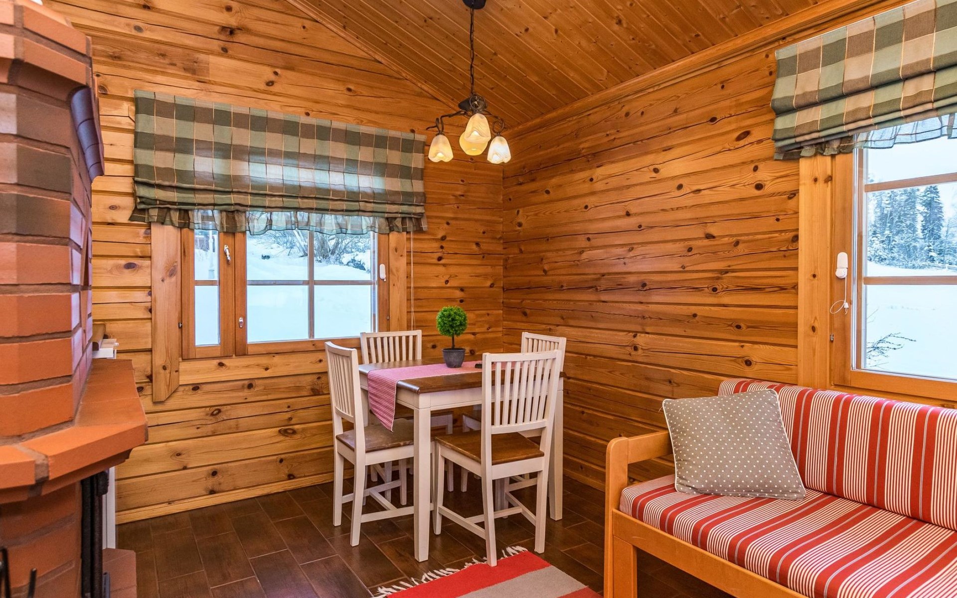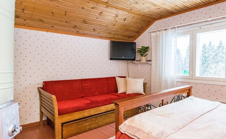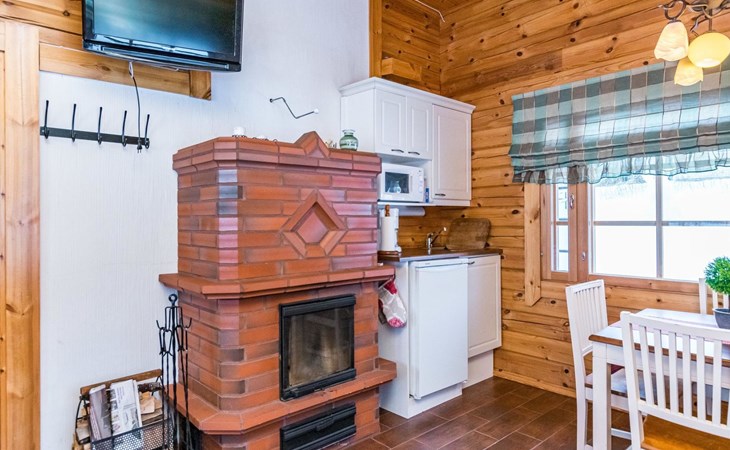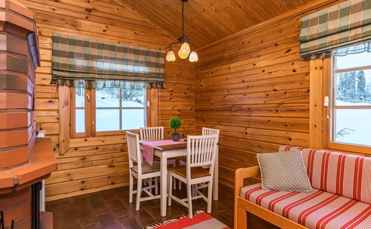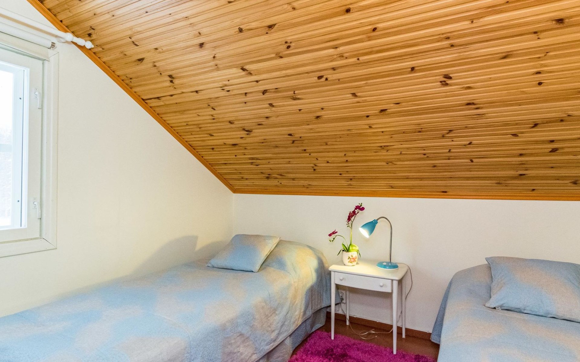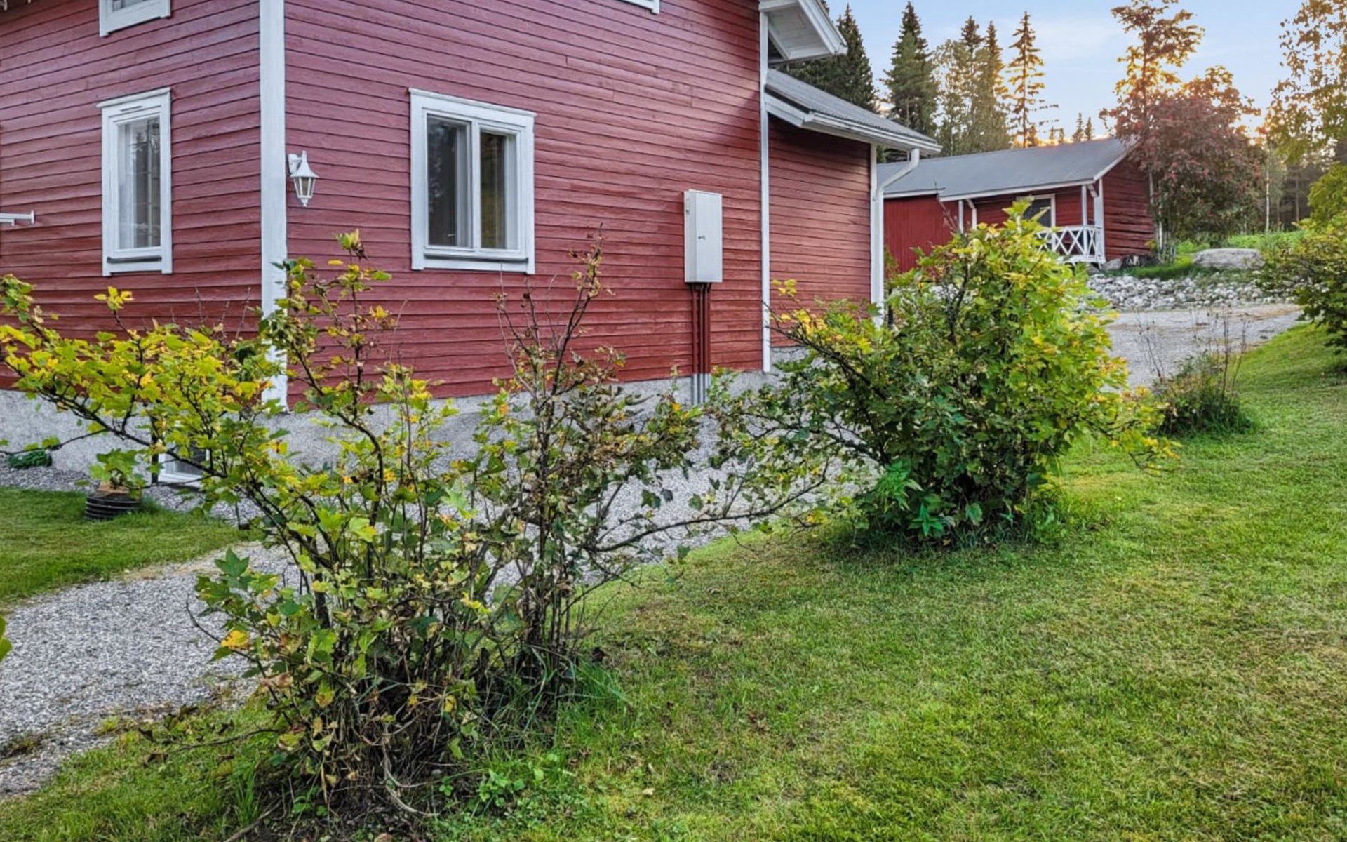 Wooden cabin 1955, renovated in 2008, living room/kitchen (22 m²) bedroom (9 m²) with two beds, washroom with shower and WC, lobby. Air source heat pump, open terrace.