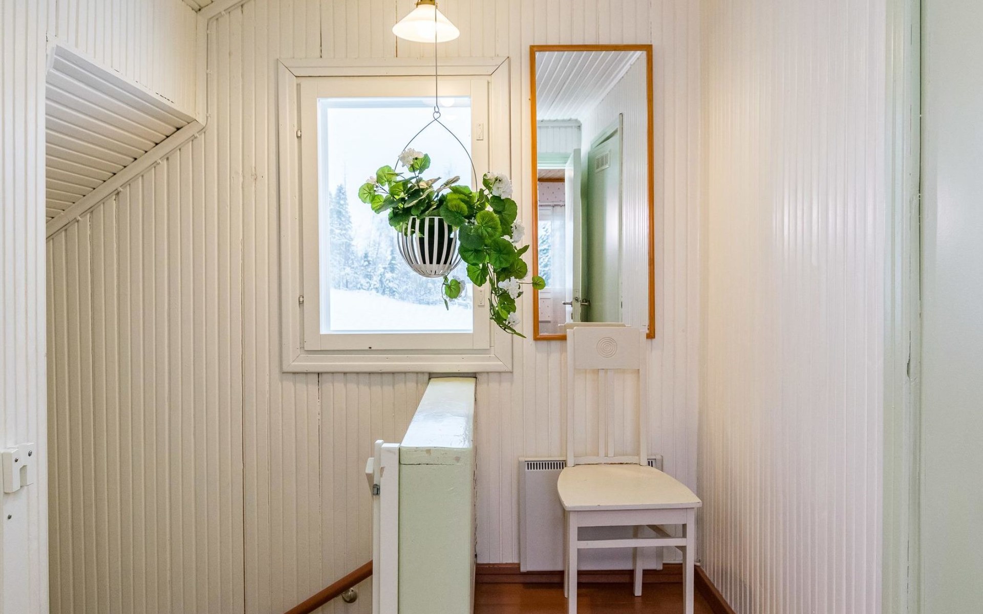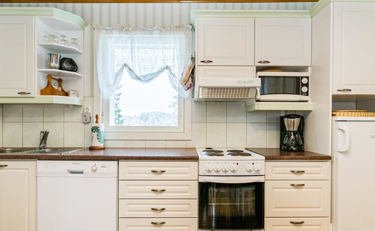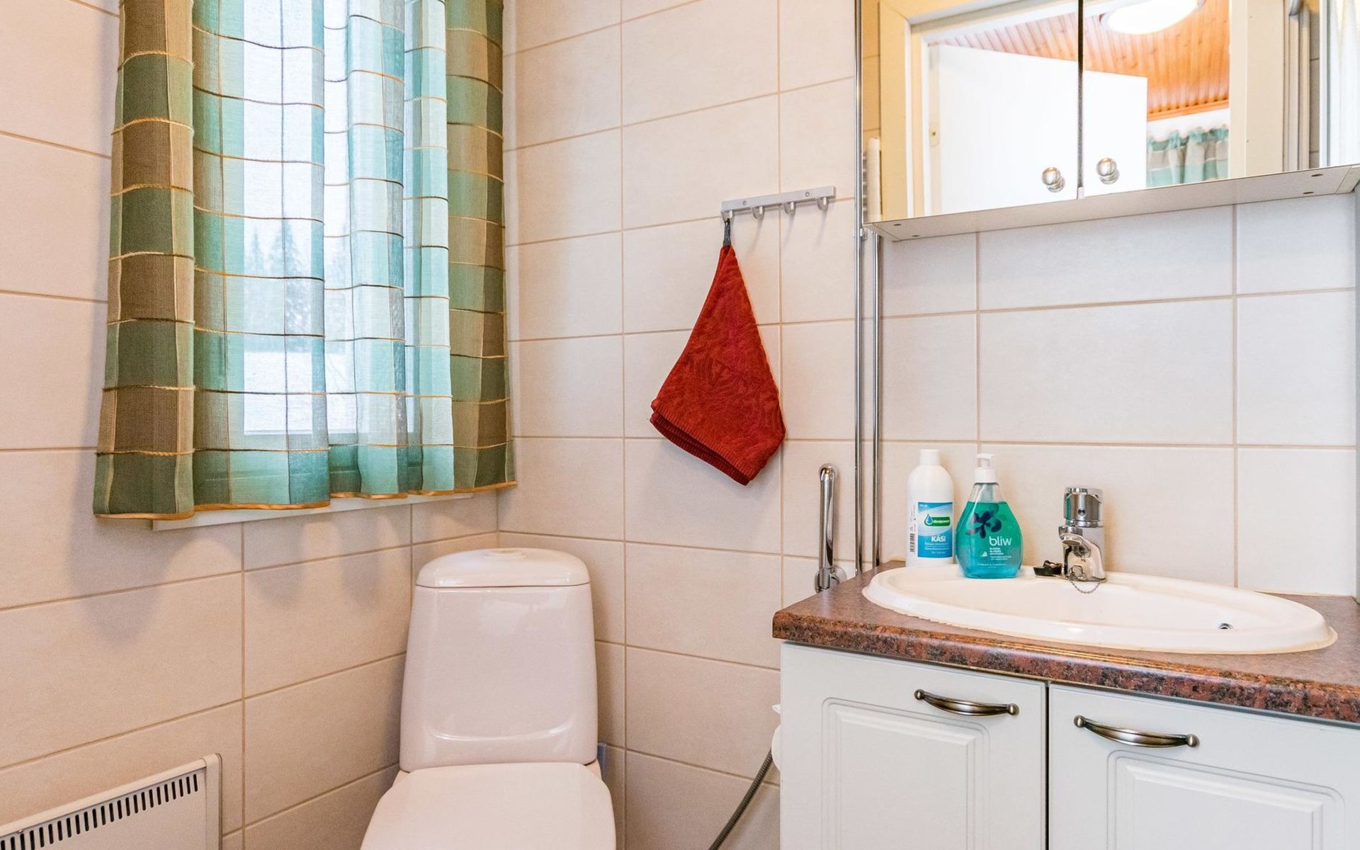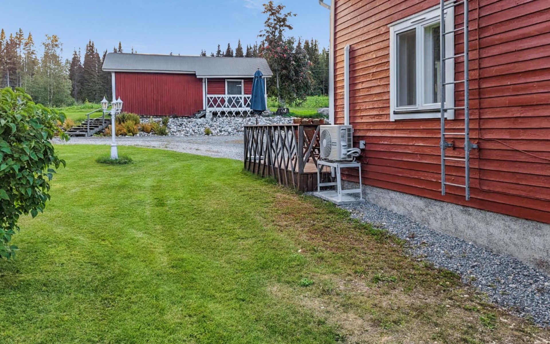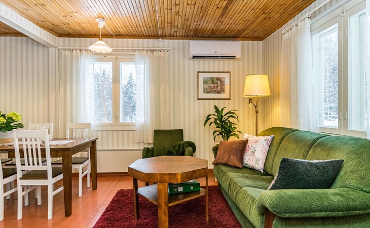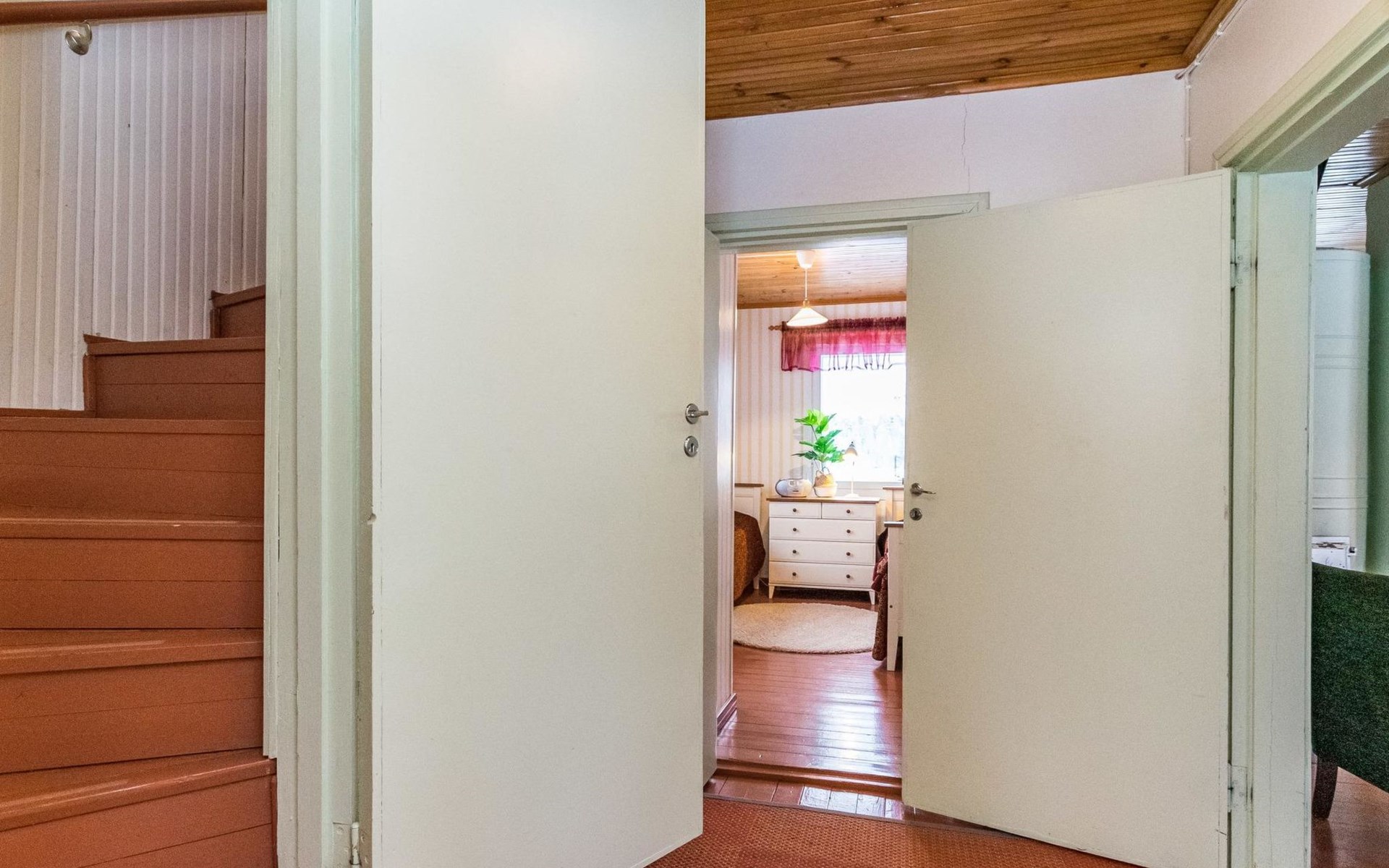 Wooden cabin 1955, renovated in 2008, living room/kitchen (22 m²) bedroom (9 m²) with two beds, washroom with shower and WC, lobby. Air source heat pump, open terrace.