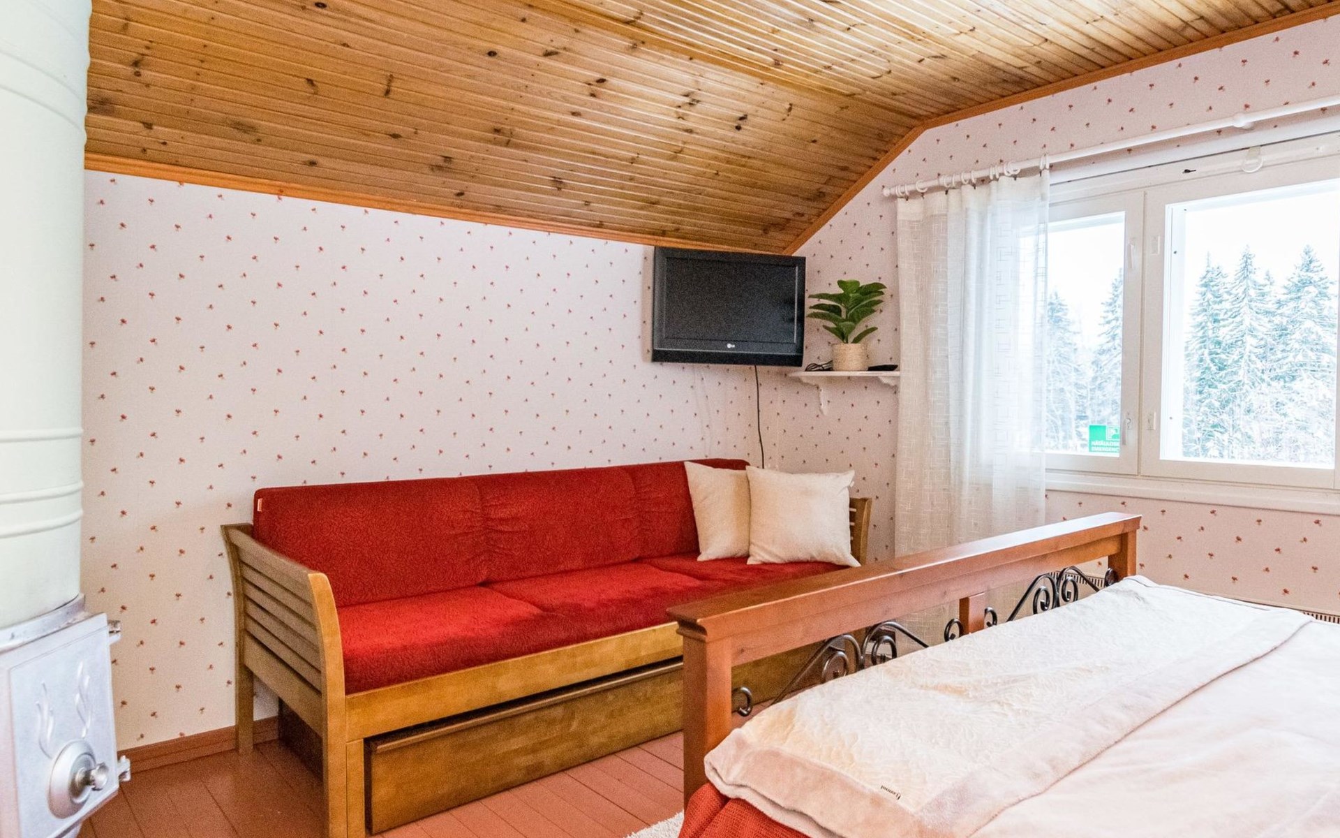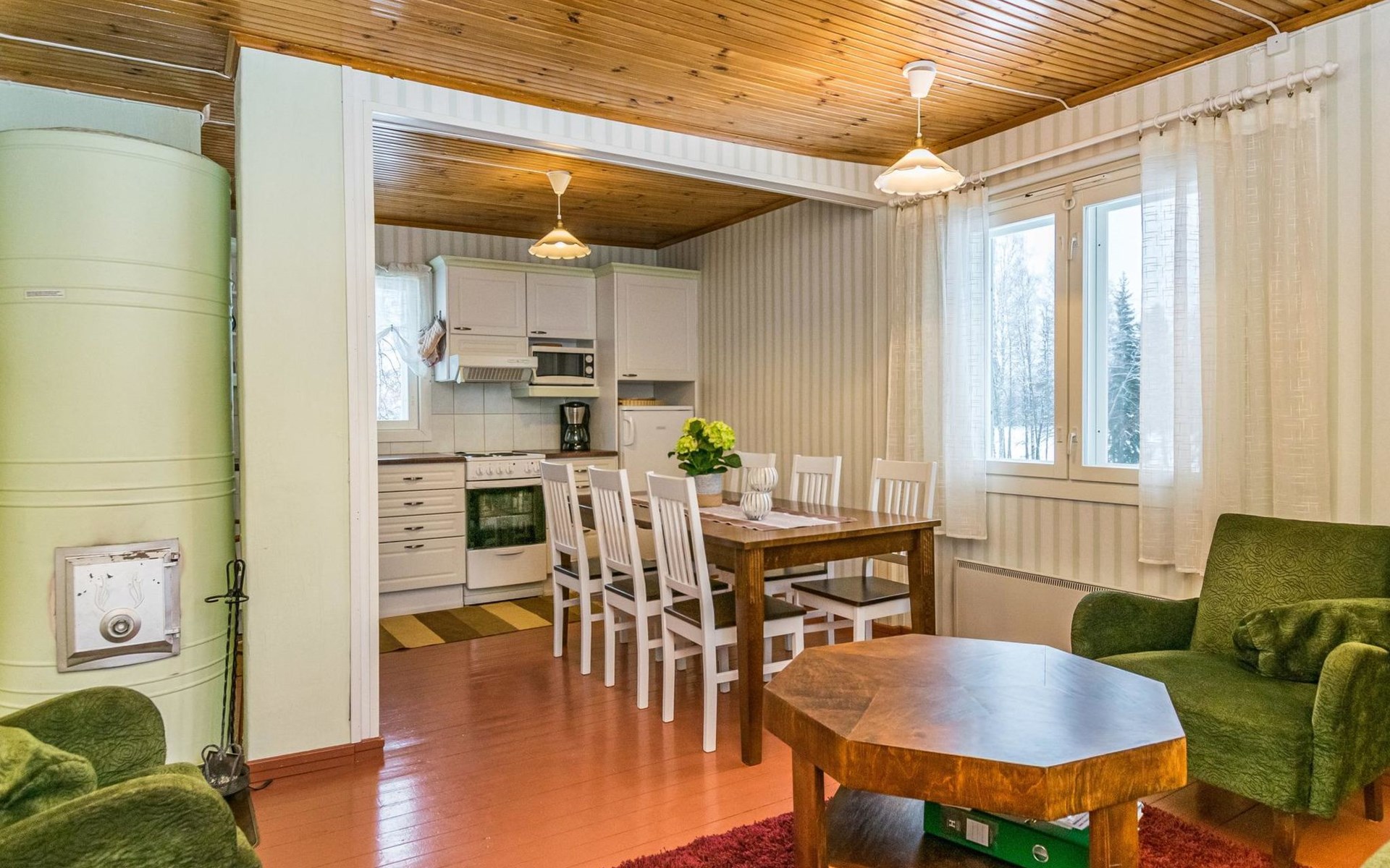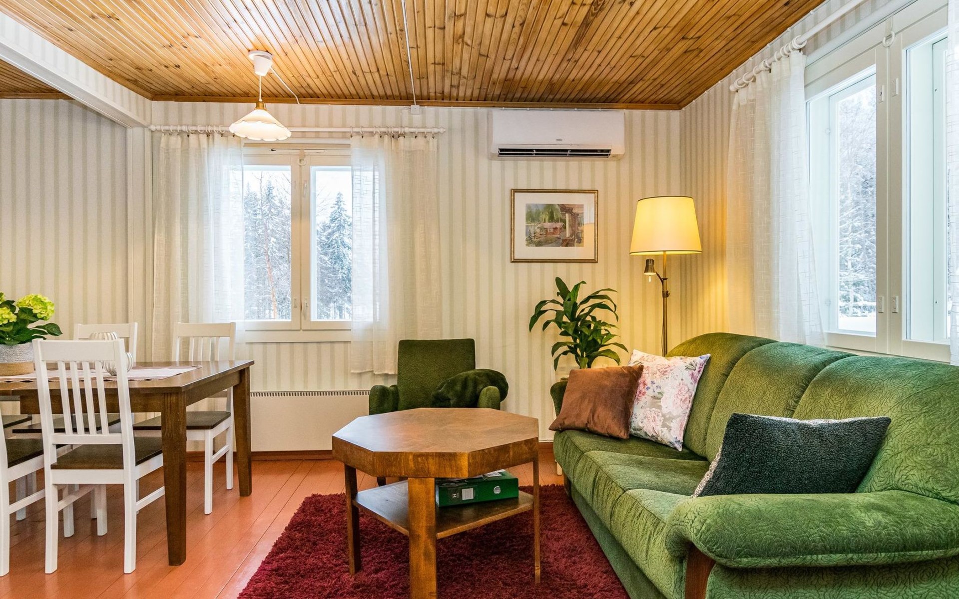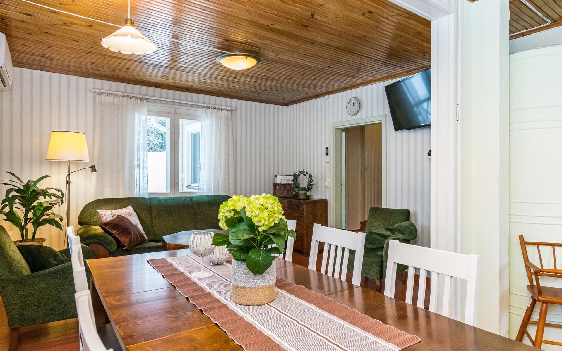Wooden cabin 1955, renovated in 2008, living room/kitchen (22 m²) bedroom (9 m²) with two beds, washroom with shower and WC, lobby. Air source heat pump, open terrace.