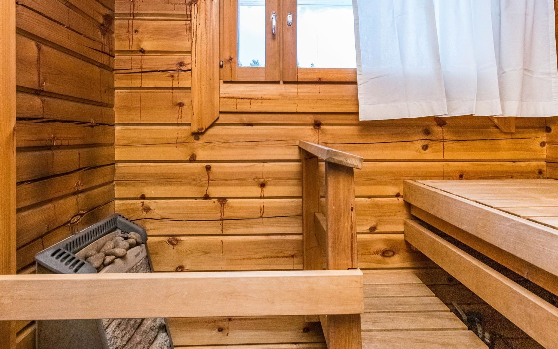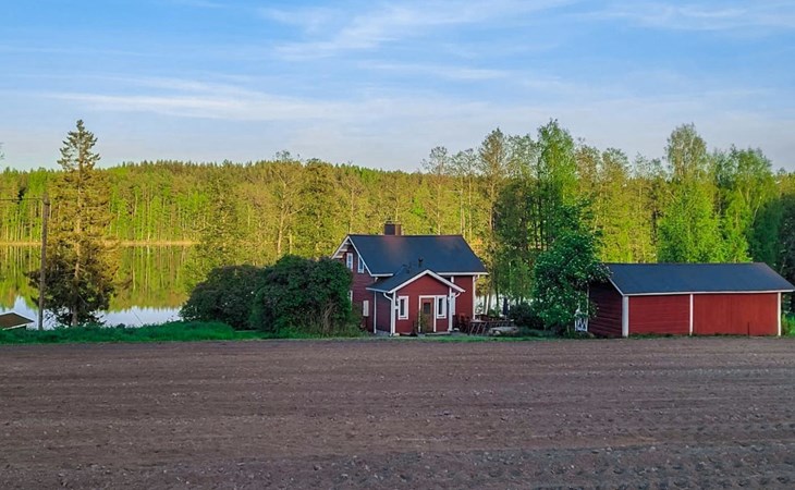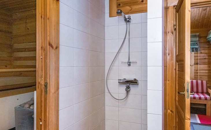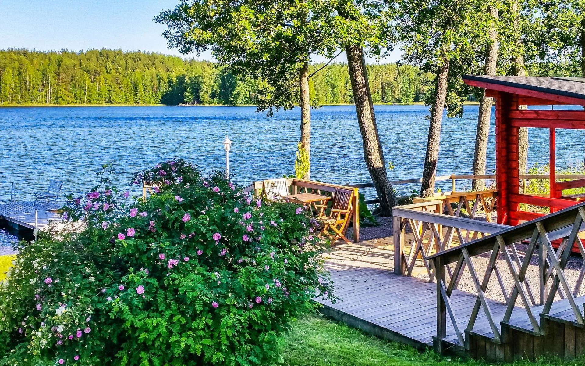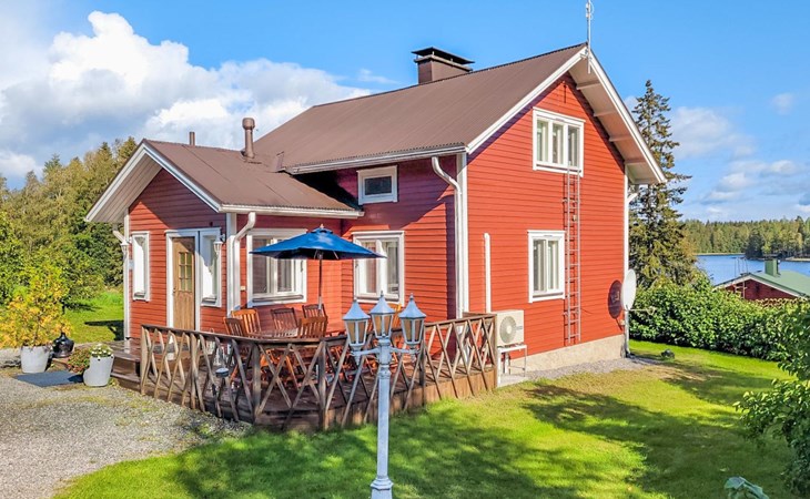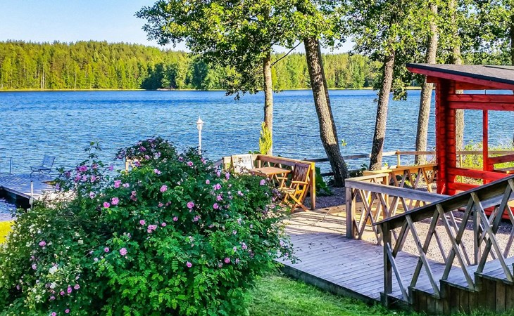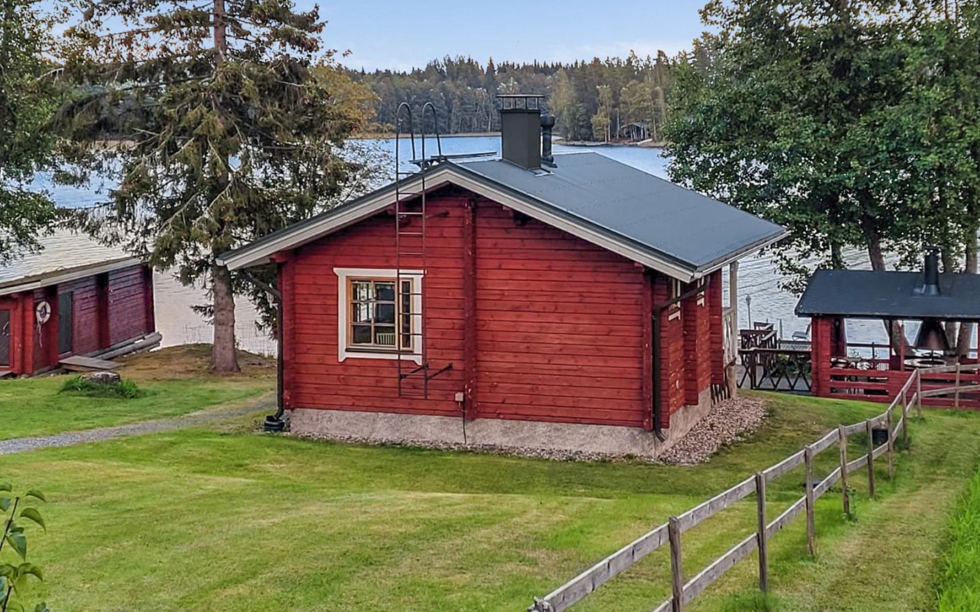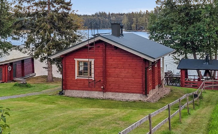 Lakeside sauna 2008 (21 m²), fireplace room with kitchenette, shower in washroom, wood-burning and electric sauna stove in sauna, covered terrace. Covered cooking area and terrace on the beach.