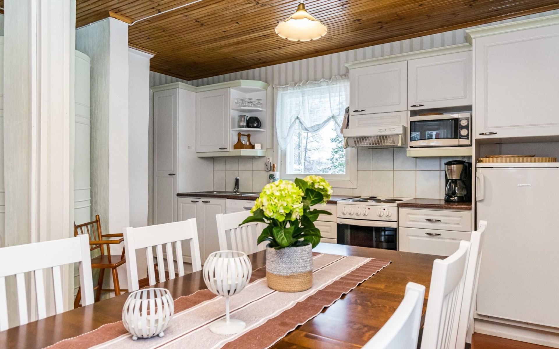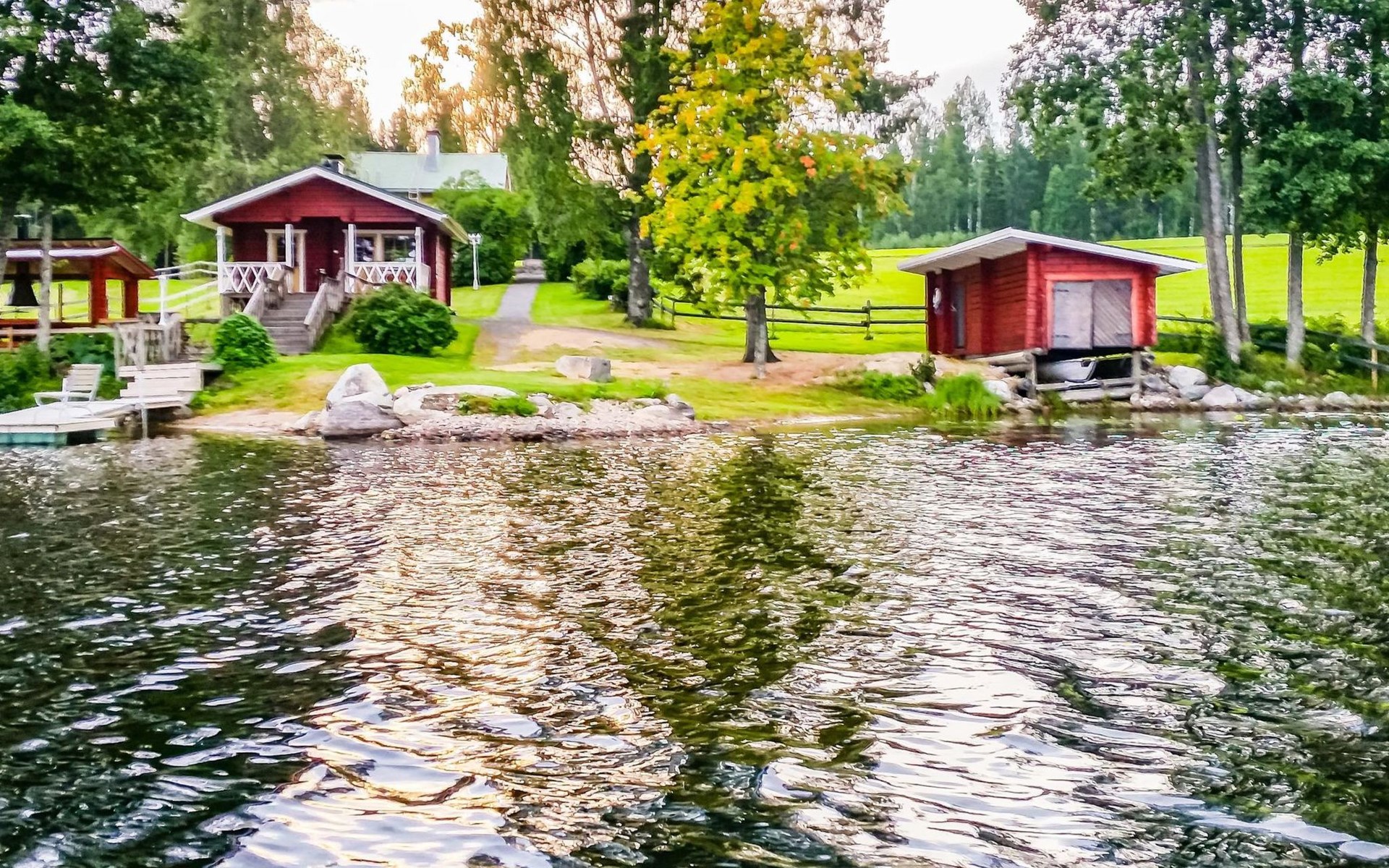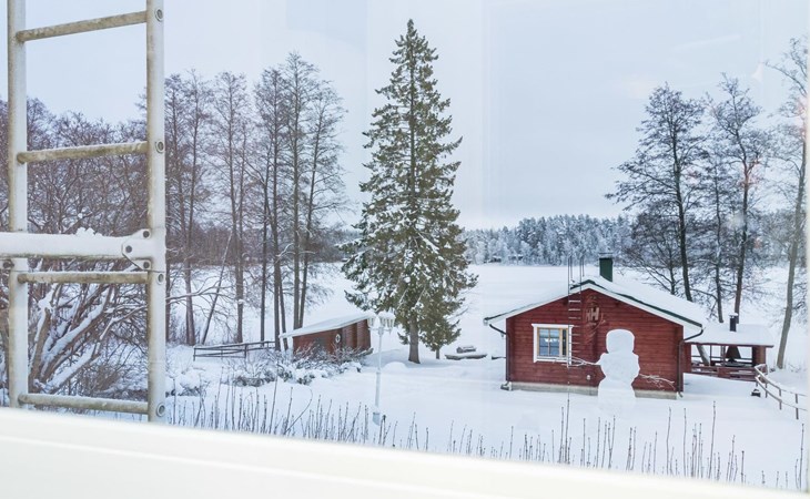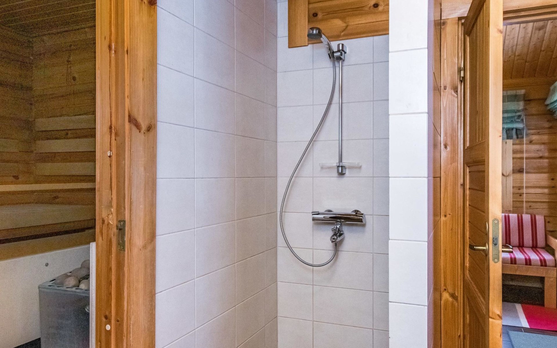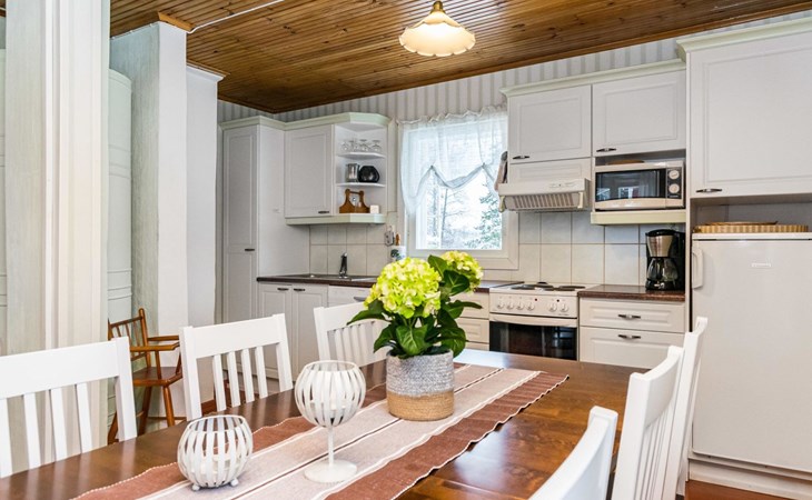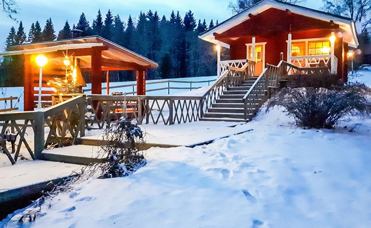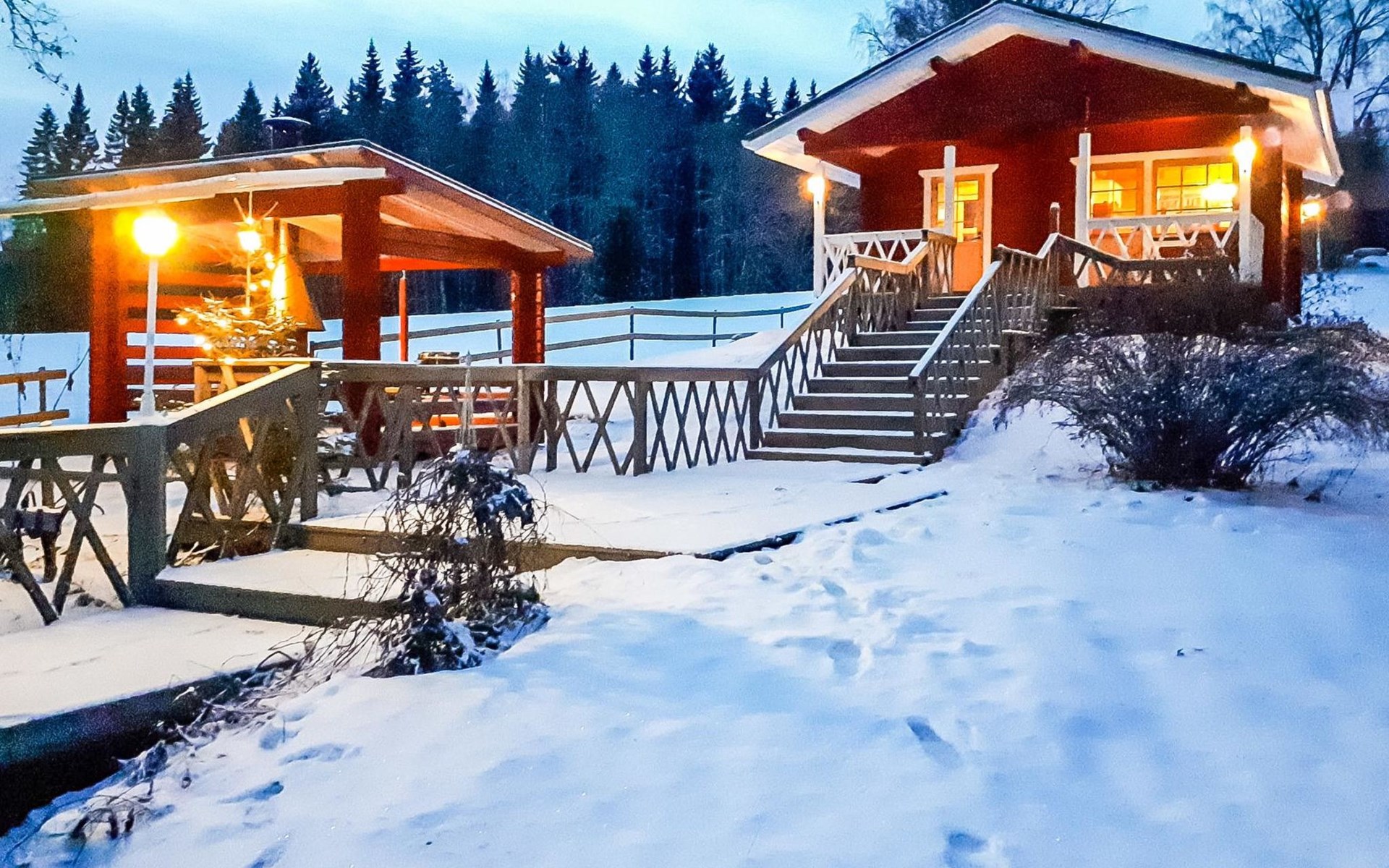 Lakeside sauna 2008 (21 m²), fireplace room with kitchenette, shower in washroom, wood-burning and electric sauna stove in sauna, covered terrace. Covered cooking area and terrace on the beach.
