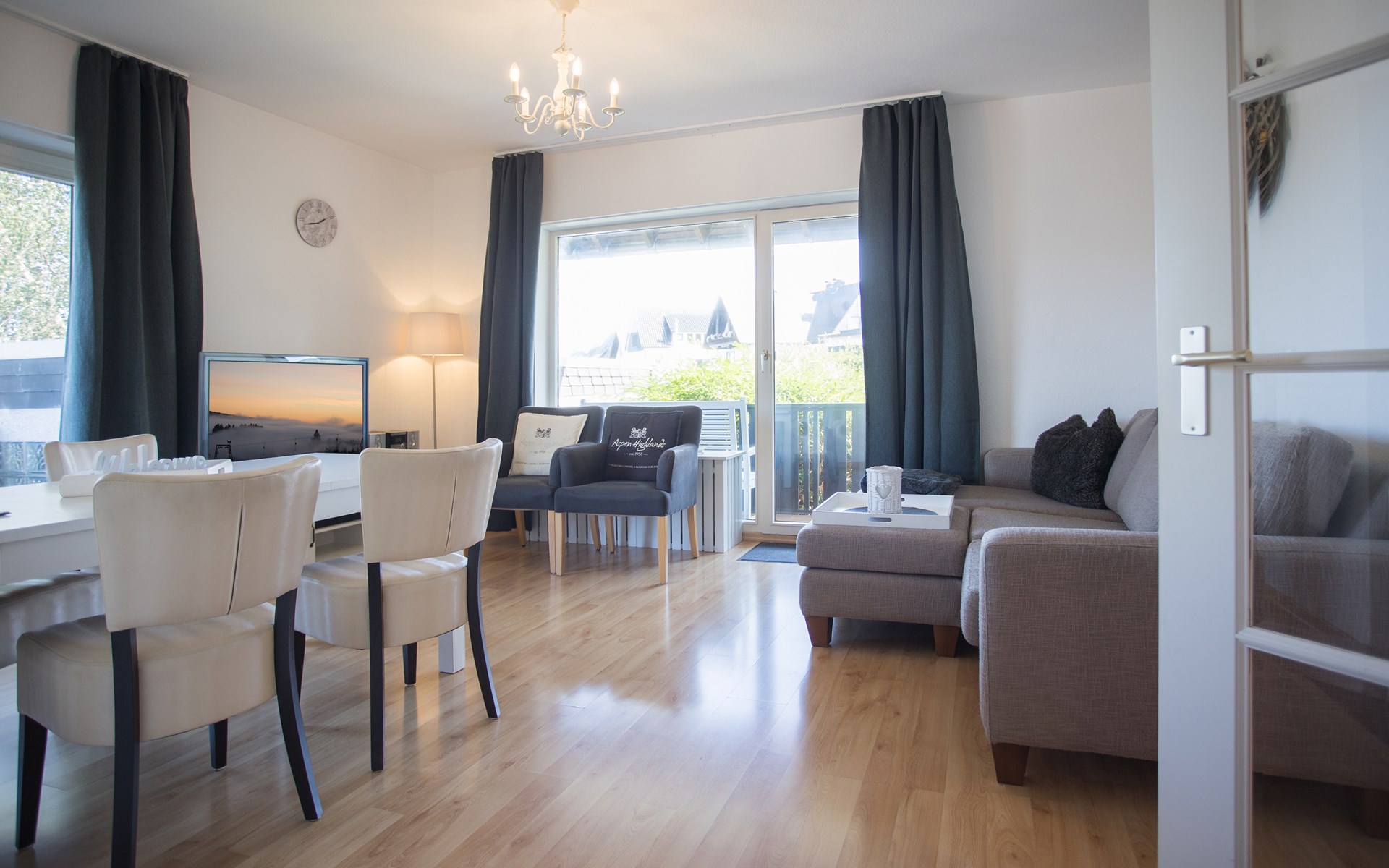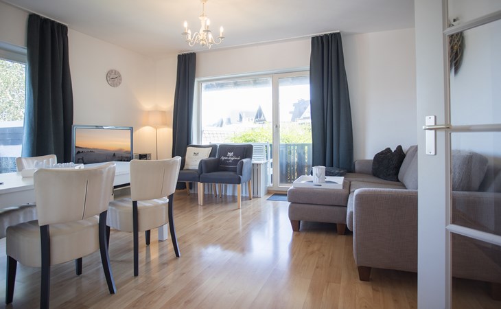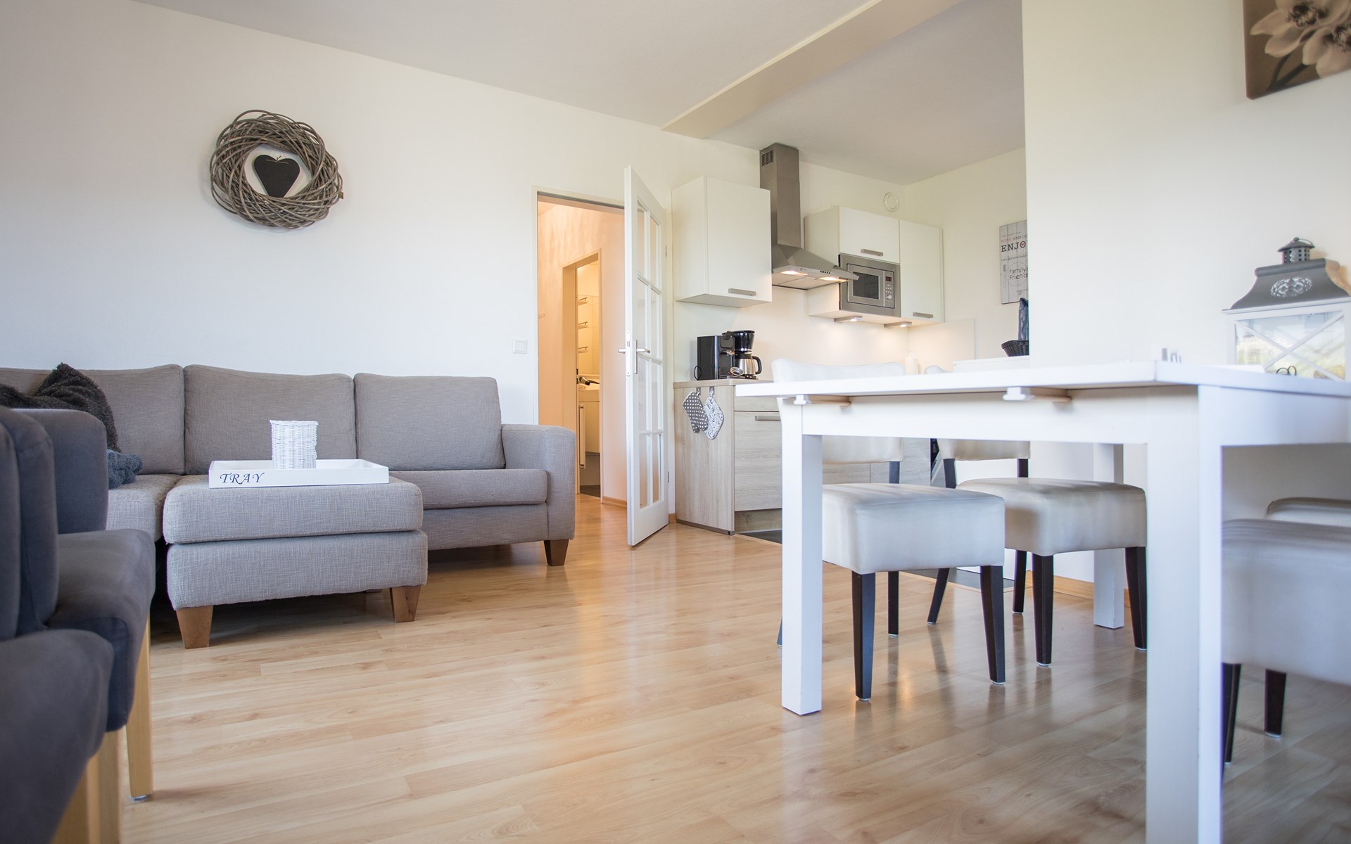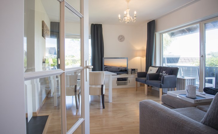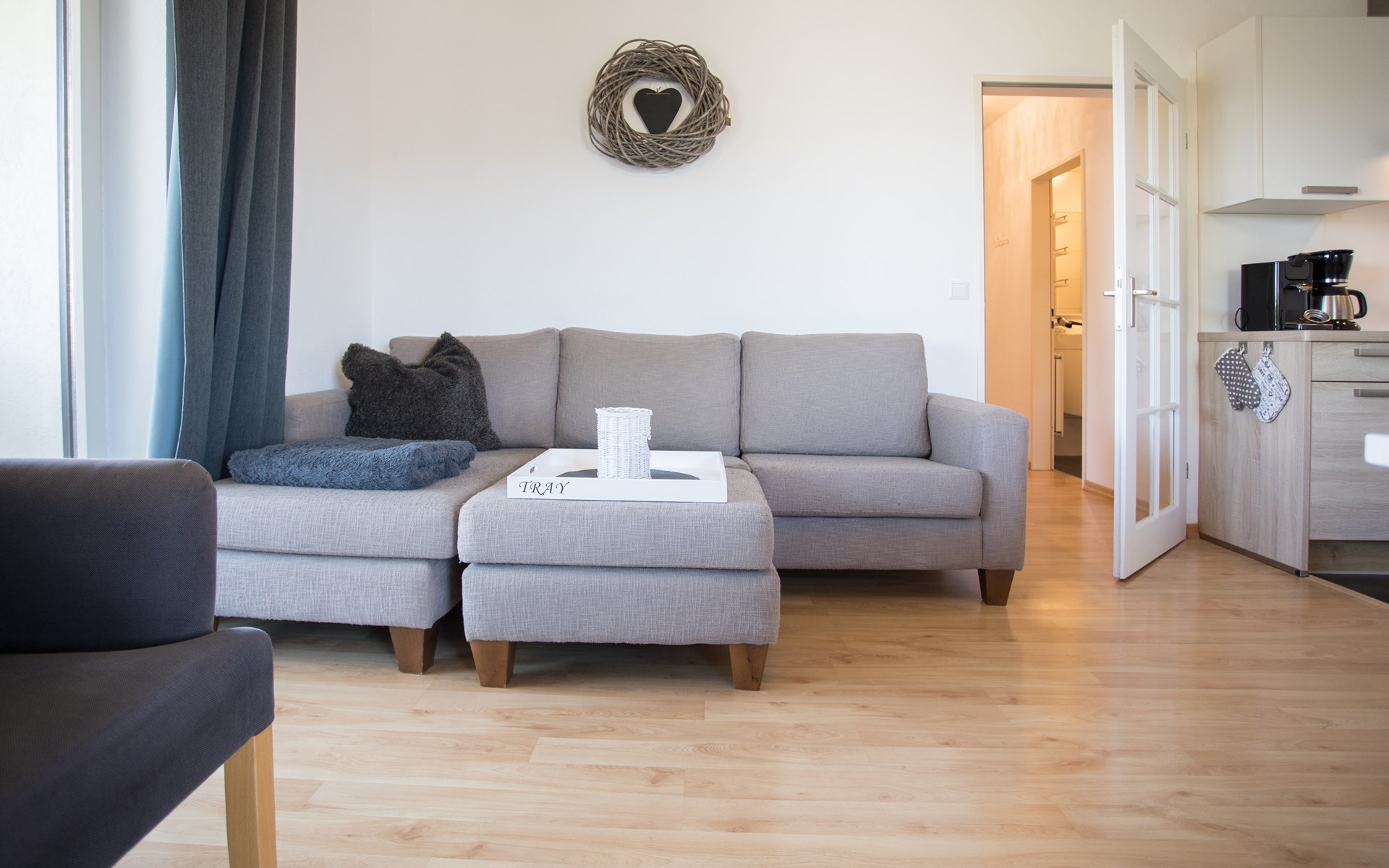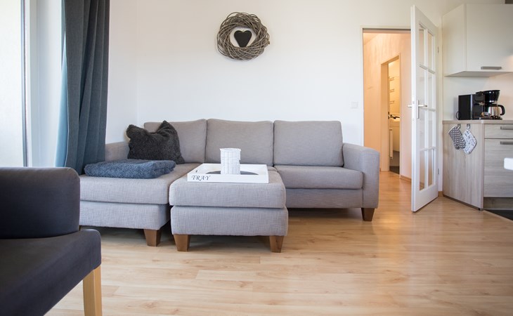 In de gezellige woonkamer vind je een comfortabele hoekbank, twee fauteuils en een hocker die dienst doet als salontafel. Hier kun je heerlijk ontspannen voor de televisie of genieten van elkaars gezelschap.