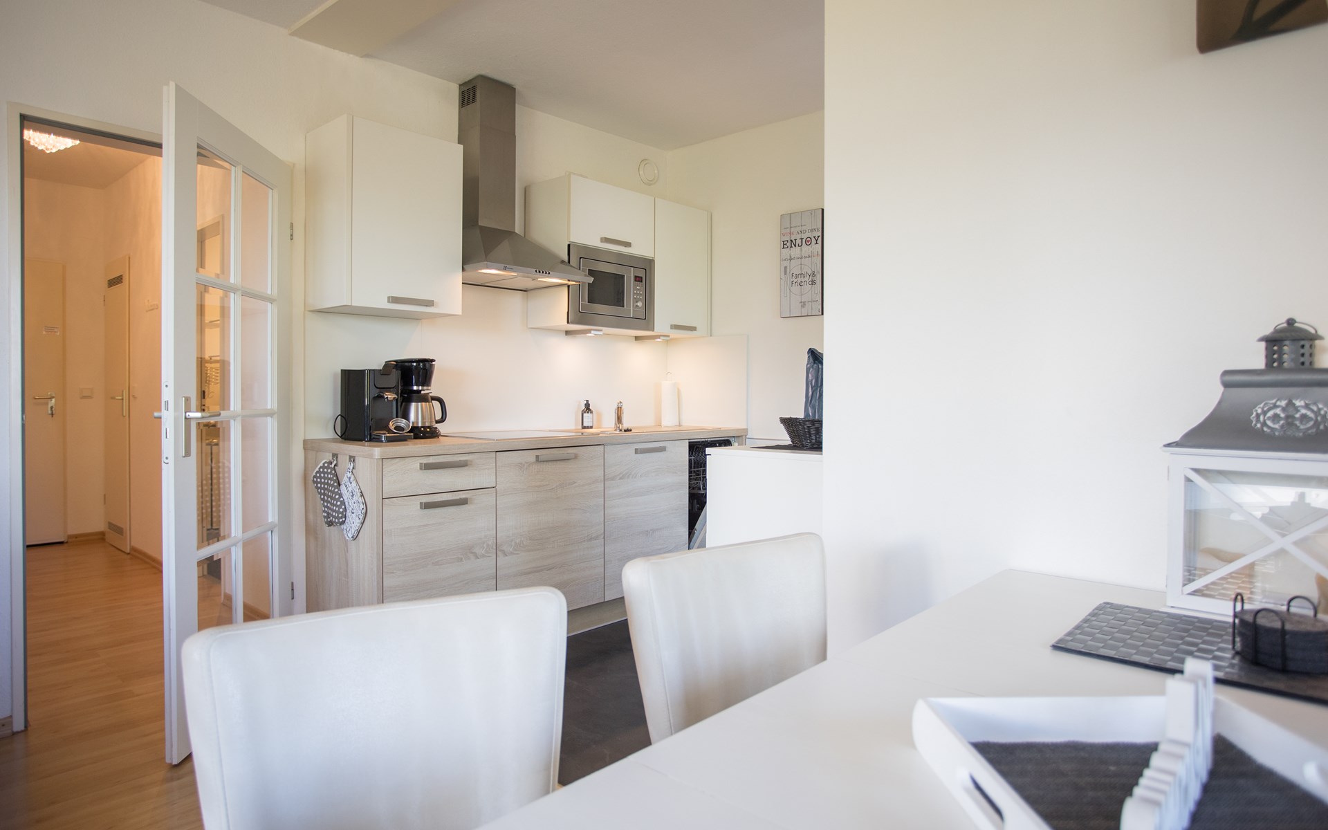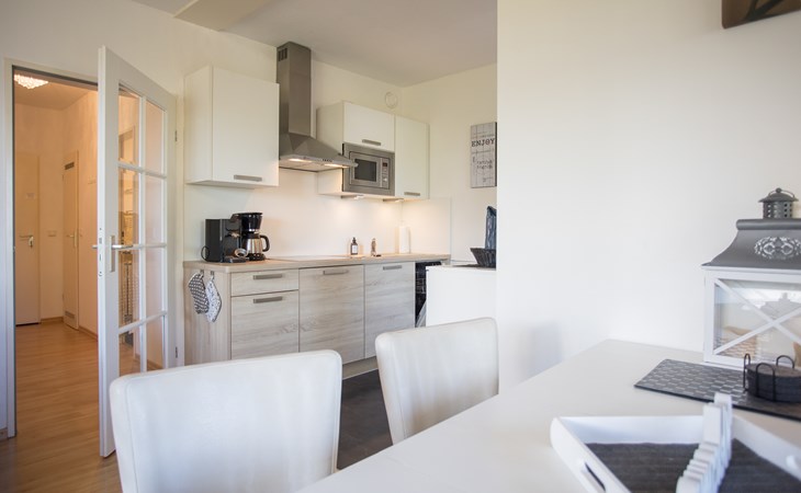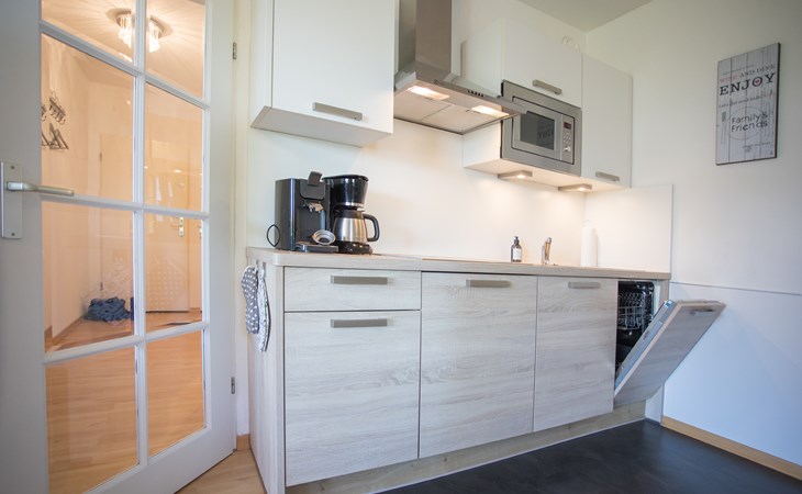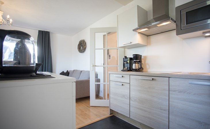 De open keuken is een fijne plek voor kookliefhebbers. Met alle denkbare apparatuur, kookplaat, vaatwasser, koelkast met vriesvak, magnetron met grillfunctie, broodrooster, tosti-ijzer en veel extra kookgerei bereid je moeiteloos de lekkerste maaltijden.