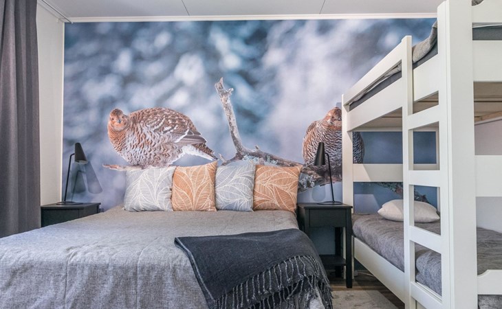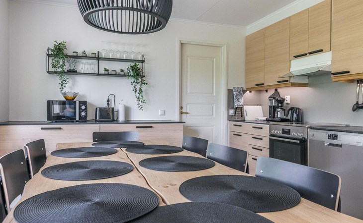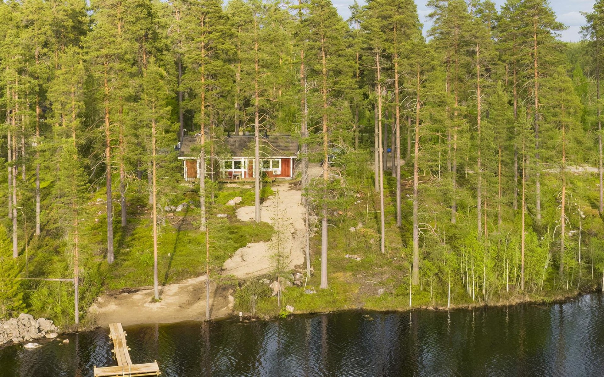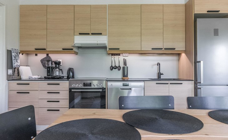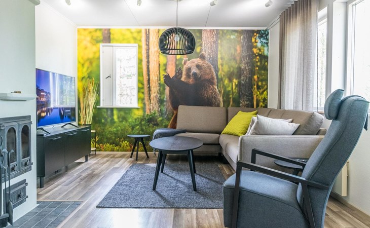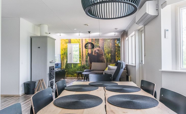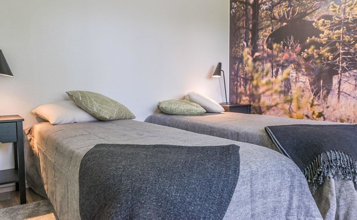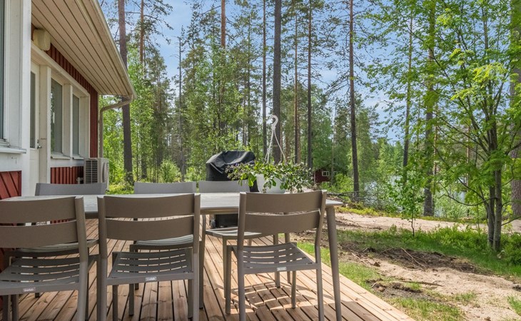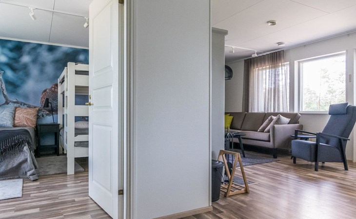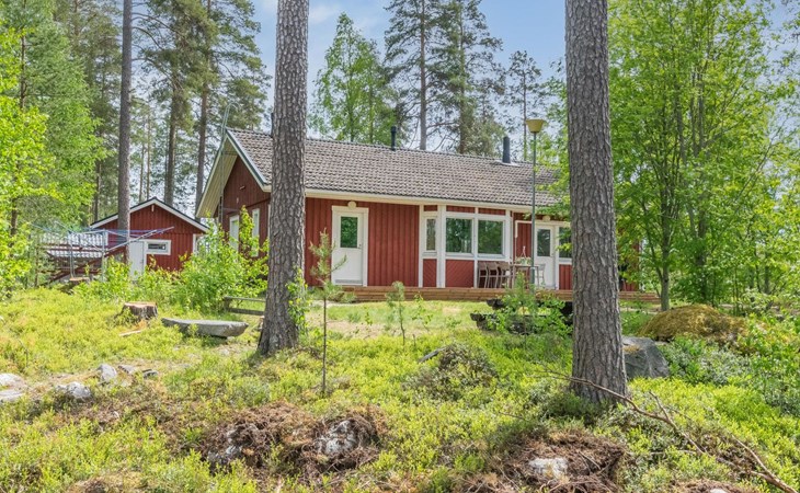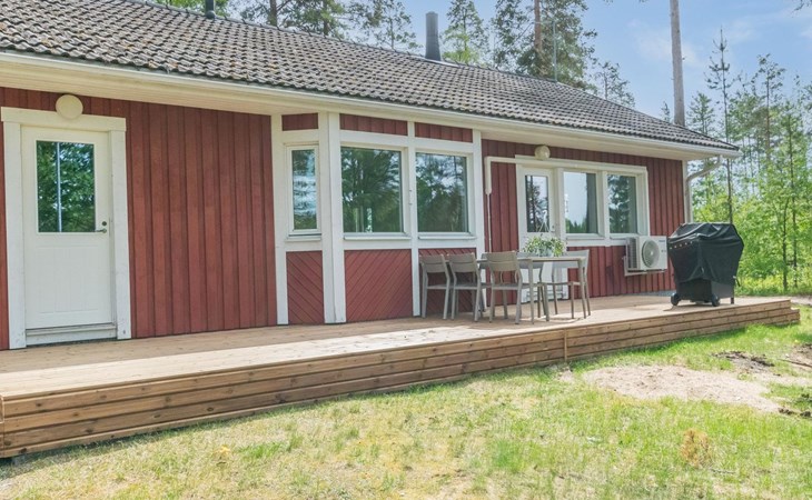 Wooden cabin 1991, bedroom 1: 2 beds and bunk bed 80x200 cm, bedroom 2: 2 beds, living room with fireplace in the TV corner, dining group for eight people, well-equipped kitchenette, sauna (electric sauna stove), washroom with shower and washing machine, terrace with a gas grill and garden furniture.