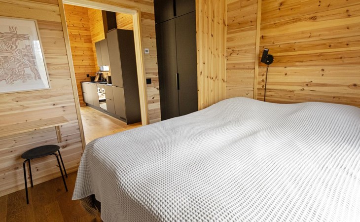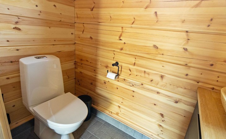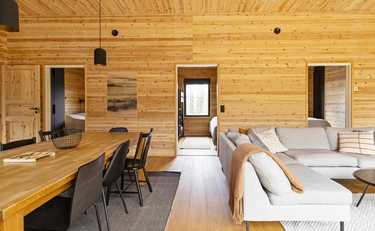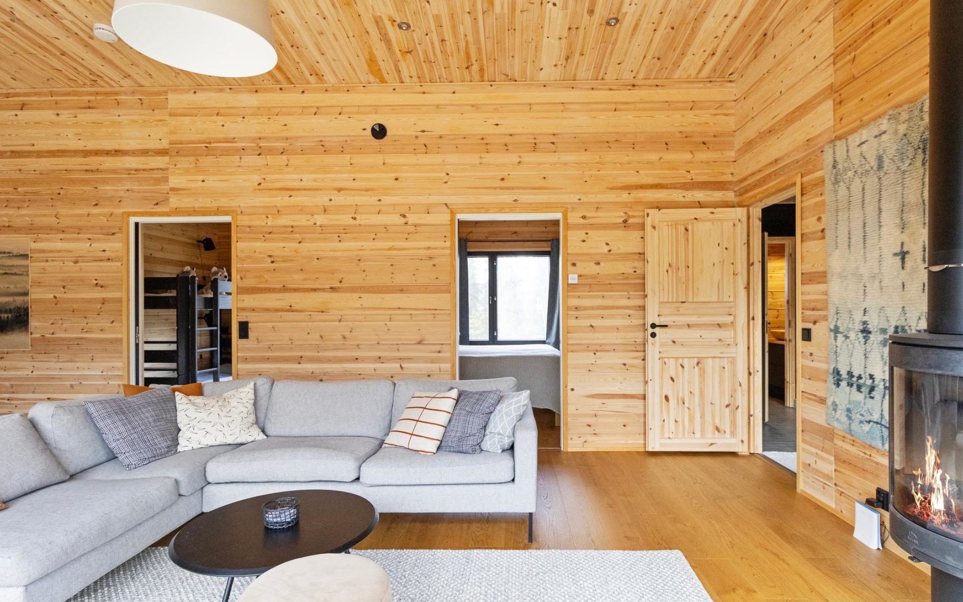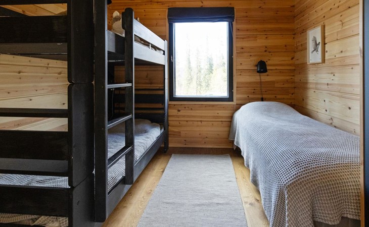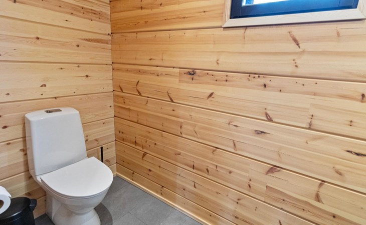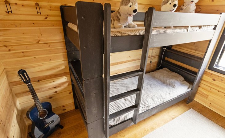 The cabin has three bedrooms with beds for seven. Blackout curtains in the bedrooms. One bedroom has a double bed, the second bedroom has 2 separate beds, and the third bedroom has a bunk bed and 1 separate bed. Large living room/kitchen, two WCs, spacious hall, dressing and housekeeping room, shower and sauna.