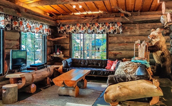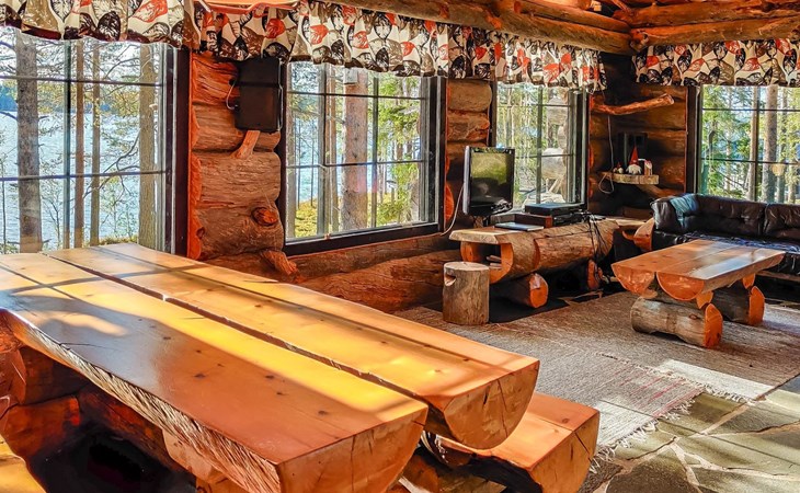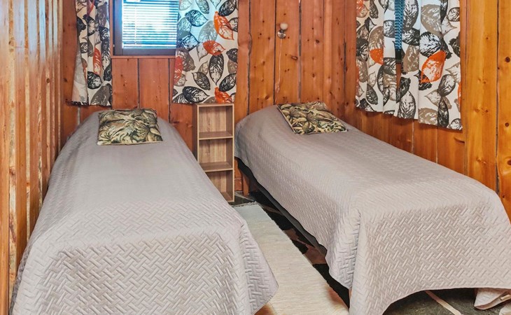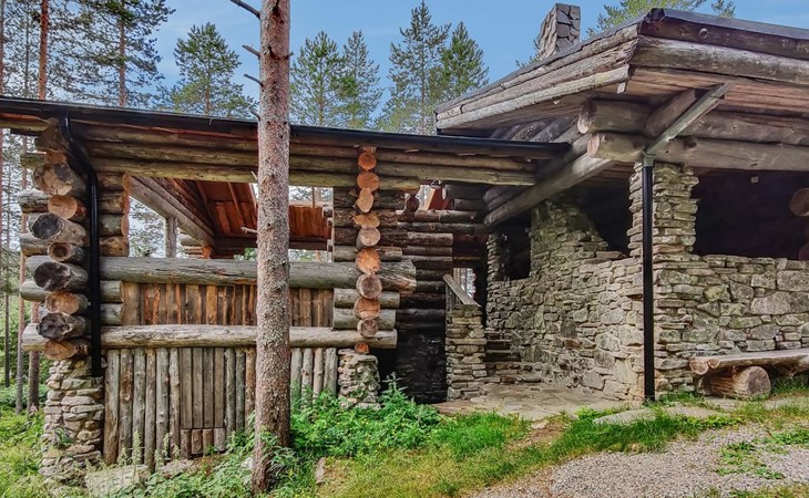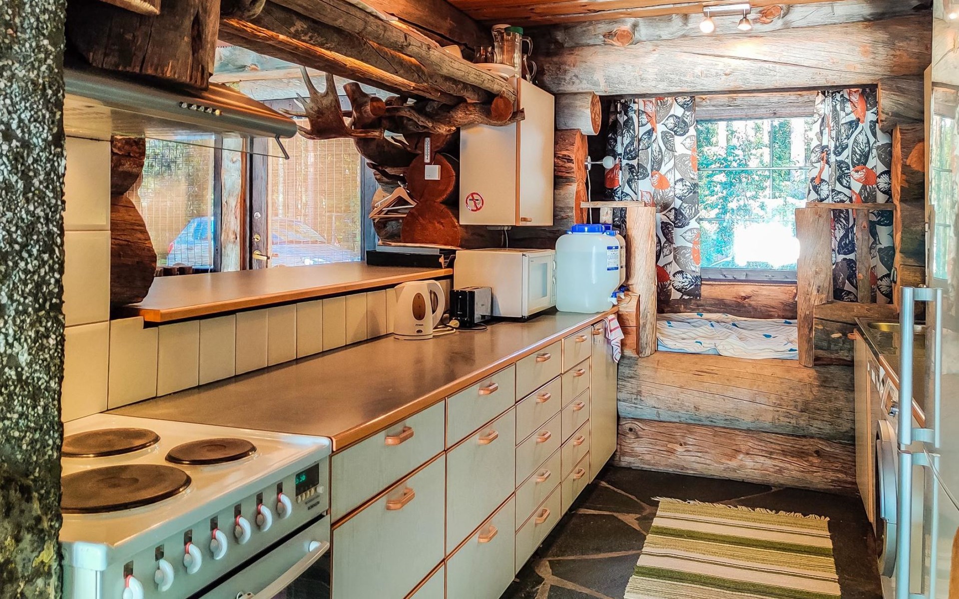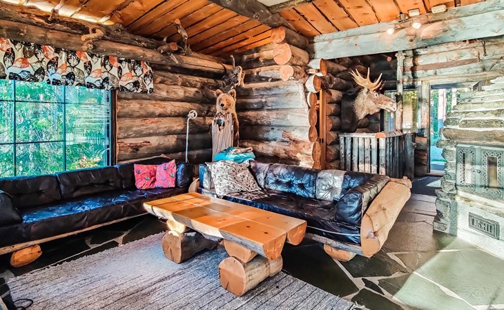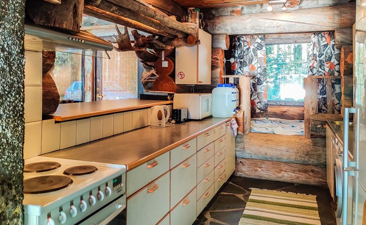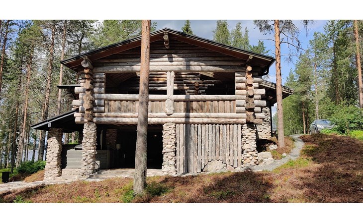2-storey silverlog cottage 1993, kitchen, living room, bedroom double bed (width 160 cm), sleeping alcove 1 bed (120 cm wide), open porch, downstairs: bedroom 2 beds (width á 100 cm) + 1 bed (width á 80 cm), bedroom 2 beds (width á 100 cm), room with fireplace sofabed (width 160 cm), washroom, sauna ('ever-ready' elec. stove). There are 5 fireplaces in the cottage! Snowmobile port.