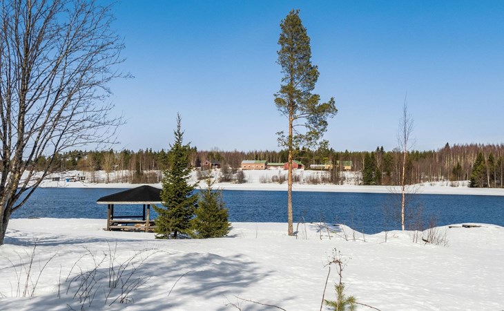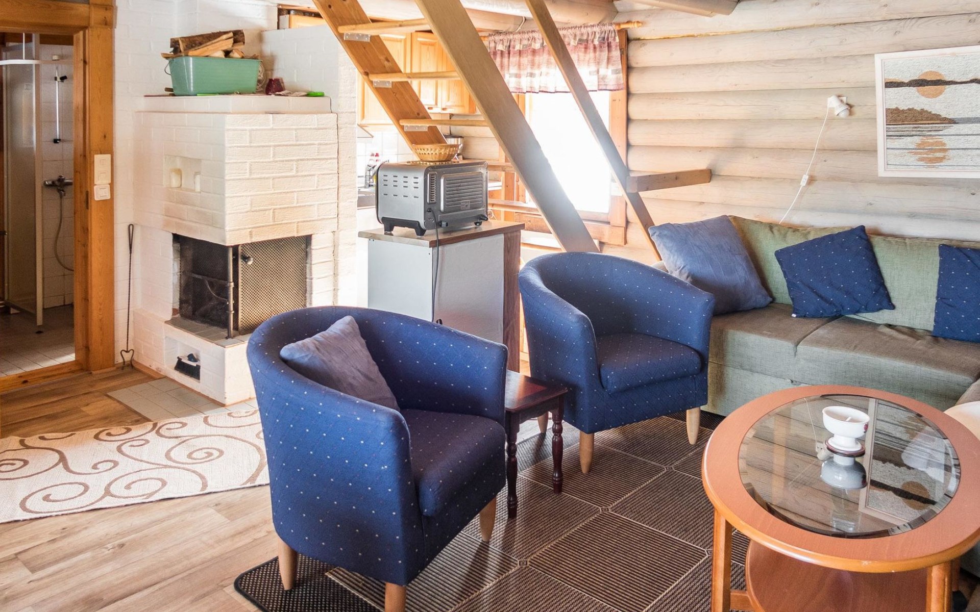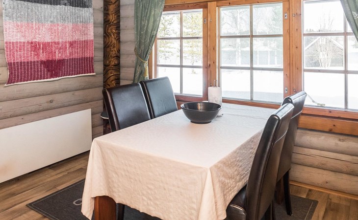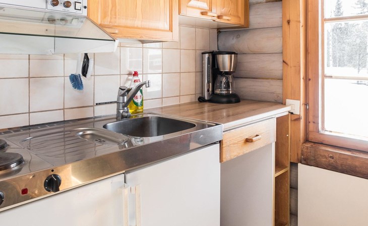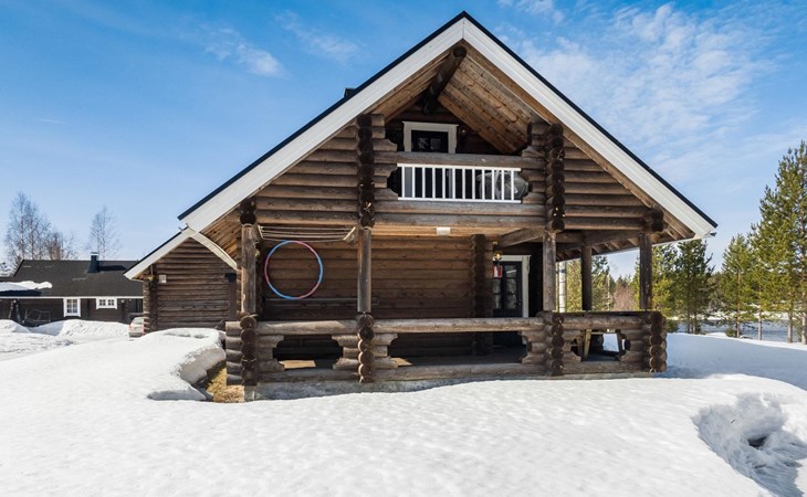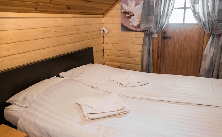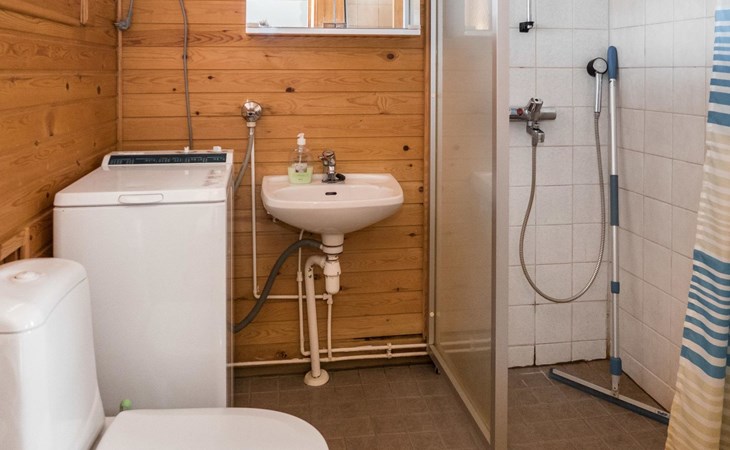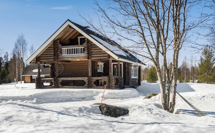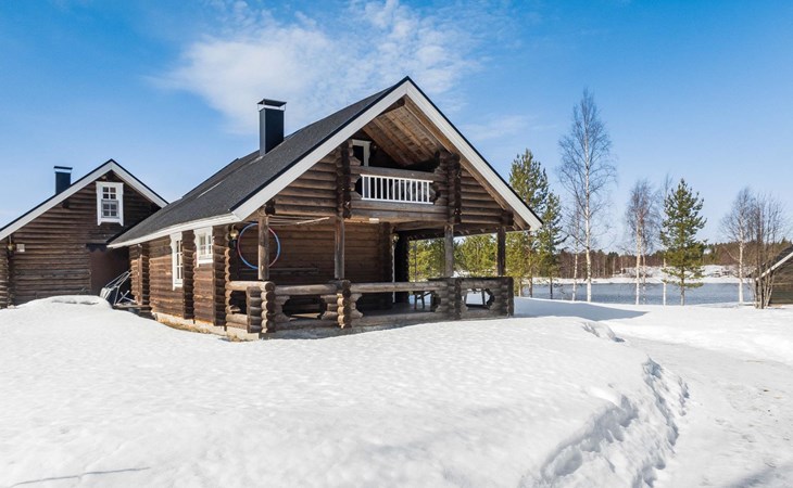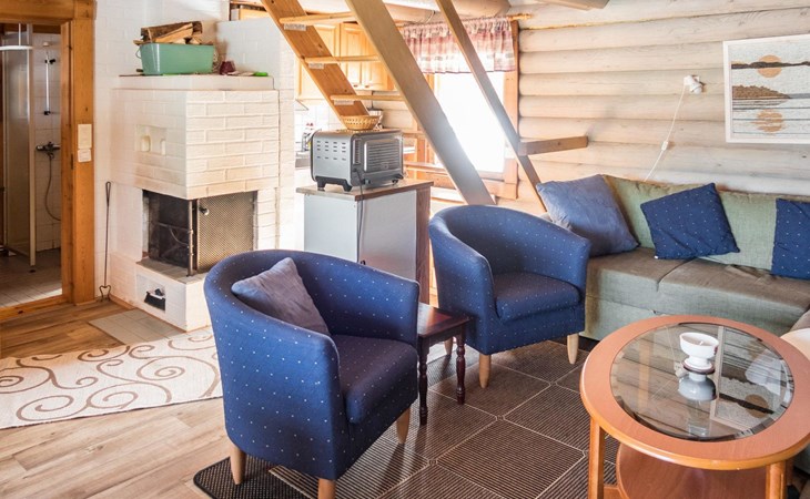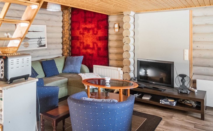 Vuokatticottage F living area 57 m², on two floors. Kitchenette, bright living room with dining table, sofa, TV 42 ", fireplace. Shower/toilet, sauna with electric stove. Loft with steep stairs, small lobby with access to both bedrooms, one with double bed (access to balcony), one with twin beds for 2. Small terrace.
