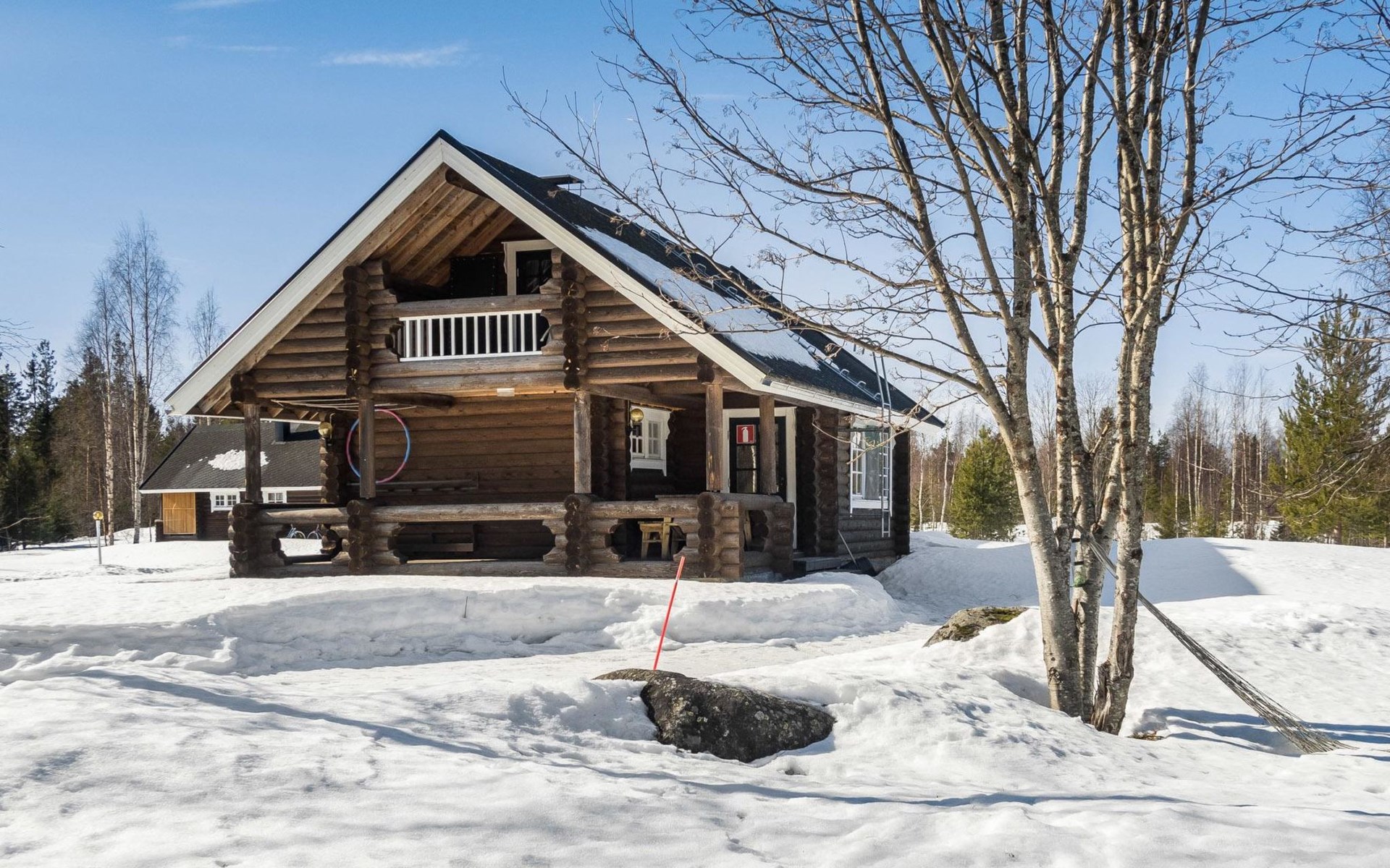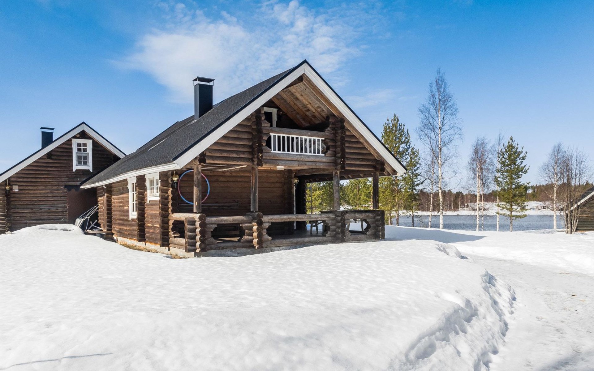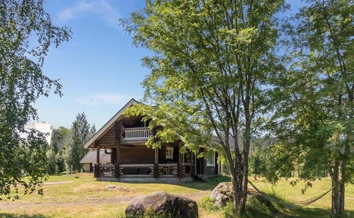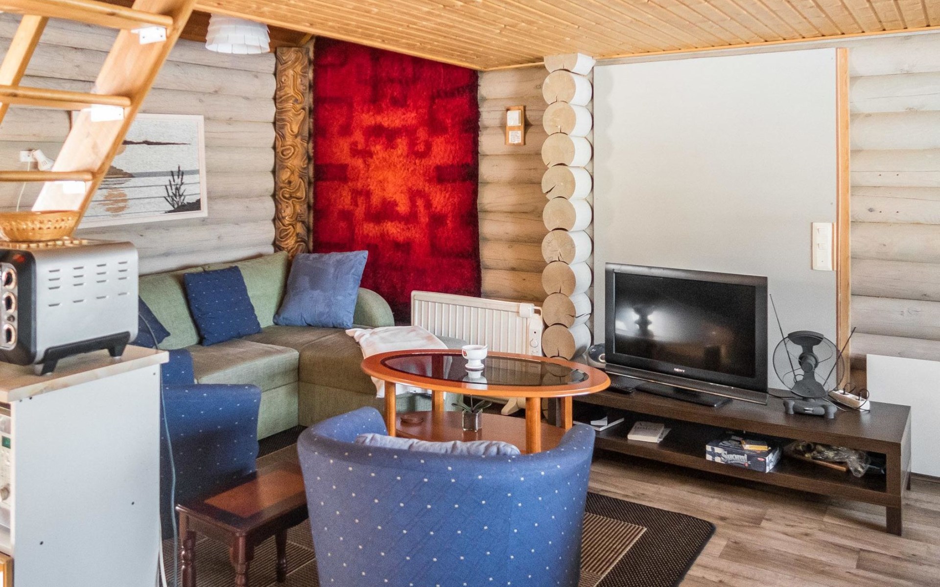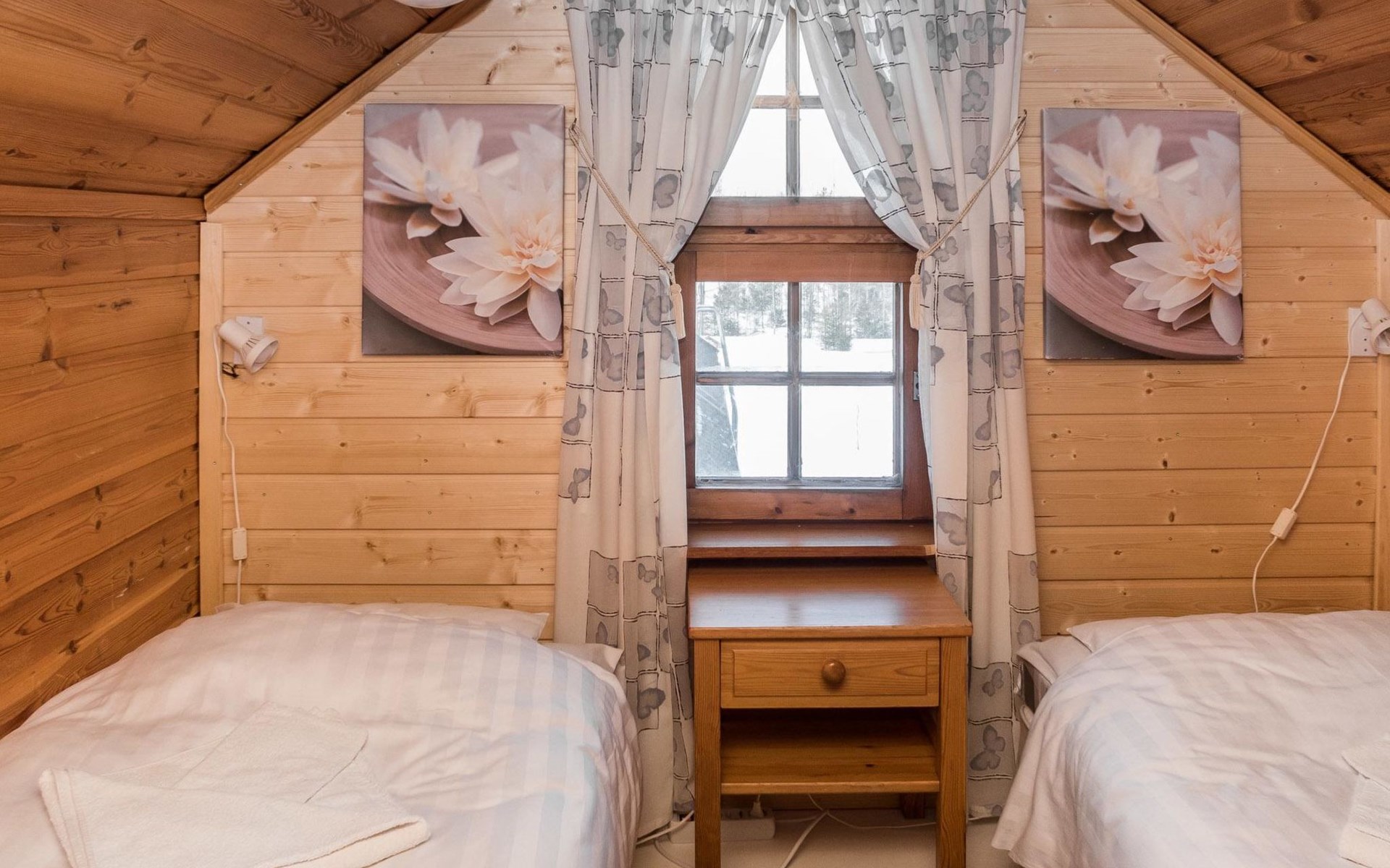 Vuokatticottage F living area 57 m², on two floors. Kitchenette, bright living room with dining table, sofa, TV 42 ", fireplace. Shower/toilet, sauna with electric stove. Loft with steep stairs, small lobby with access to both bedrooms, one with double bed (access to balcony), one with twin beds for 2. Small terrace.