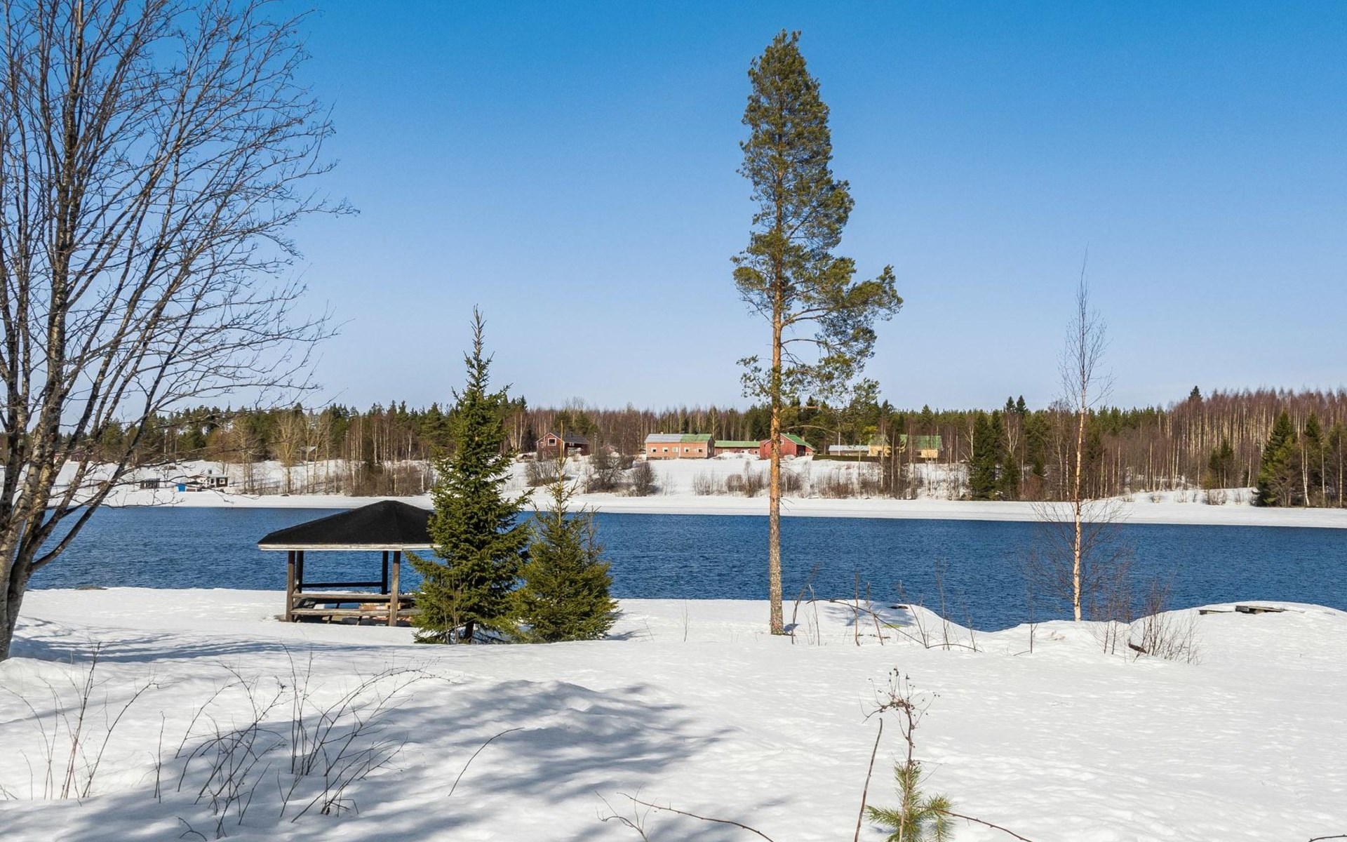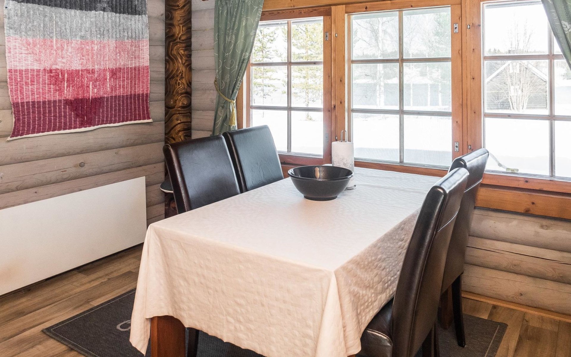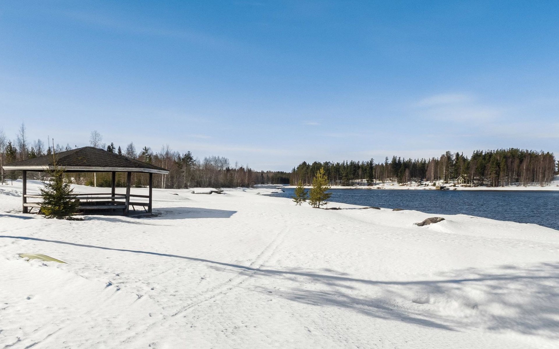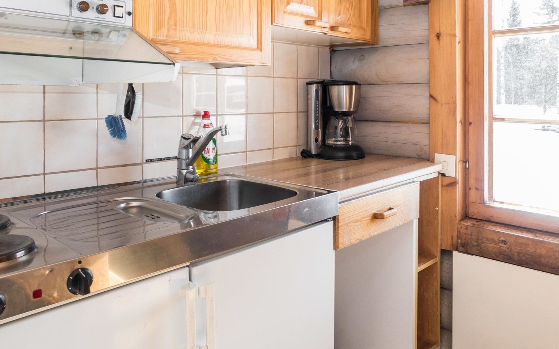 Vuokatticottage F living area 57 m², on two floors. Kitchenette, bright living room with dining table, sofa, TV 42 ", fireplace. Shower/toilet, sauna with electric stove. Loft with steep stairs, small lobby with access to both bedrooms, one with double bed (access to balcony), one with twin beds for 2. Small terrace.