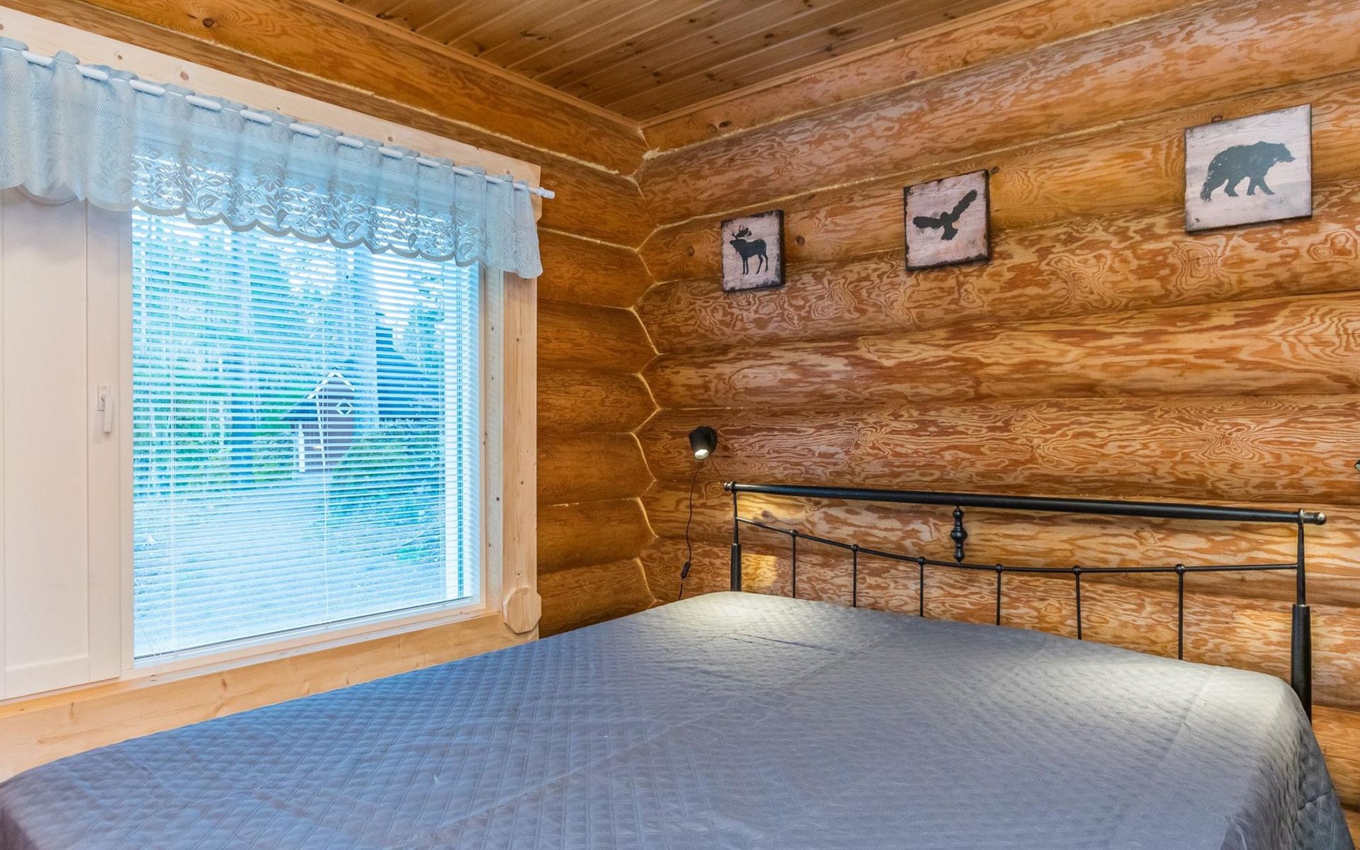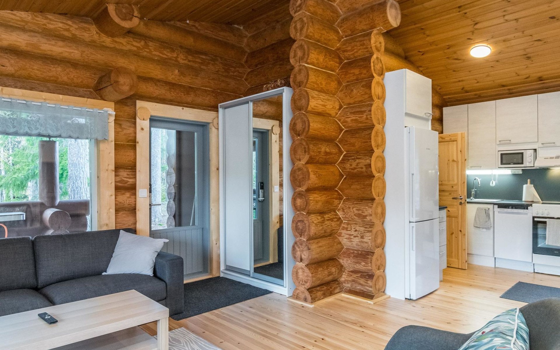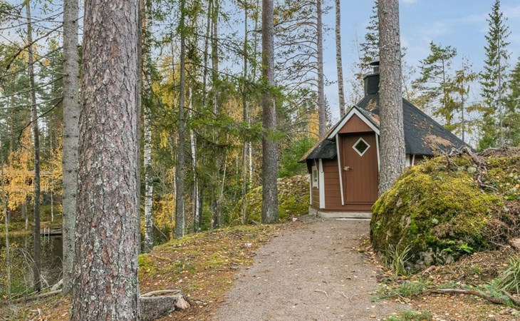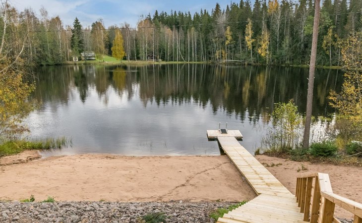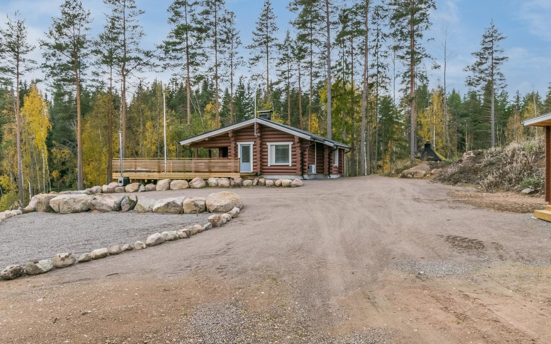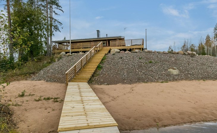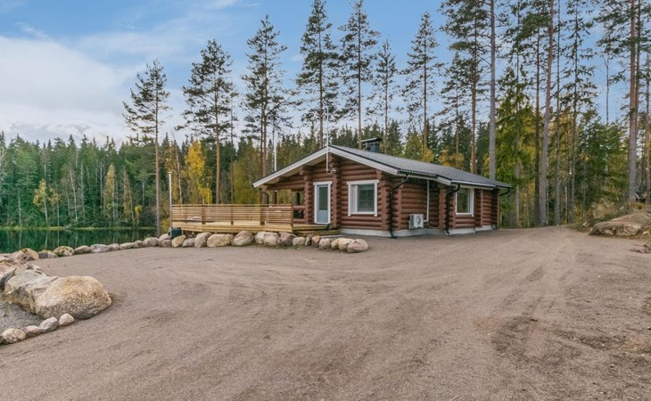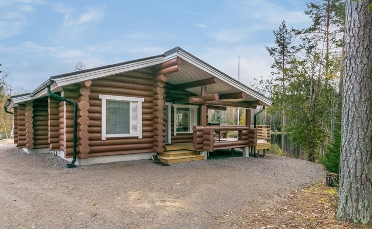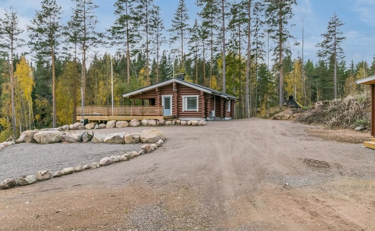 25 km to the east from Kouvola, Väliväylä Canoeing Route 15 m, gently deepening sand beach, rowing boat, and a pier. Round log cabin, built in 1998 and renovated in 2023, features a living room/kitchen, a bedroom with a double bed, another bedroom with a single bed and a bunk bed, a bathroom with a shower and WC, and a wood-burning sauna.