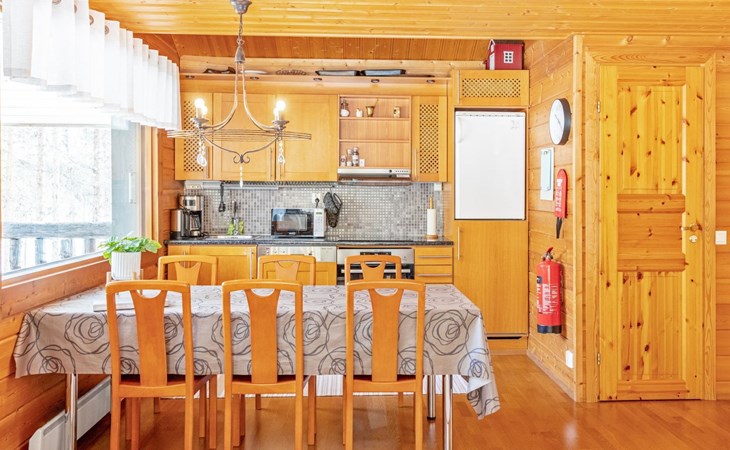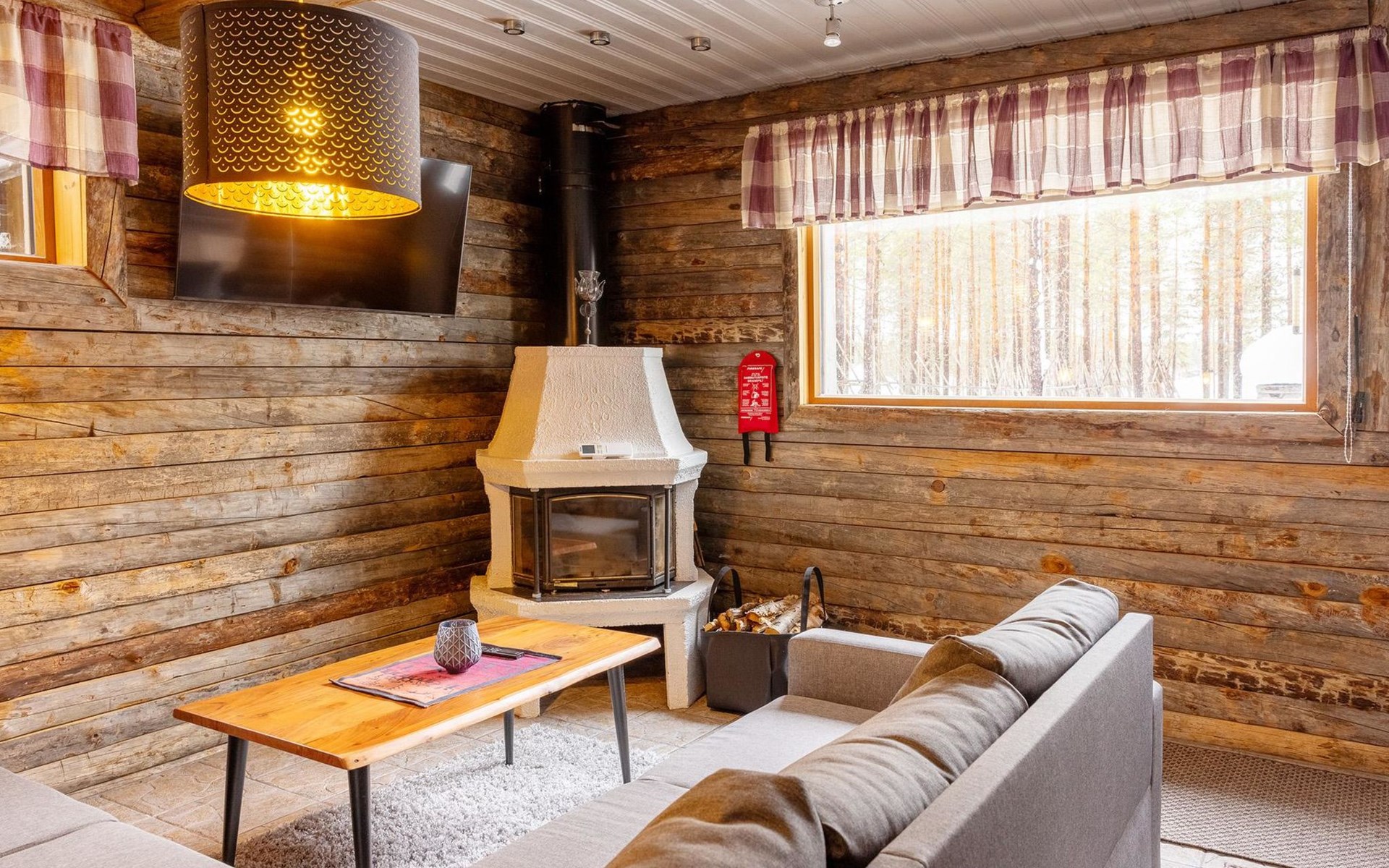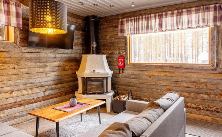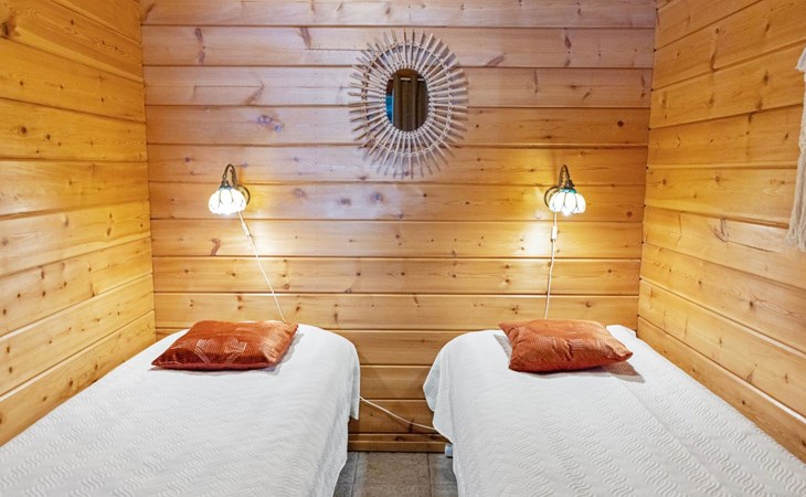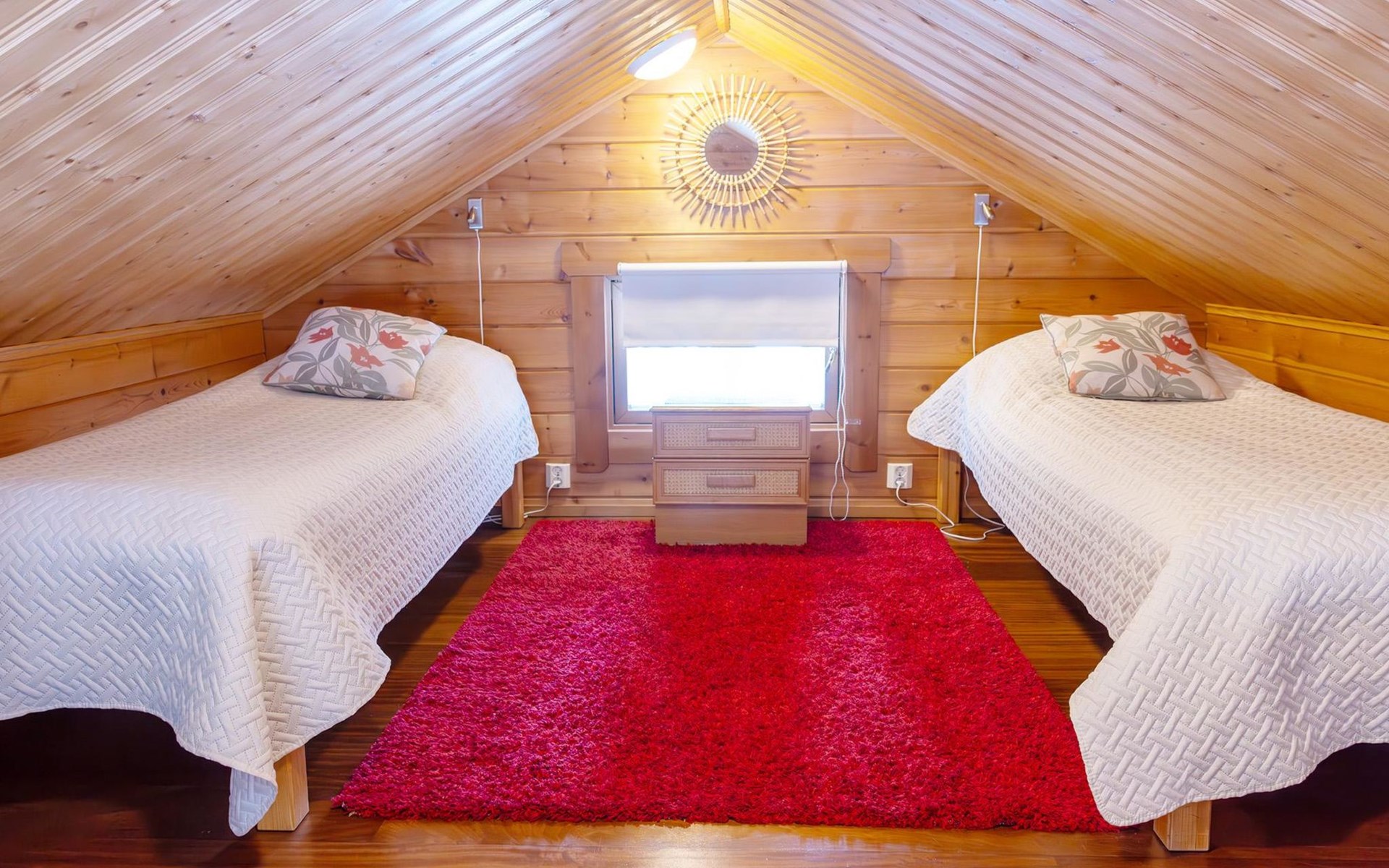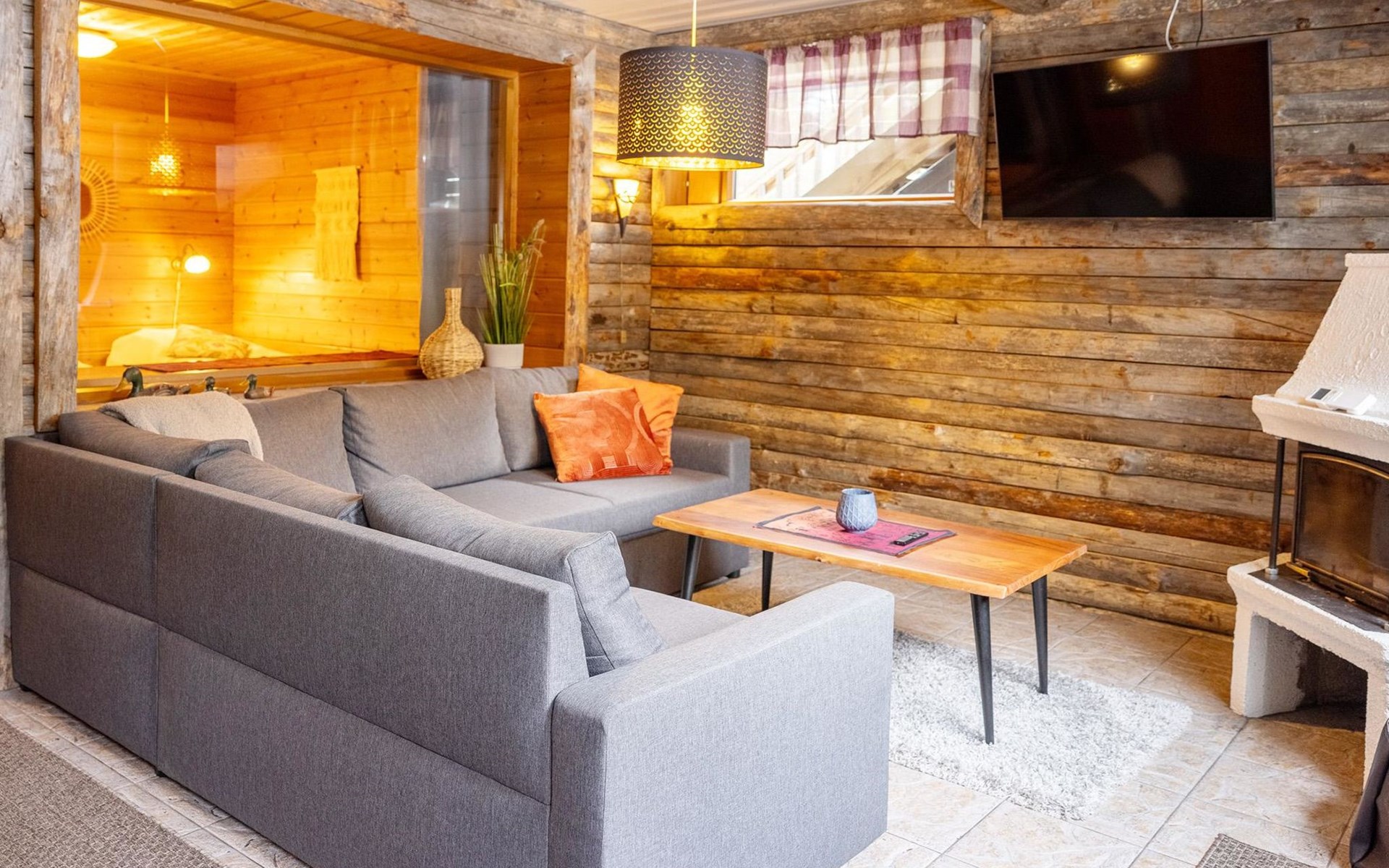 Lower floor: 2 single beds in the sleeping alcove, sofa bed in the fireplace room. Mini kitchen and electric sauna (renovated in 2024) + toilet.