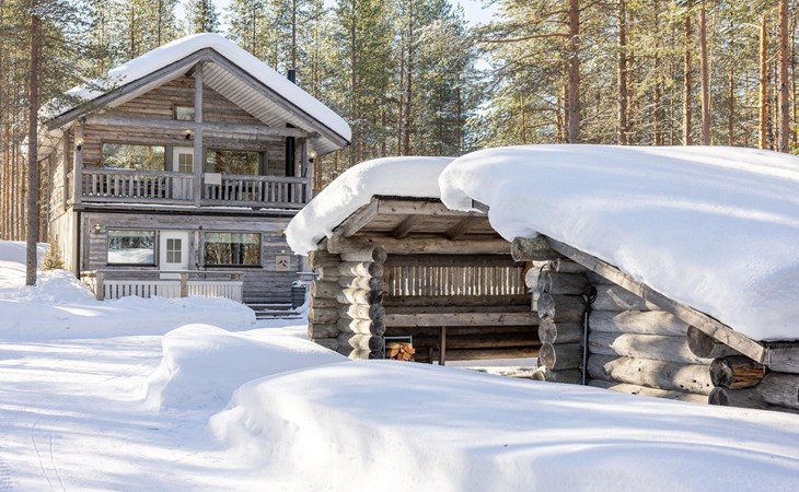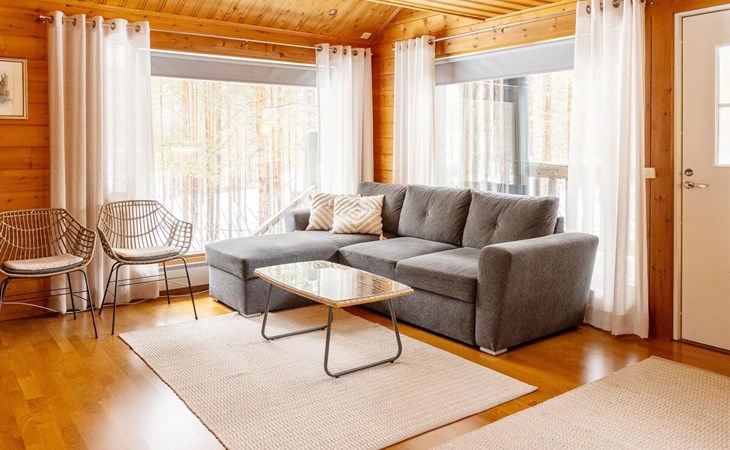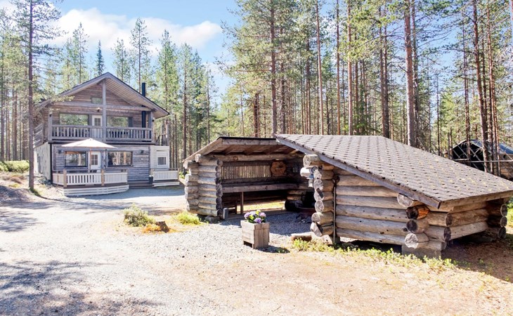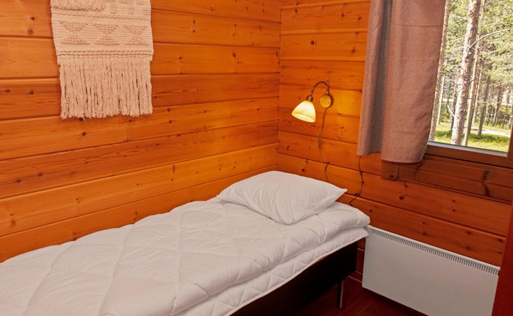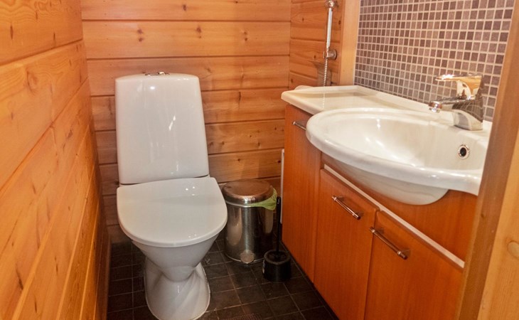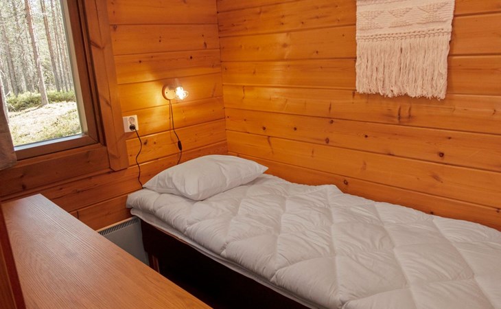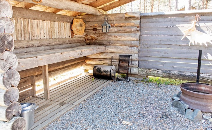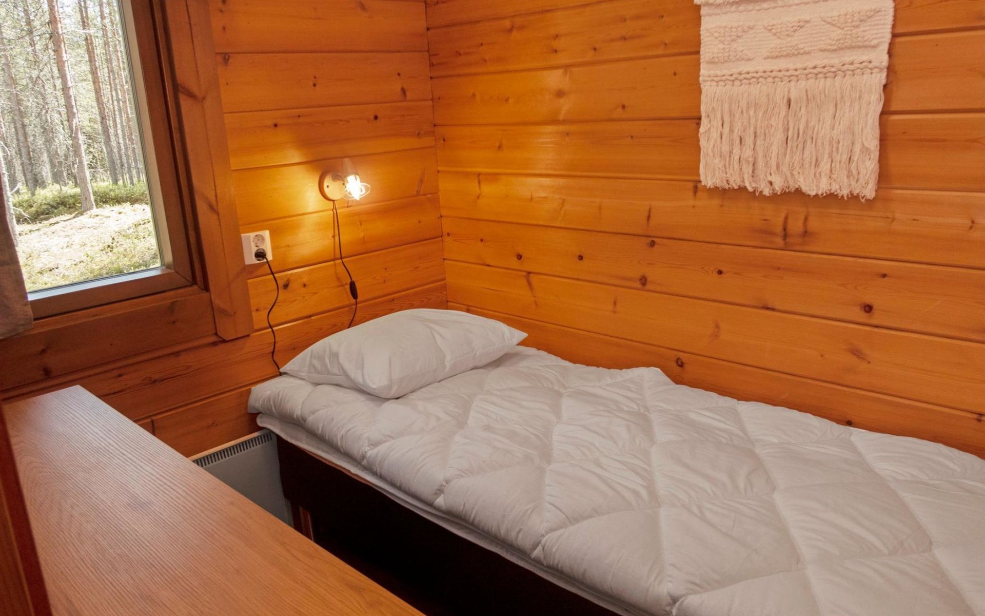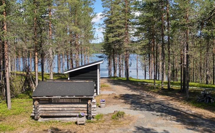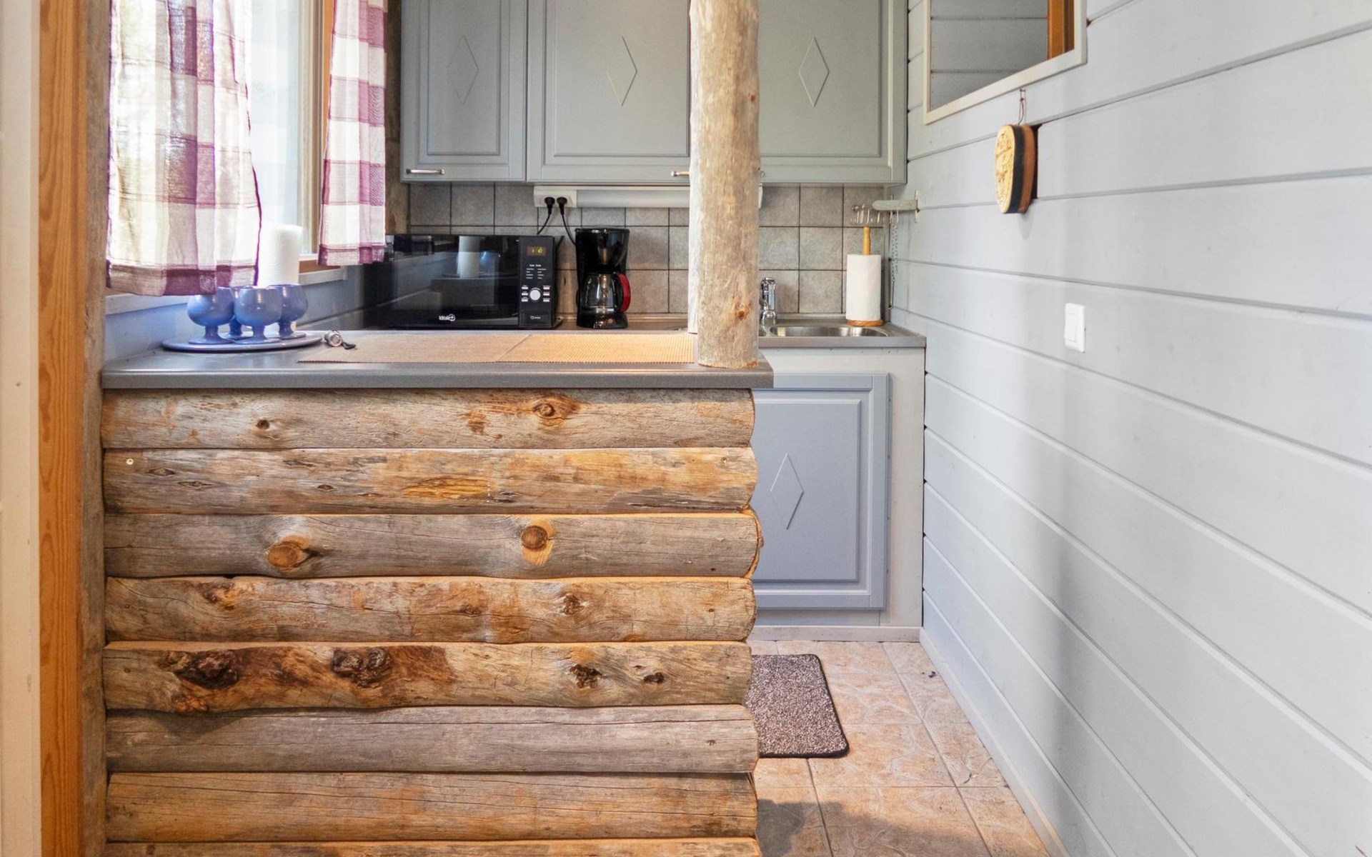 Lower floor: 2 single beds in the sleeping alcove, sofa bed in the fireplace room. Mini kitchen and electric sauna (renovated in 2024) + toilet.