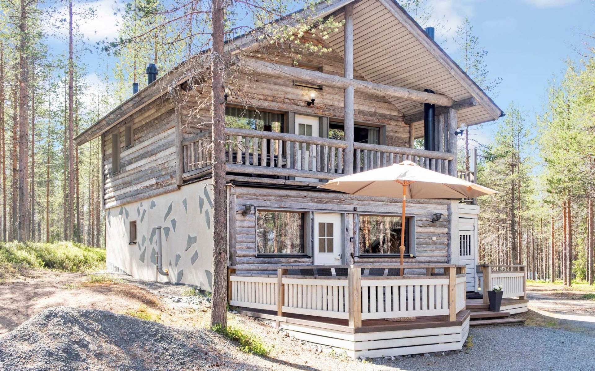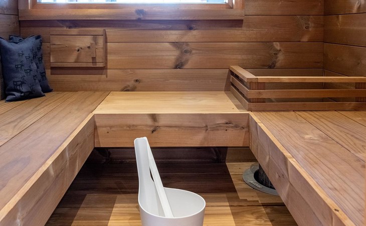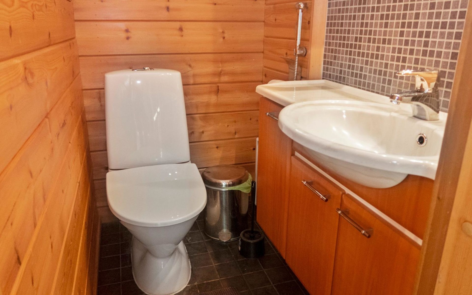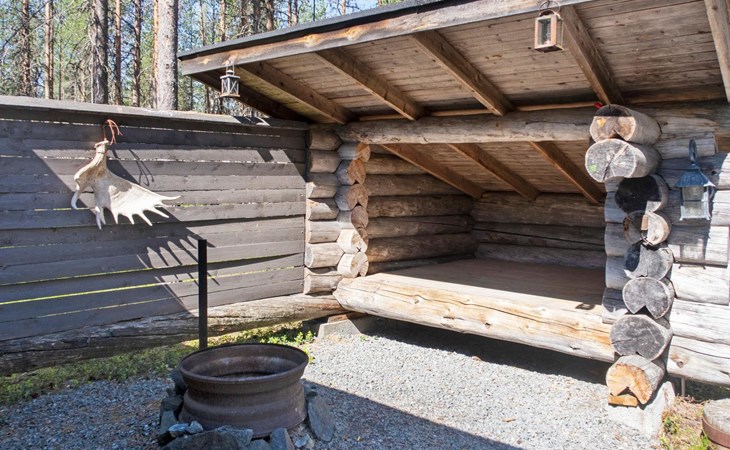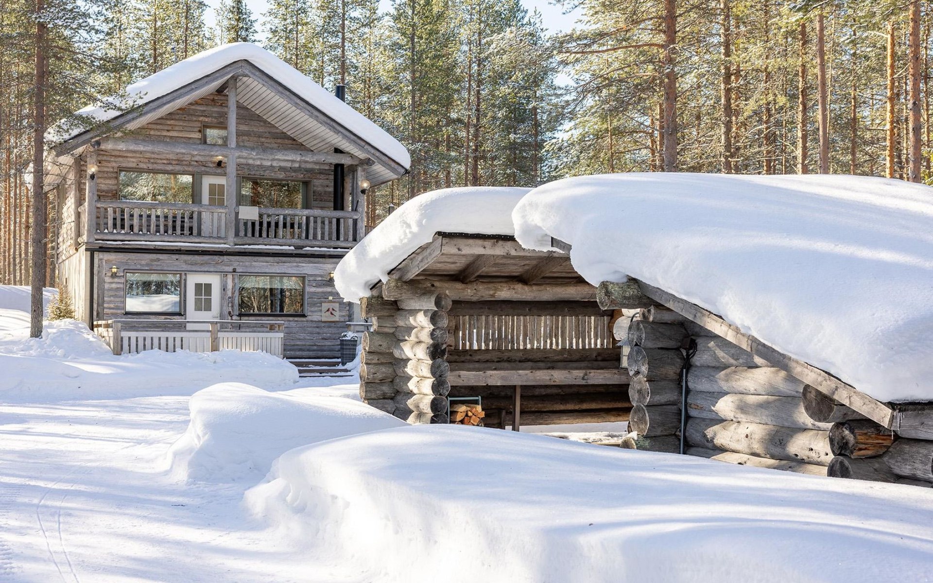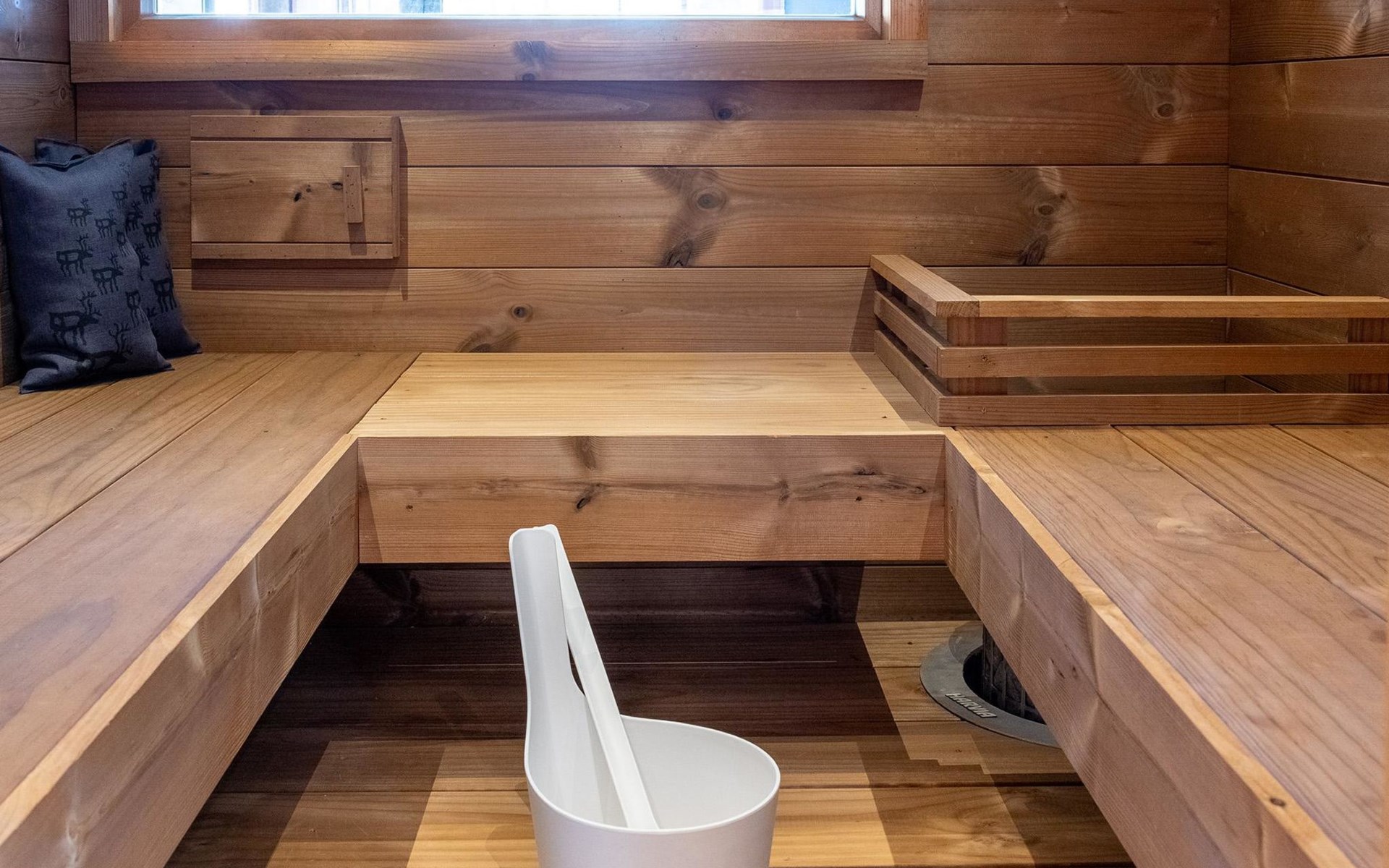 Lower floor: 2 single beds in the sleeping alcove, sofa bed in the fireplace room. Mini kitchen and electric sauna (renovated in 2024) + toilet.