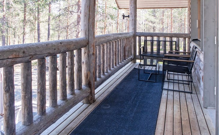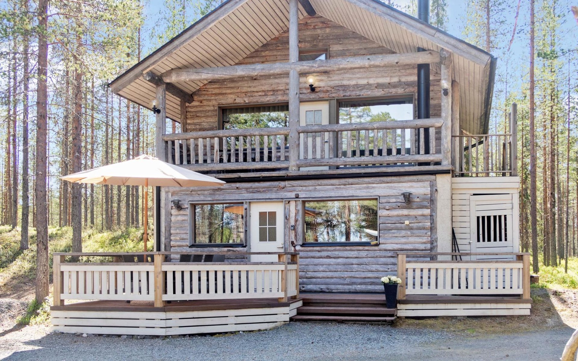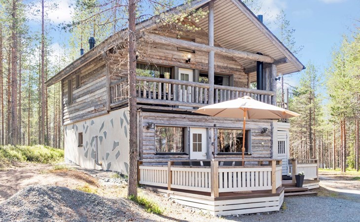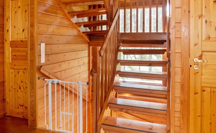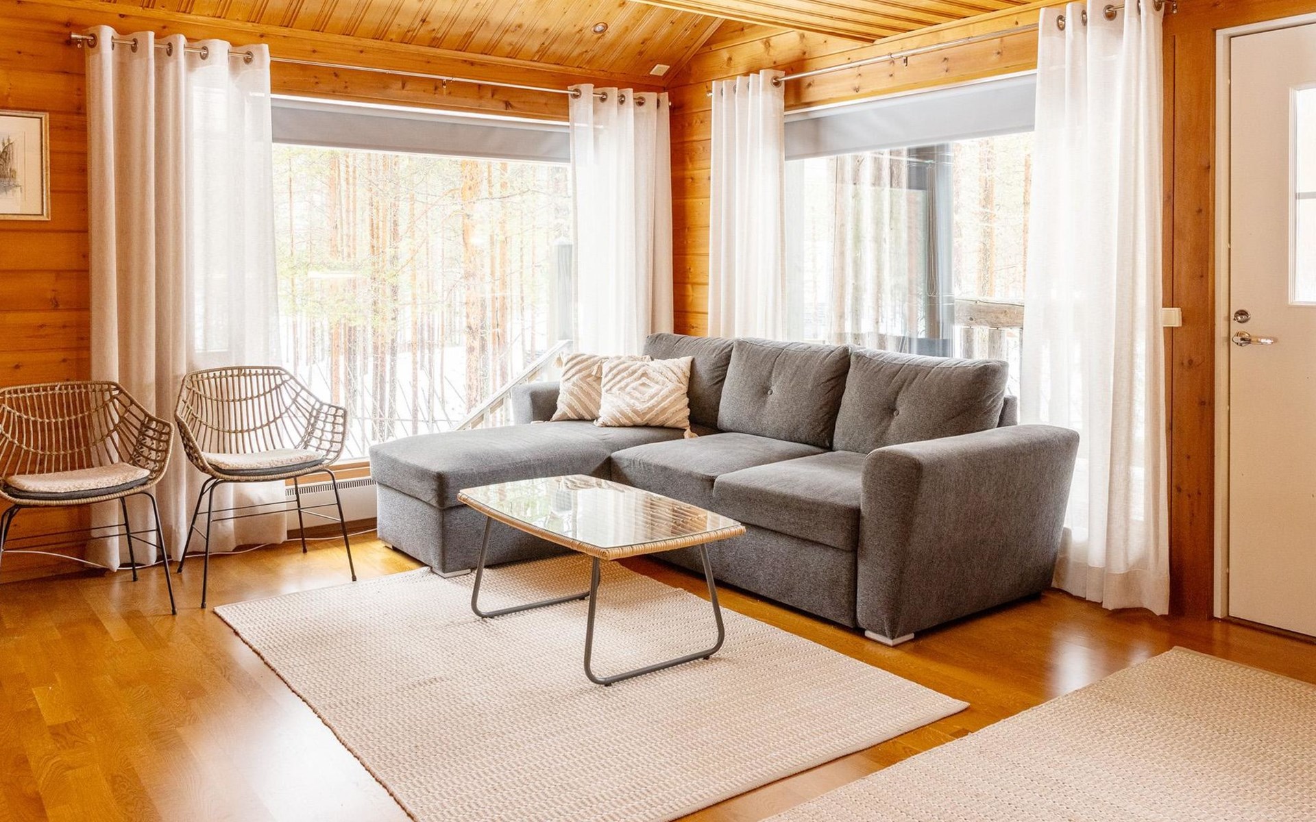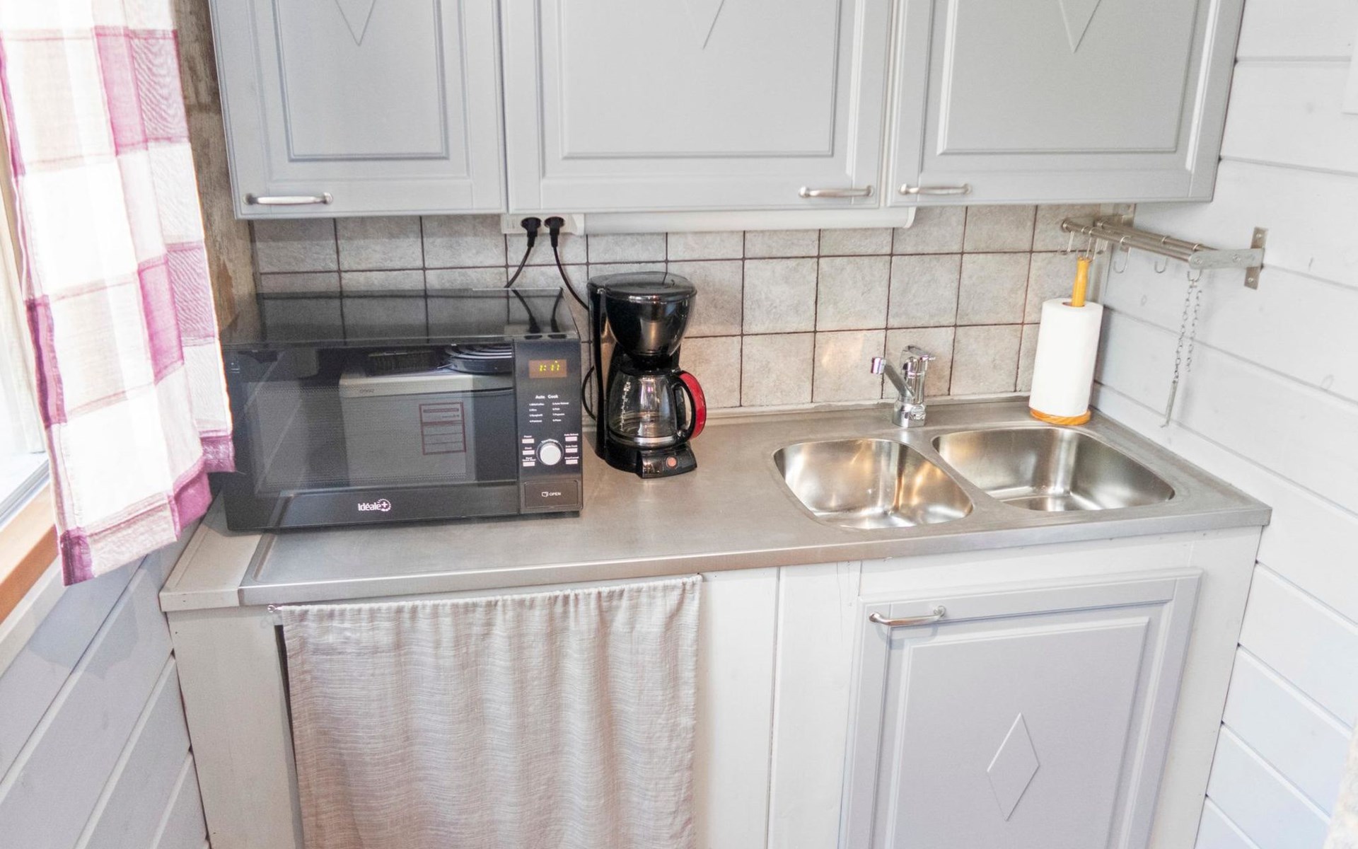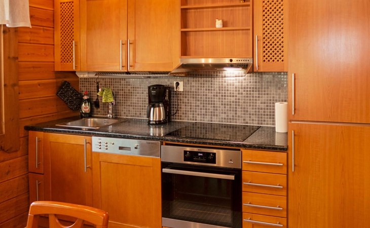 Lower floor: 2 single beds in the sleeping alcove, sofa bed in the fireplace room. Mini kitchen and electric sauna (renovated in 2024) + toilet.