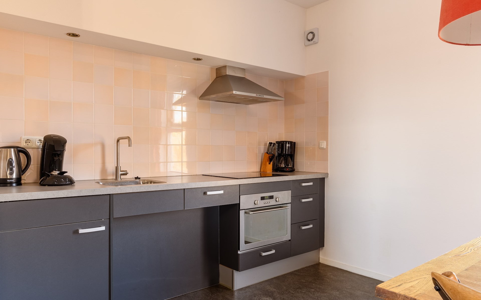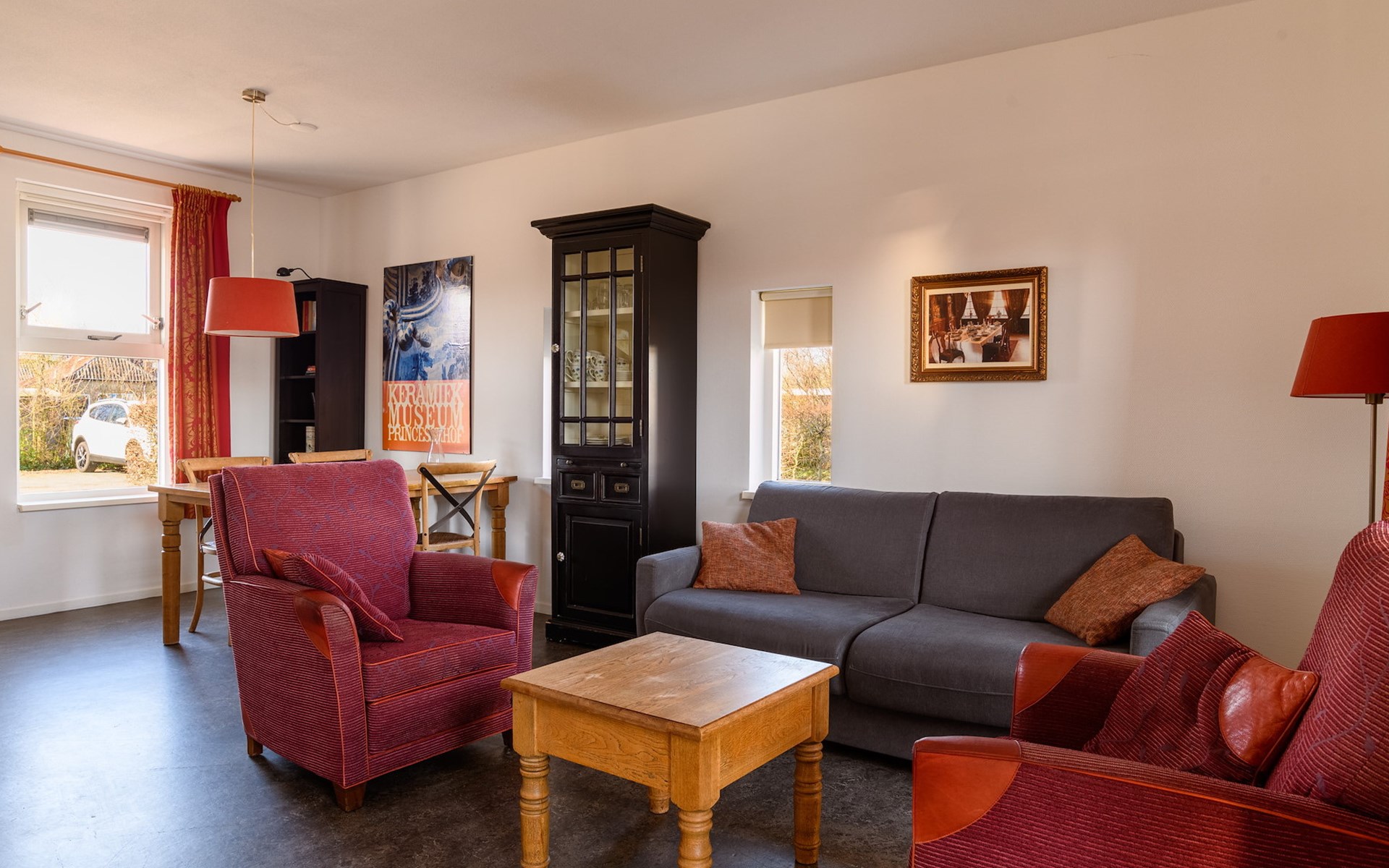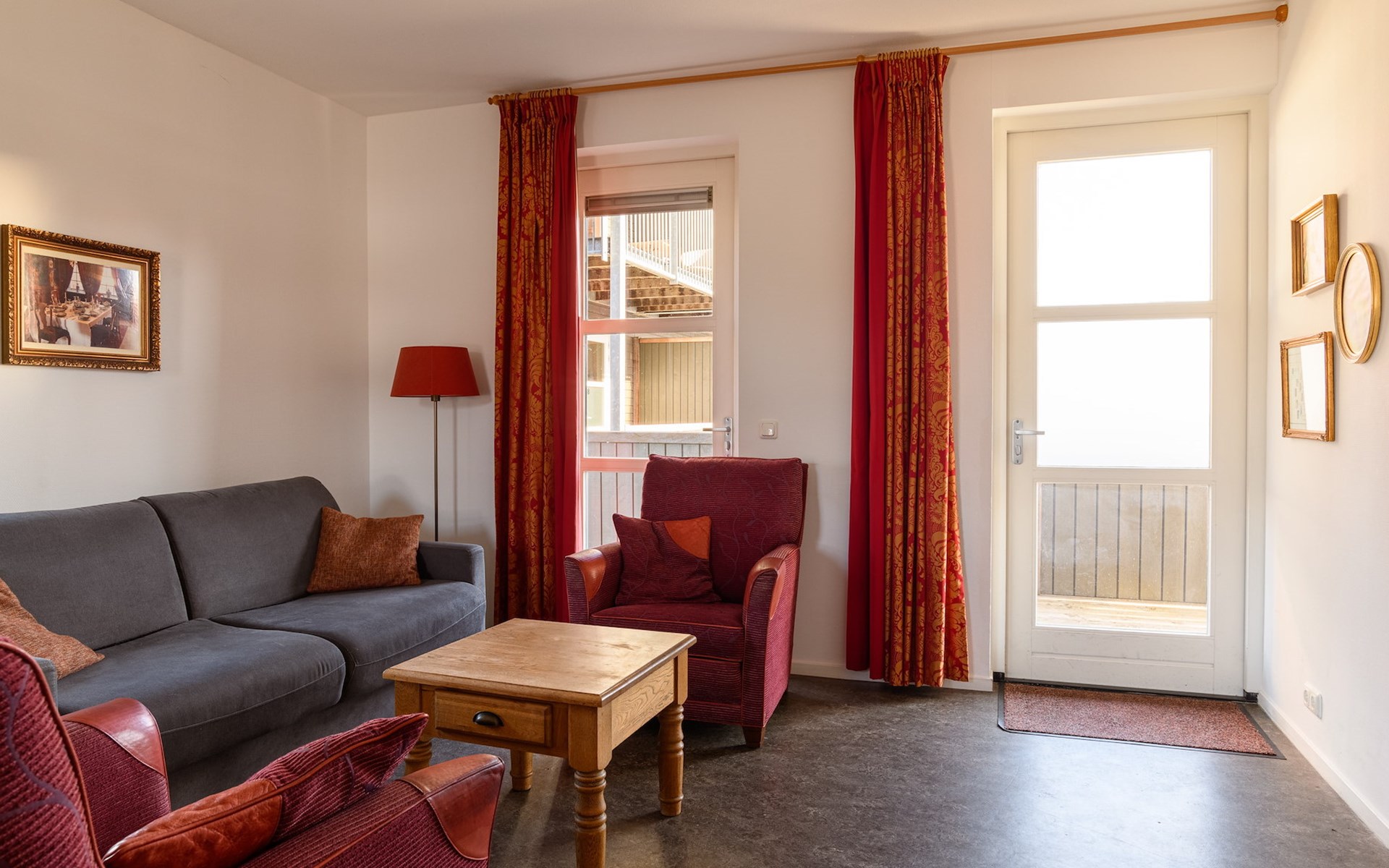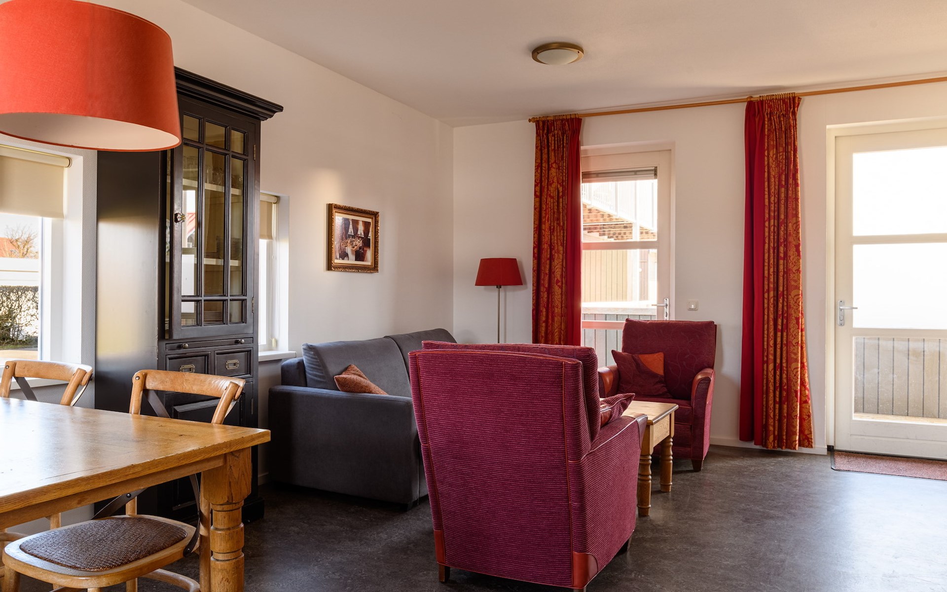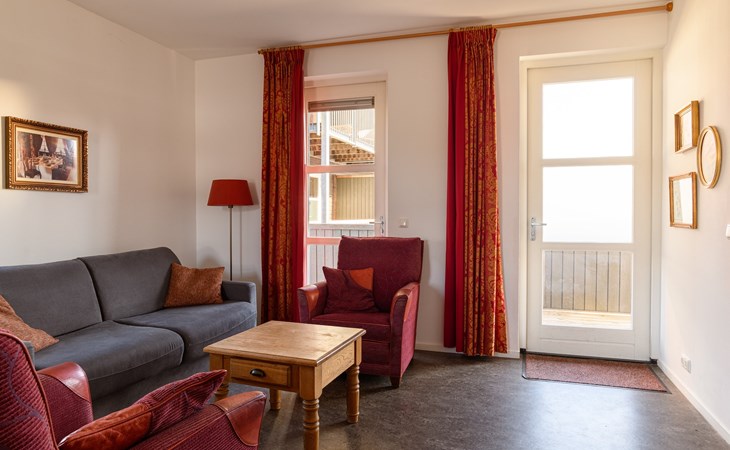 De woonkamer is ingericht met een 2-persoons slaapbank en een televisie. De open keuken is voorzien van onder andere een onderrijdbaar aanrecht, koelkast met vriesvak, magnetron en een filterkoffiezetapparaat.Het appartement heeft 1 slaapkamer. In deze slaapkamer staan 2 éénpersoons boxsprings. Het is mogelijk een hoog-laagbed in de slaapkamer te plaatsen. De badkamer beschikt over een inloopdouche, een (opklapbare) douchestoel, wc met steunen en een onderrijdbare wastafel.