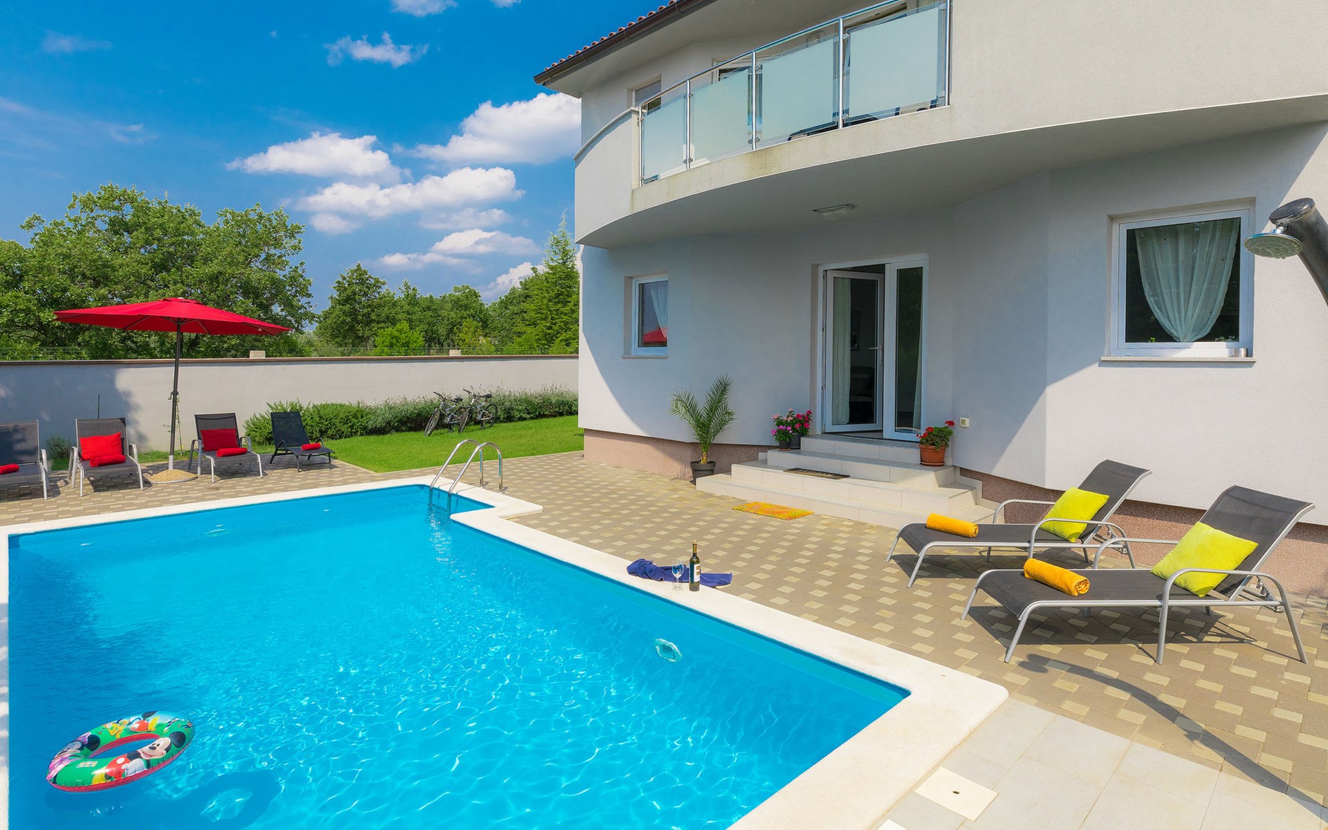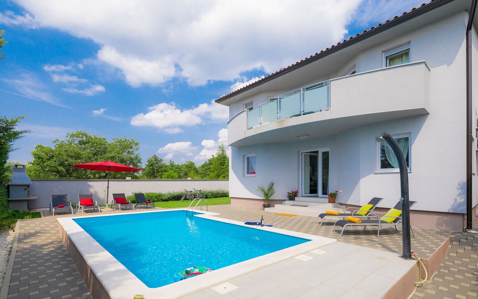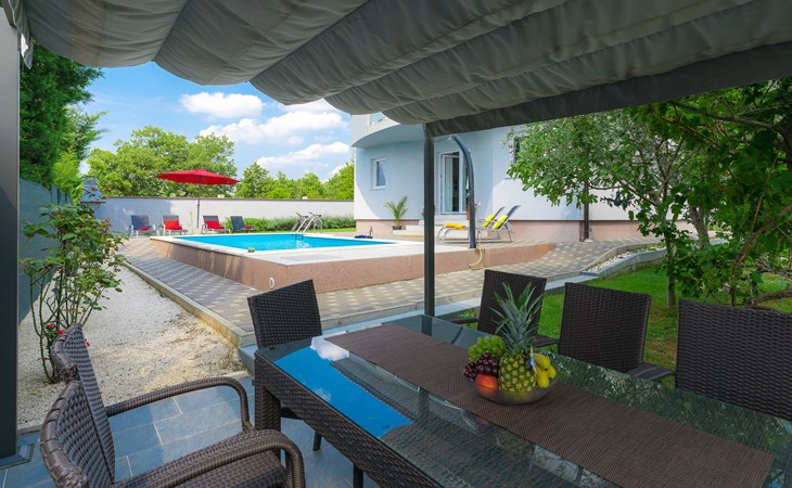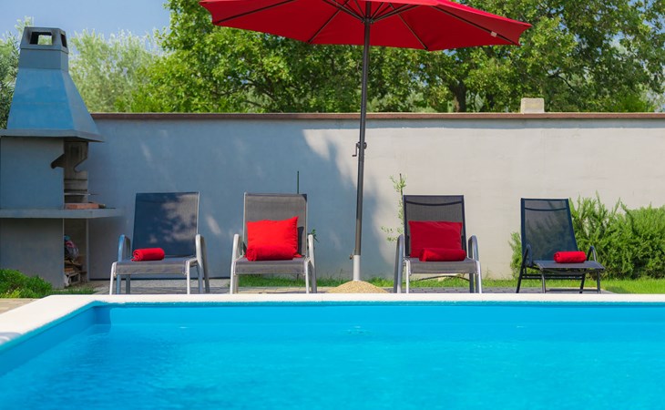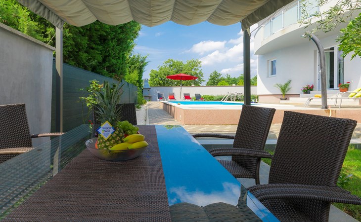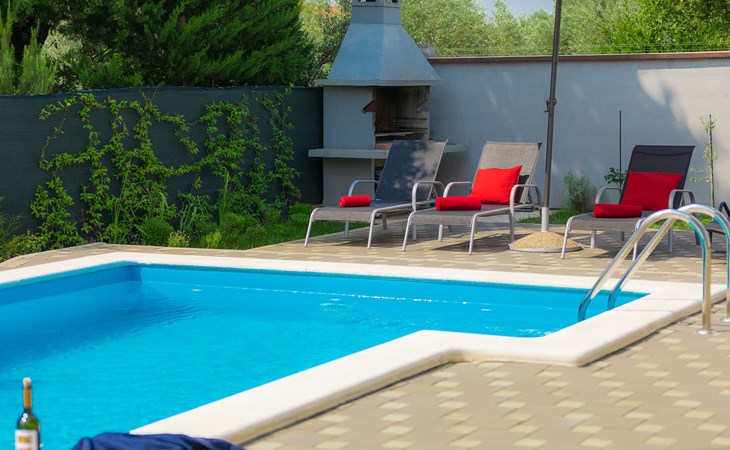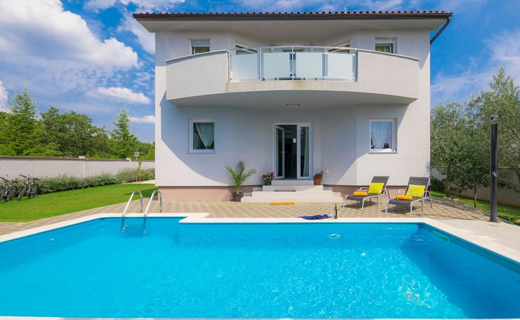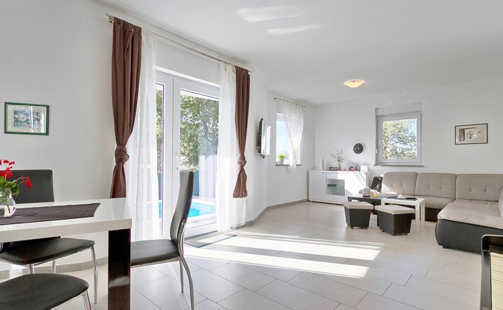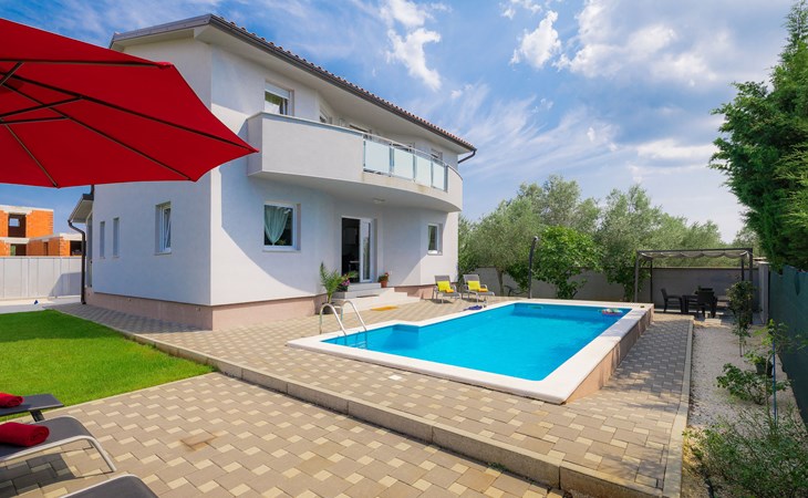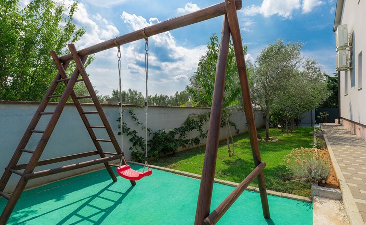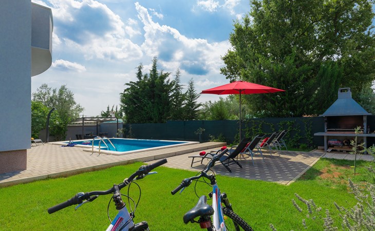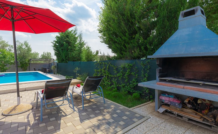 Majmajola 4 km van Vodnjan: Mooi eengezinswoning "Amber", van 2 verdiepingen. Rustige, zonnige ligging, 8 km van zee. Voor alleengebruik: terrein 570 m2 (omheind), tuin, openluchtzwembad hoekig (25 m2, 140 cm diepte, seizoensgebonden beschikbaarheid: 27.Apr. - 28.Sep.). Terras, barbecue (schommel). In het huis: internetaansluiting, wasmachine. Parkeerplaats bij het huis op het terrein. Winkel 4 km, restaurant 4 km, bushalte 3.8 km, kiezelstrand 8 km. Golfterrein (18 holes) 15 km, manege 15 km, wandelroutes, vanaf het huis, fietspad 50 m. De eigenaar accepteert geen jeugdgroepen.