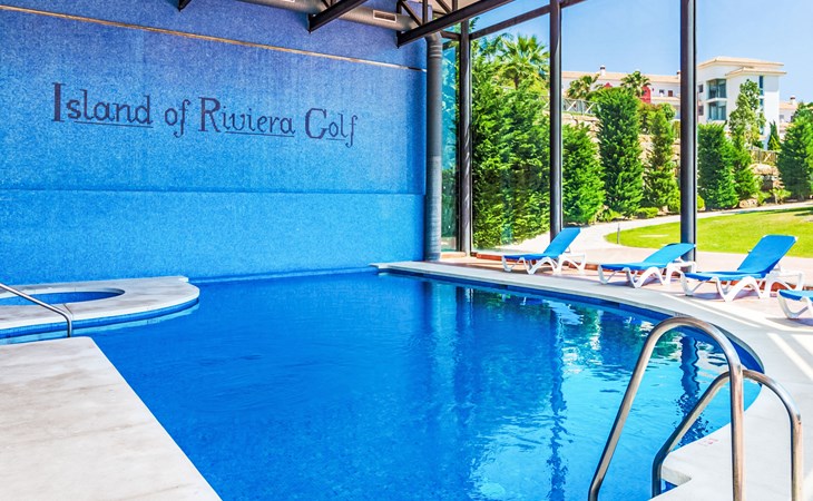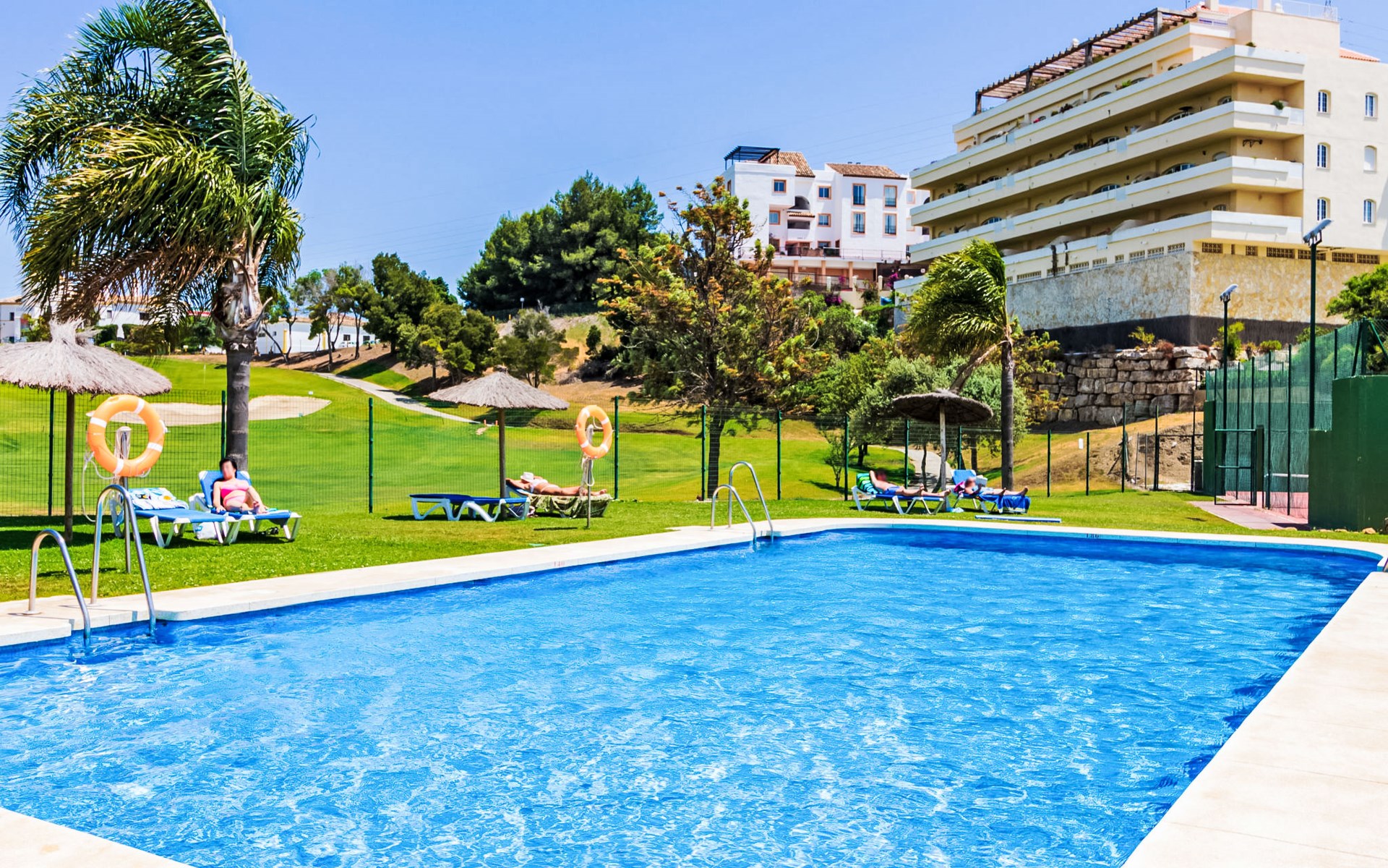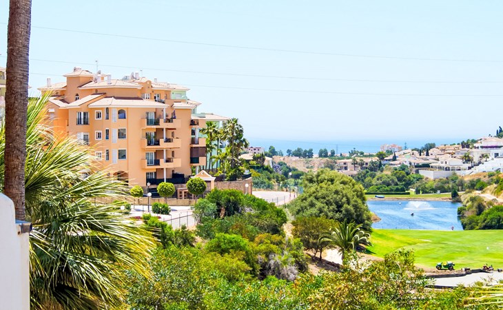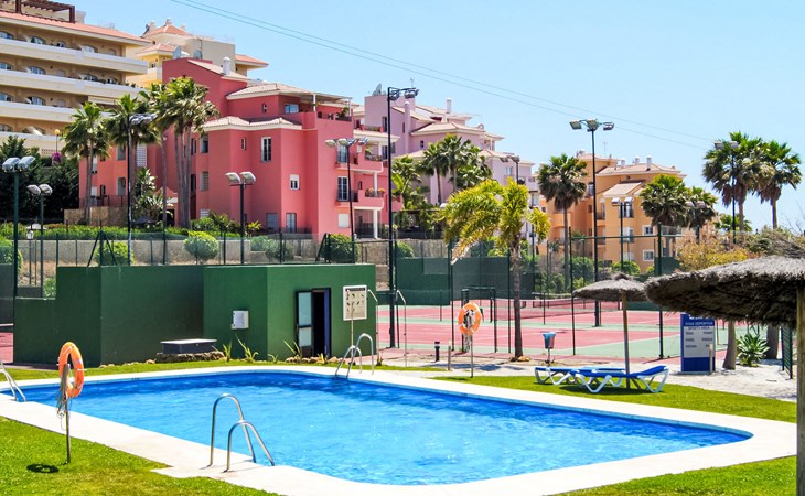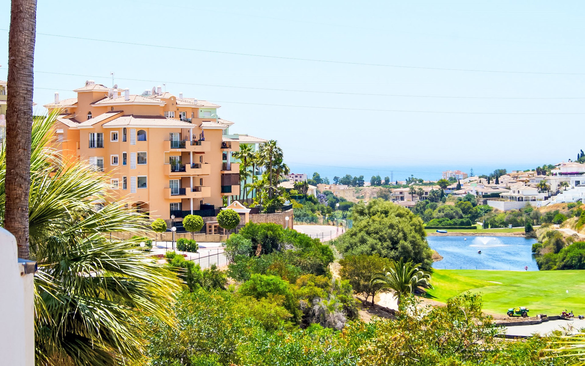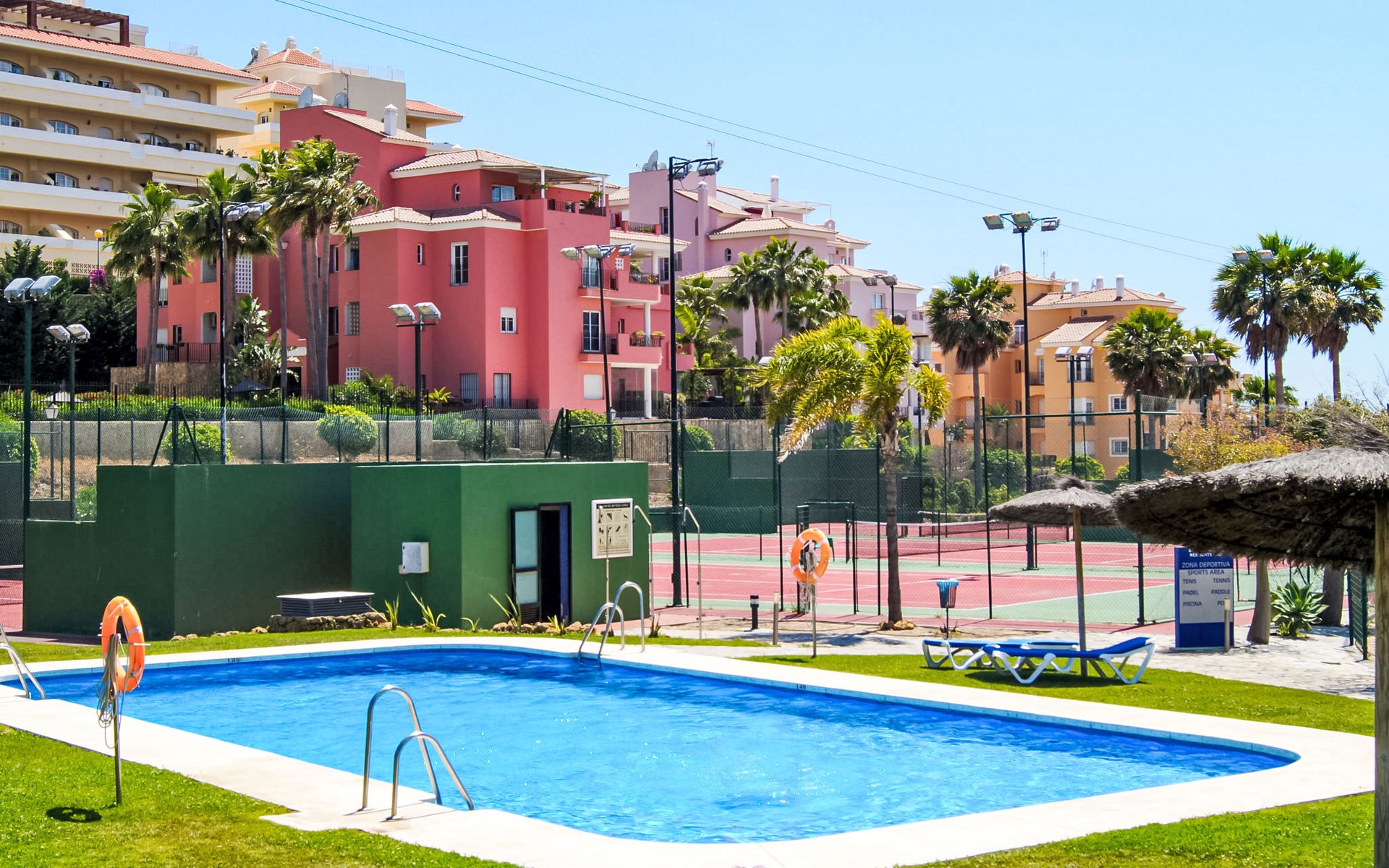 Riviera del sol: Moderne, comfortabel flatgebouw "Island of Riviera Golf", bouwjaar 2008. 800 m van het centrum van Riviera del sol, 17 km van het centrum van Marbella, buiten de plaats, 12 km van het centrum van Fuengirola, zonnige, verhoogde ligging, 1.5 km van zee, aan een doodlopende weg, aan de golfbaan. Voor medegebruik: terrein (omheind), tuin, openluchtzwembad verwarmd (15 x 10 m, seizoensgebonden beschikbaarheid: 01.Jan. - 31.Dec.). Douche/WC bij het zwembad, kinderzwembad, tennisbaan, verlichte tennisbaan. In het complex: lift. Gemeenschappelijke garage. Winkel 800 m, supermarkt 1.8 km, bushalte "Golf Miraflores" 600 m, zandstrand "Cabopino" 5 km, stenenstrand 1.5 km. Jachthaven 5 km, golfterrein (18 holes) 750 m.