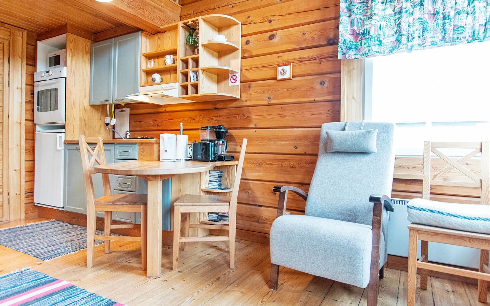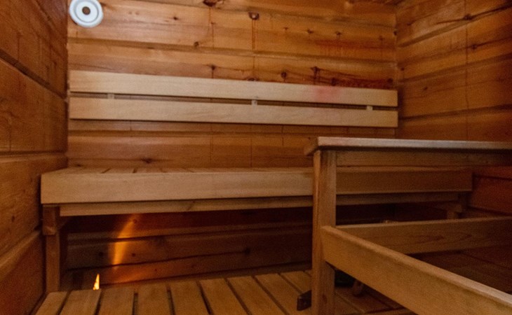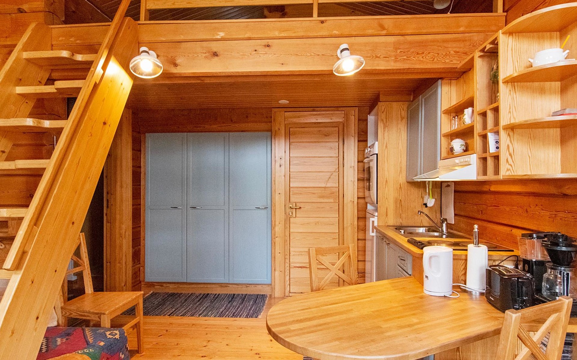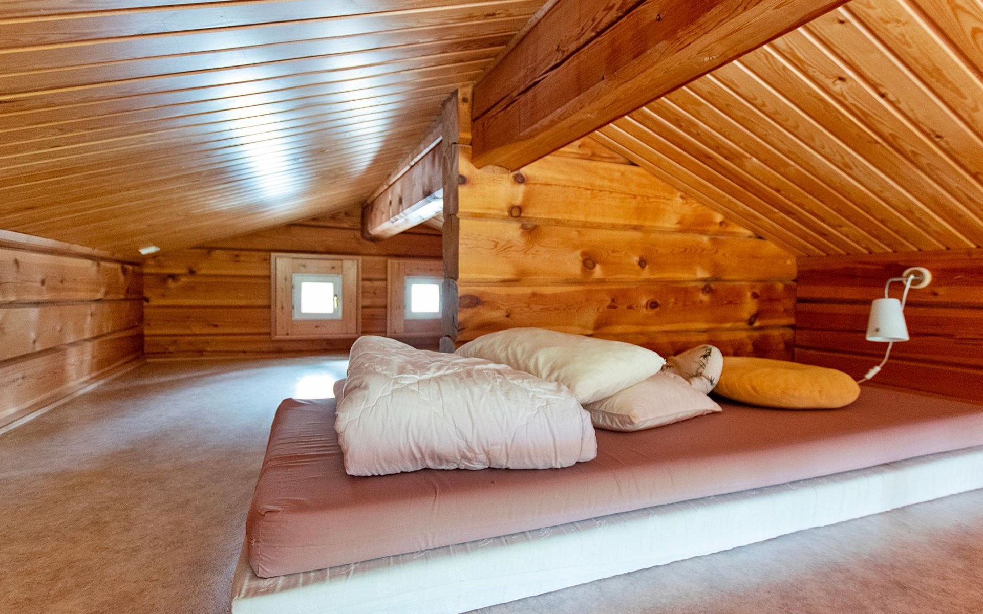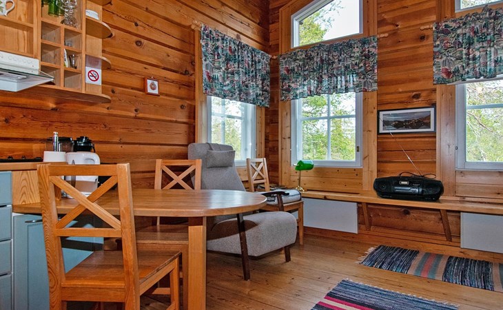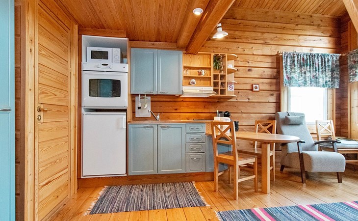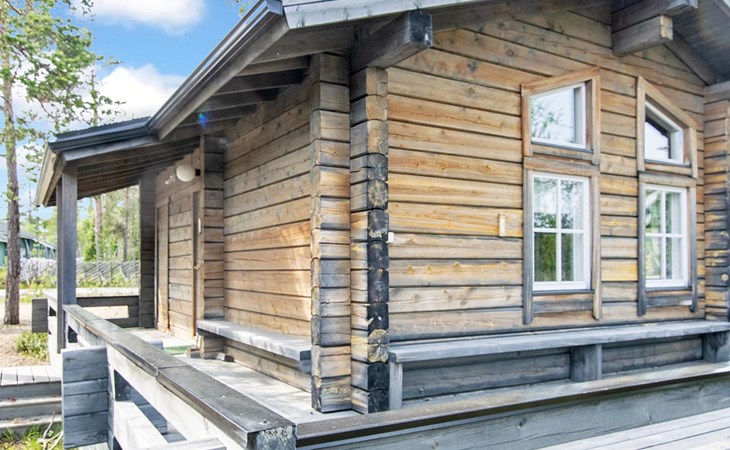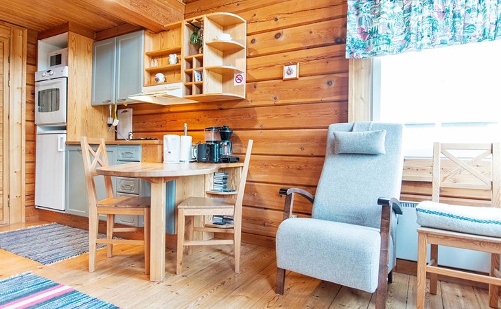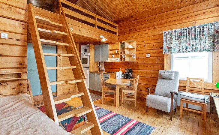In a 40-square-meter log cabin, there is a kitchen/living room, a low loft, a washroom/toilet, a sauna, a storage and a terrace.