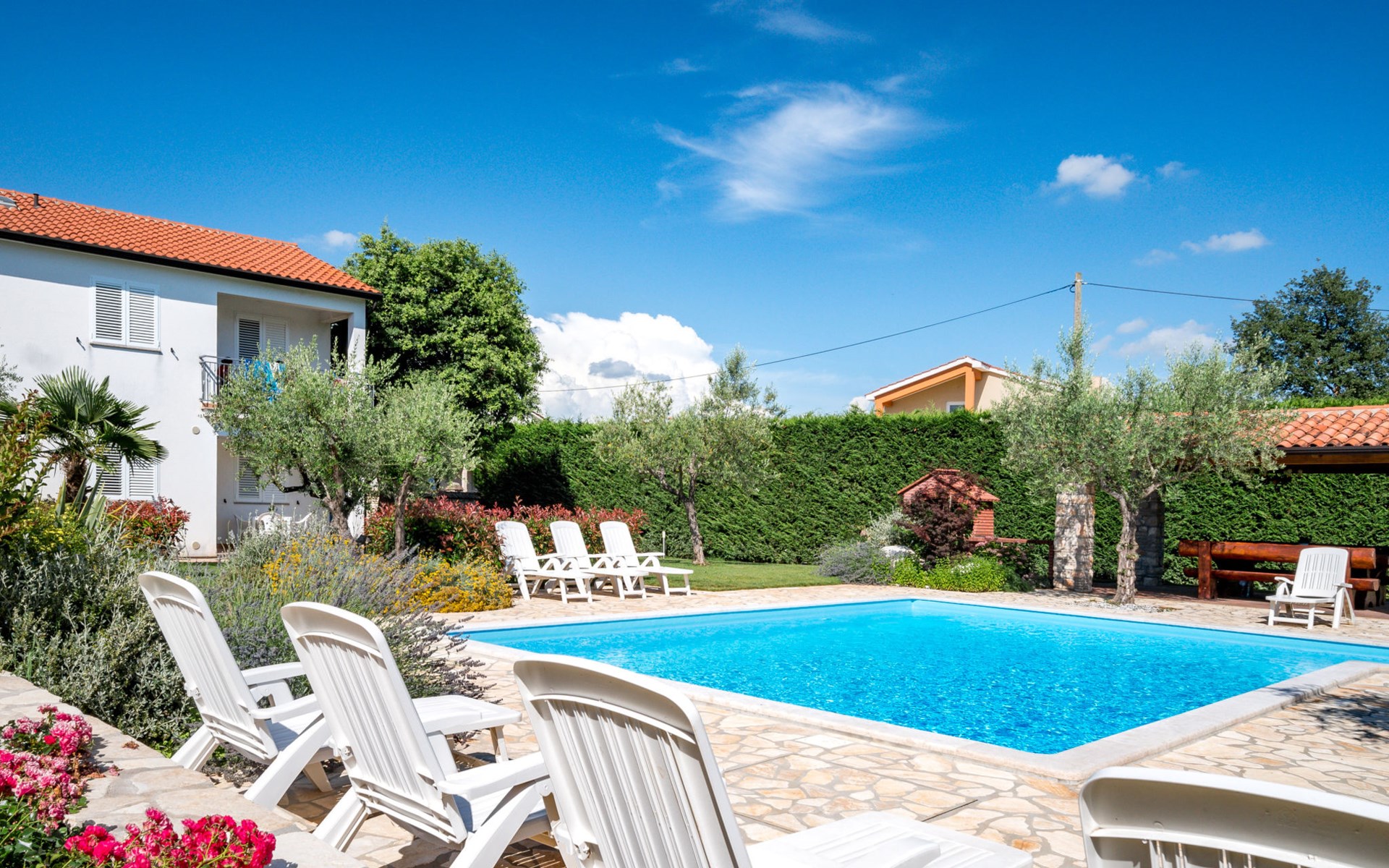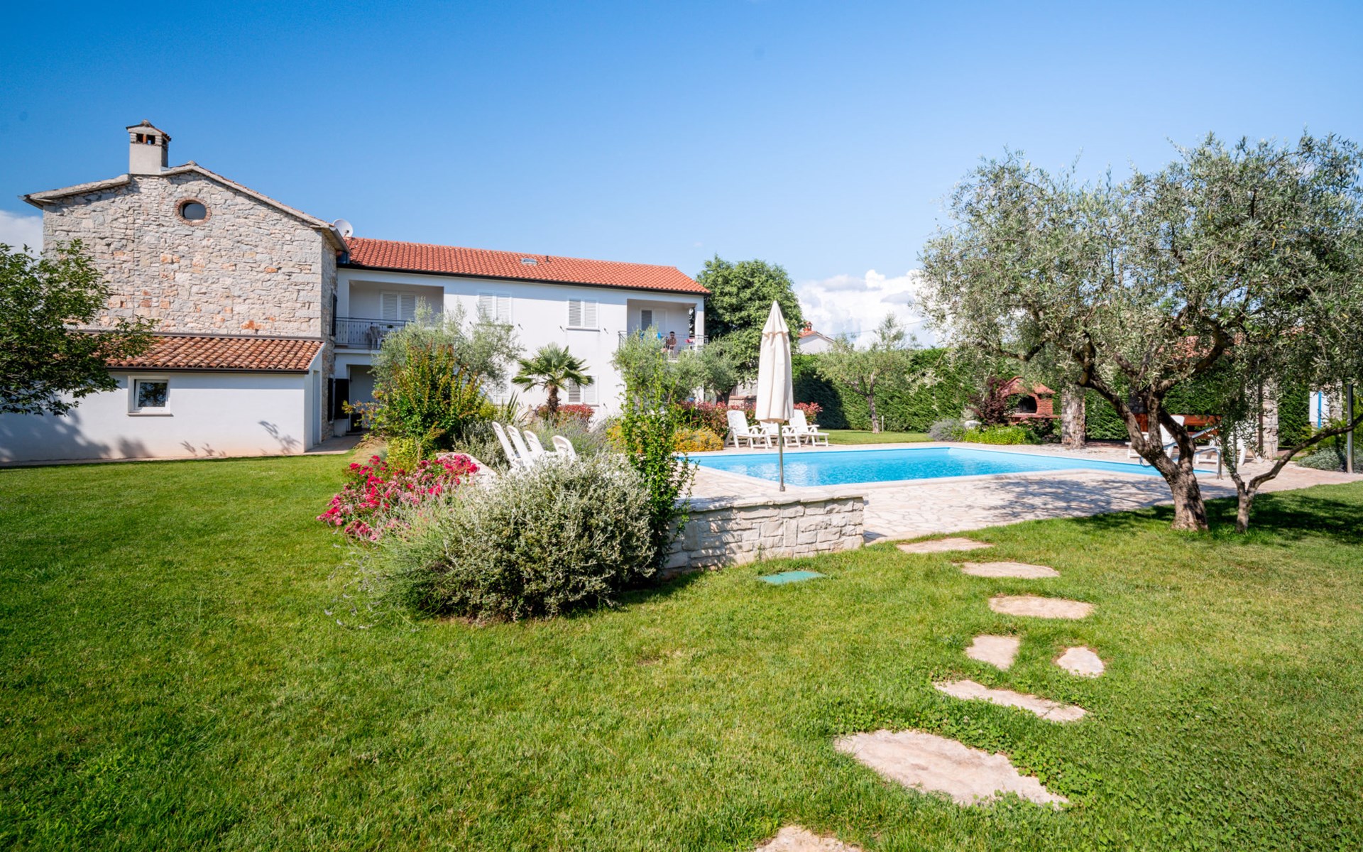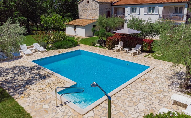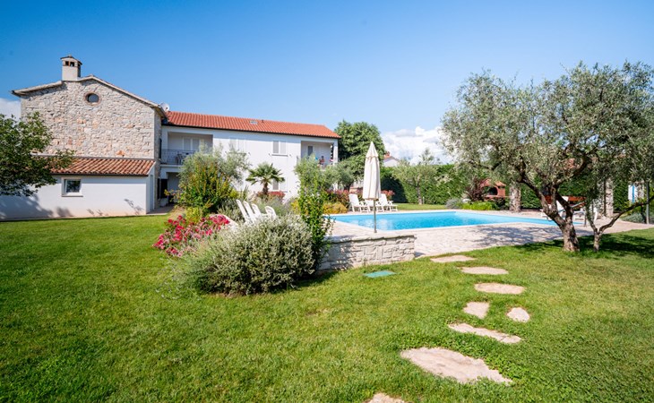 Huis met 3 woningen "Fiore". In het gehucht Gedići, 1 km van het centrum van Nova Vas, 5 km van het centrum van Poreč, zonnige ligging, 5 km van zee. Voor medegebruik: terrein 2.000 m2 (omheind), tuin met gazon, openluchtzwembad hoekig (8 x 6 m, 140 cm diepte, seizoensgebonden beschikbaarheid: 15.Apr. - 15.Okt.) met trap. Buitendouche, terras (20 m2), tuinmeubelen, barbecue, kinderspeelplaats (schommel). In het huis: internetaansluiting, wasmachine (voor medegebruik, extra). Parkeerplaats bij het huis op het terrein. Winkel 2 km, restaurant 2 km, bushalte 3.1 km, kiezelstrand 5 km, rotsstrand 5 km. Tennis 6 km, manege 3 km, wandelroutes 100 m vanaf het huis, fietspad 150 m. Attracties in de buurt: aquapark 11 km. Object referentie: HR2406.200 is gelegen op hetzelfde terrein.