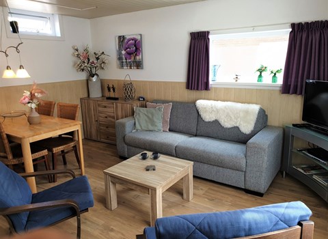 De woonkamer is ingericht met een zithoek, televisie, cd- en dvd-speler en een radio en grenst aan de open keuken met eethoek. Deze keuken is voorzien van onder andere een koelkast, filterkoffiezetapparaat en magnetron.