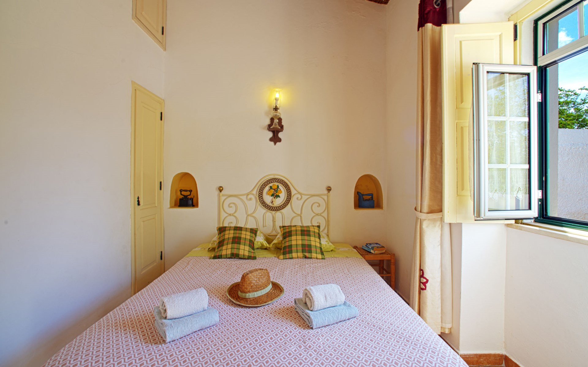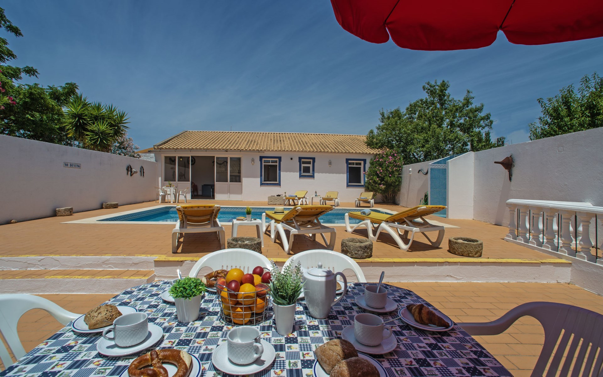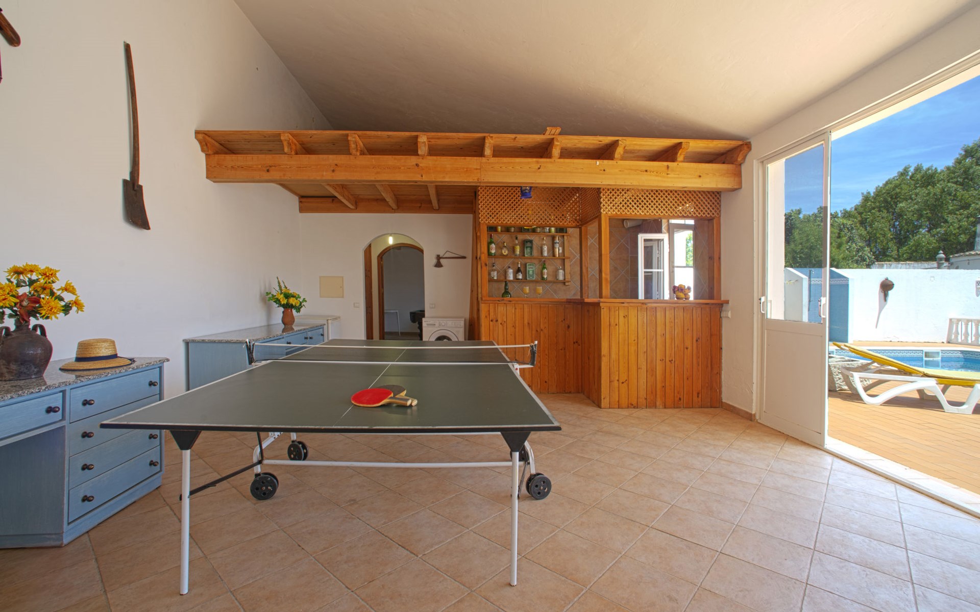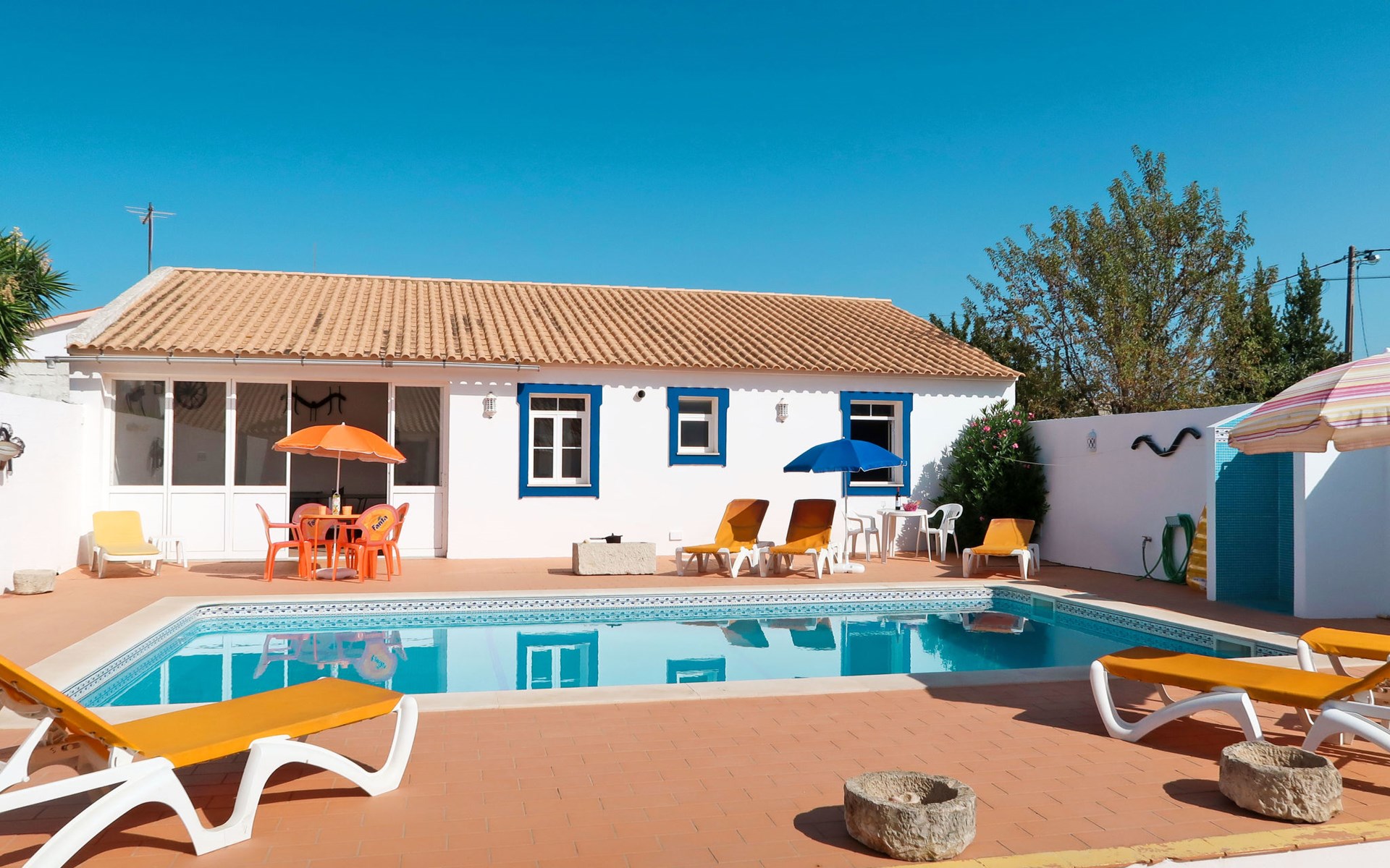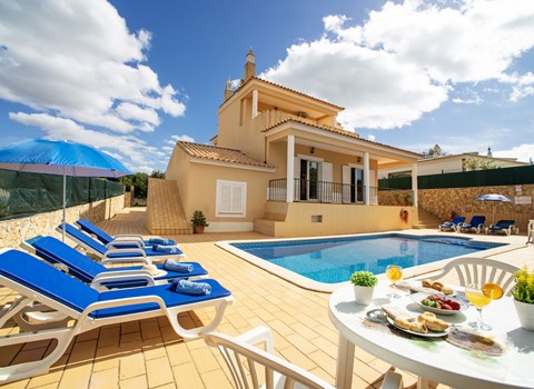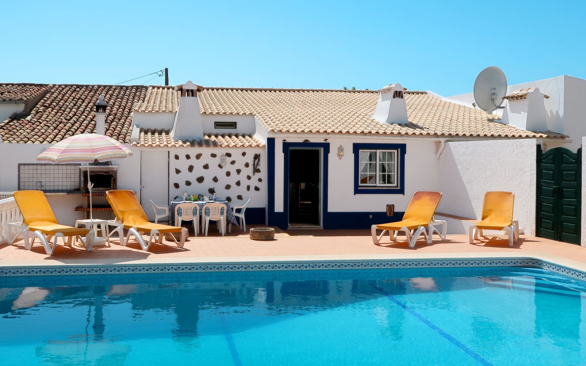 Huis "Monte da Calma". Huurobject bestaande uit hoofd-/ bijgebouw, Cerro de Ouro, 3.7 km van het centrum van Paderne, buiten de plaats, 9 km van het centrum van Albufeira, 9.5 km van zee. Voor alleengebruik: wild terrein 1.200 m2 (omheind), openluchtzwembad (8 x 4 m, 100 - 200 cm diepte, seizoensgebonden beschikbaarheid: 01.Jan. - 31.Dec.). Buitendouche, tafeltennis. In het huis: biljart, dakterras. 600 m lange smalle toegangsweg. Parkeerplaats op het terrein. Winkel 1.5 km, supermarkt 9 km, restaurant 1.8 km, bakkerij, bushalte 600 m, treinstation "Tunes" 6.6 km, zandstrand "Albufeira" 9.5 km. Jachthaven 10.5 km. Attracties in de buurt: Krazy World 12.5 km. Dieren in de buurt.